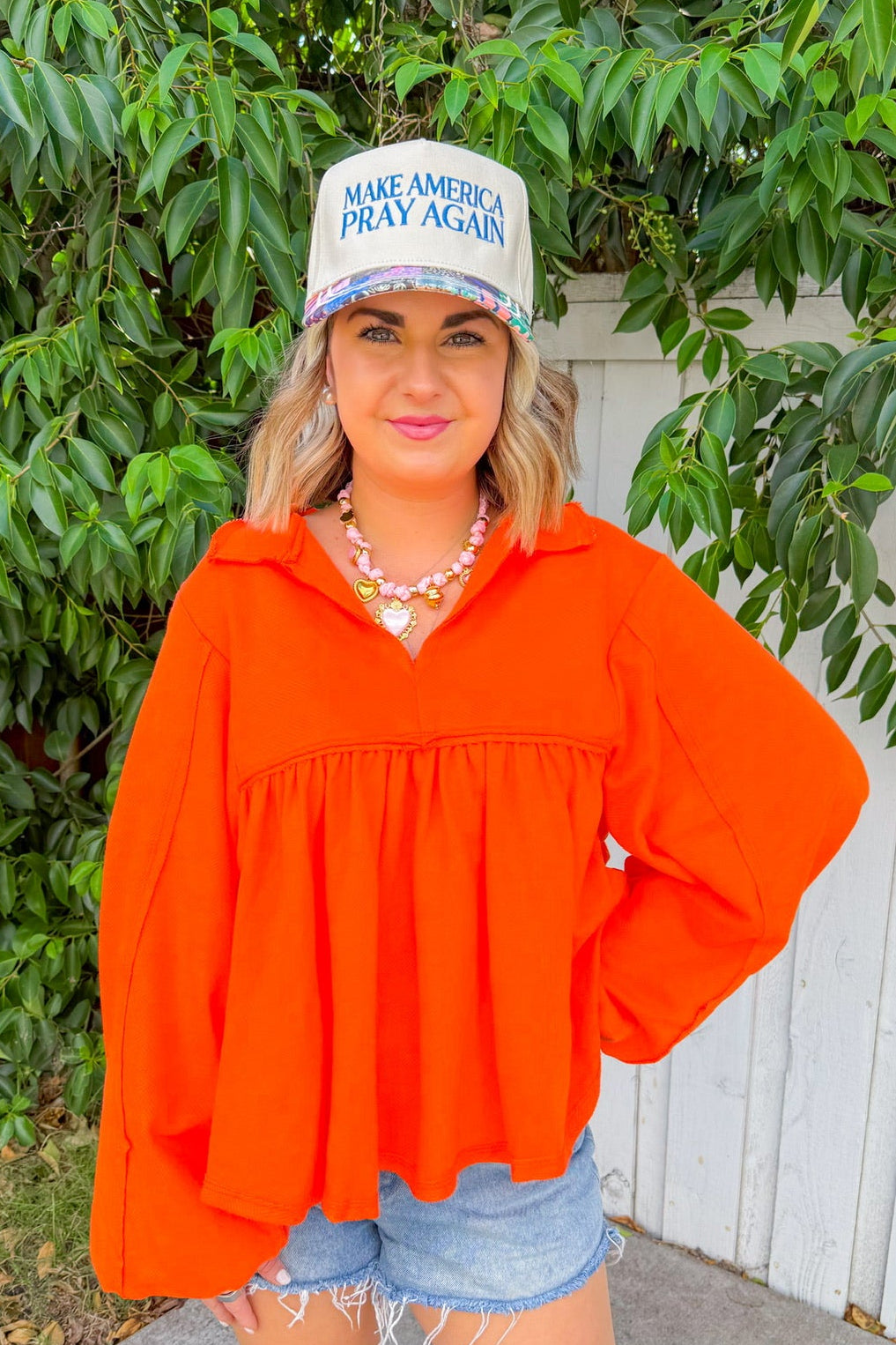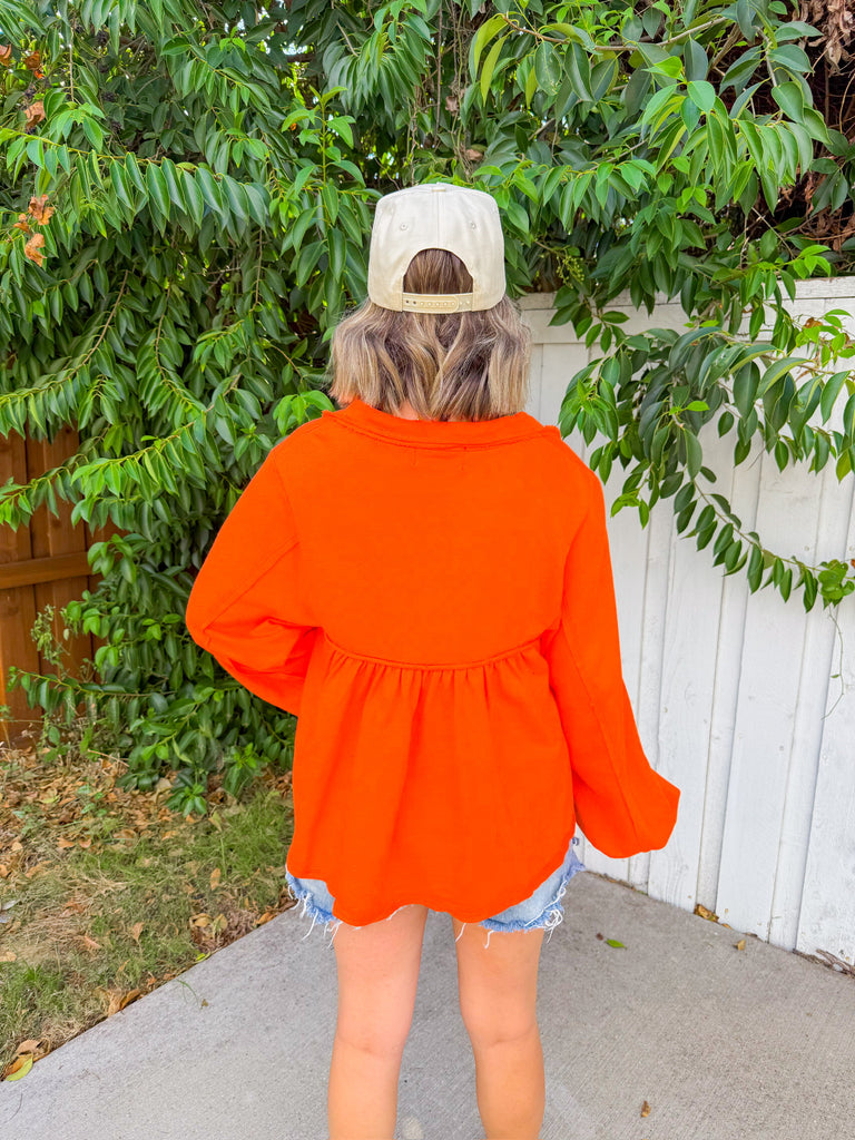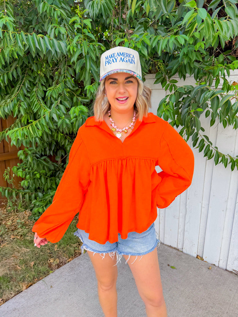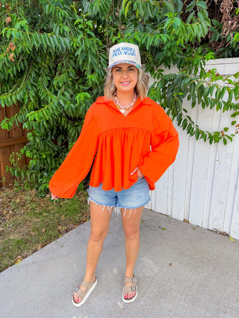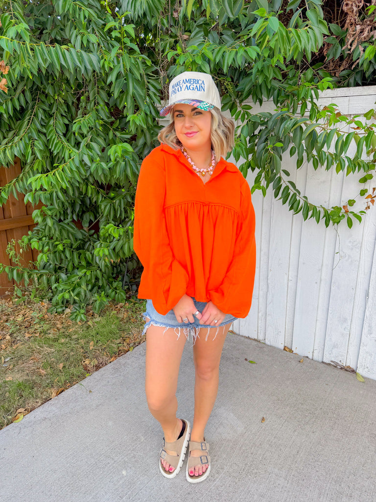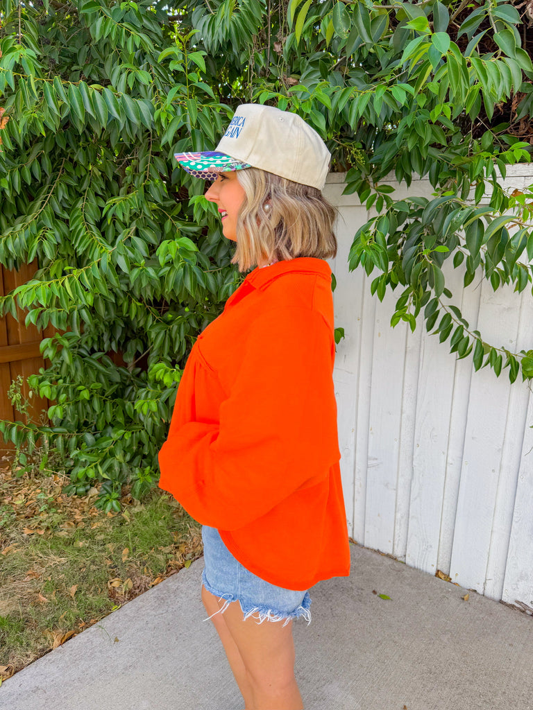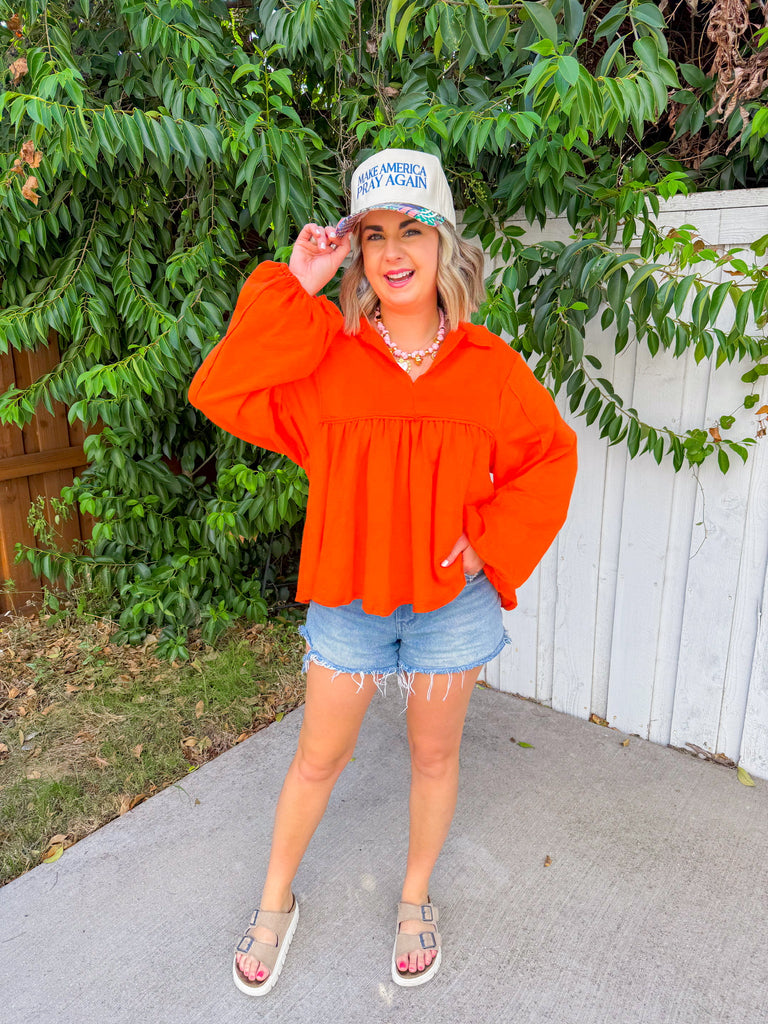 Add a pop of bold, playful color to your wardrobe with the All Or Nothing Top in vibrant orange. Its bright hue and relaxed silhouette invite you to embrace fun and freedom in every wear.