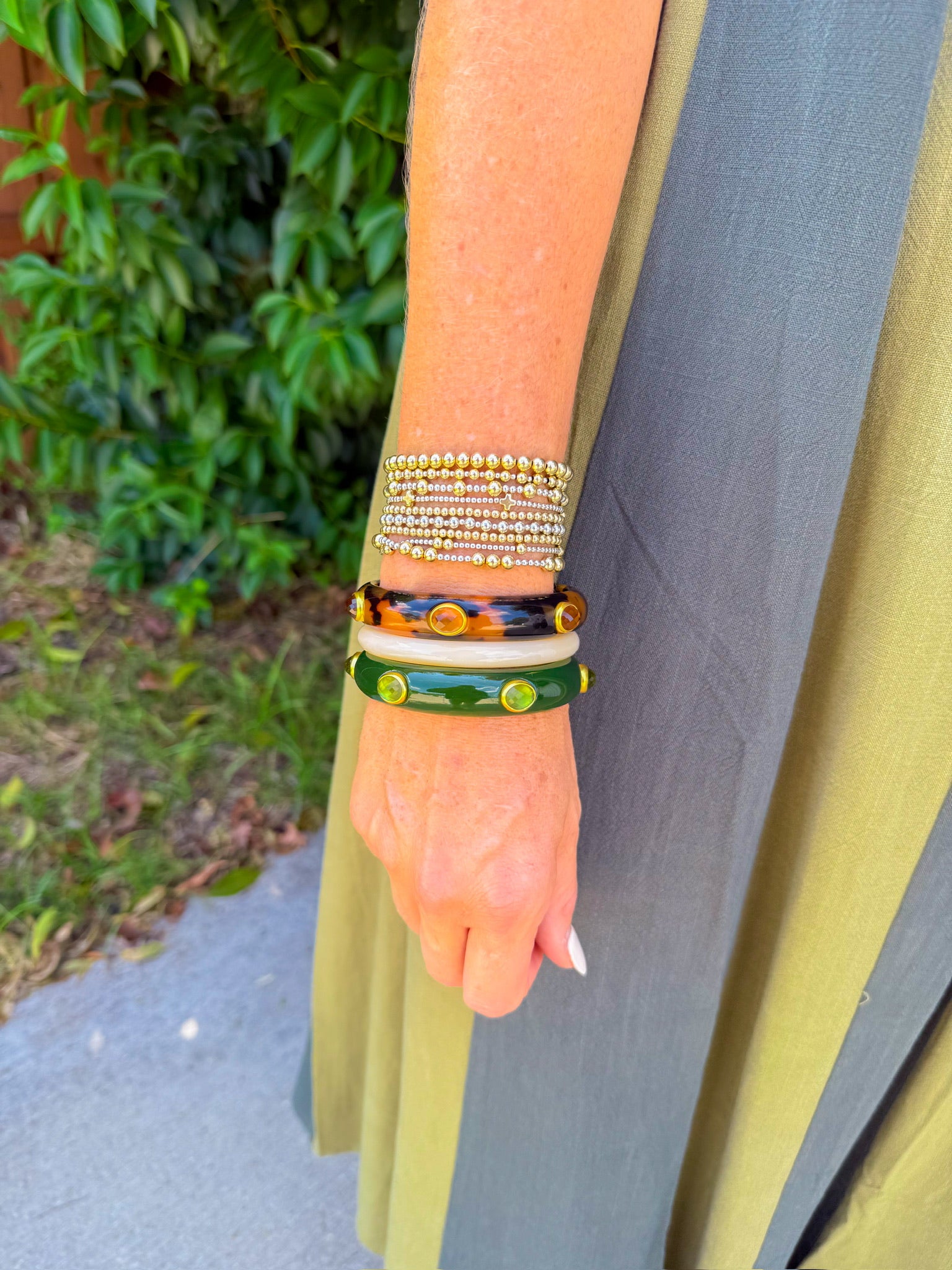 The Amber Canopy Maxi Dress – Green features bold vertical stripes in earthy olive and deep green tones with a sleeveless, flowy silhouette.