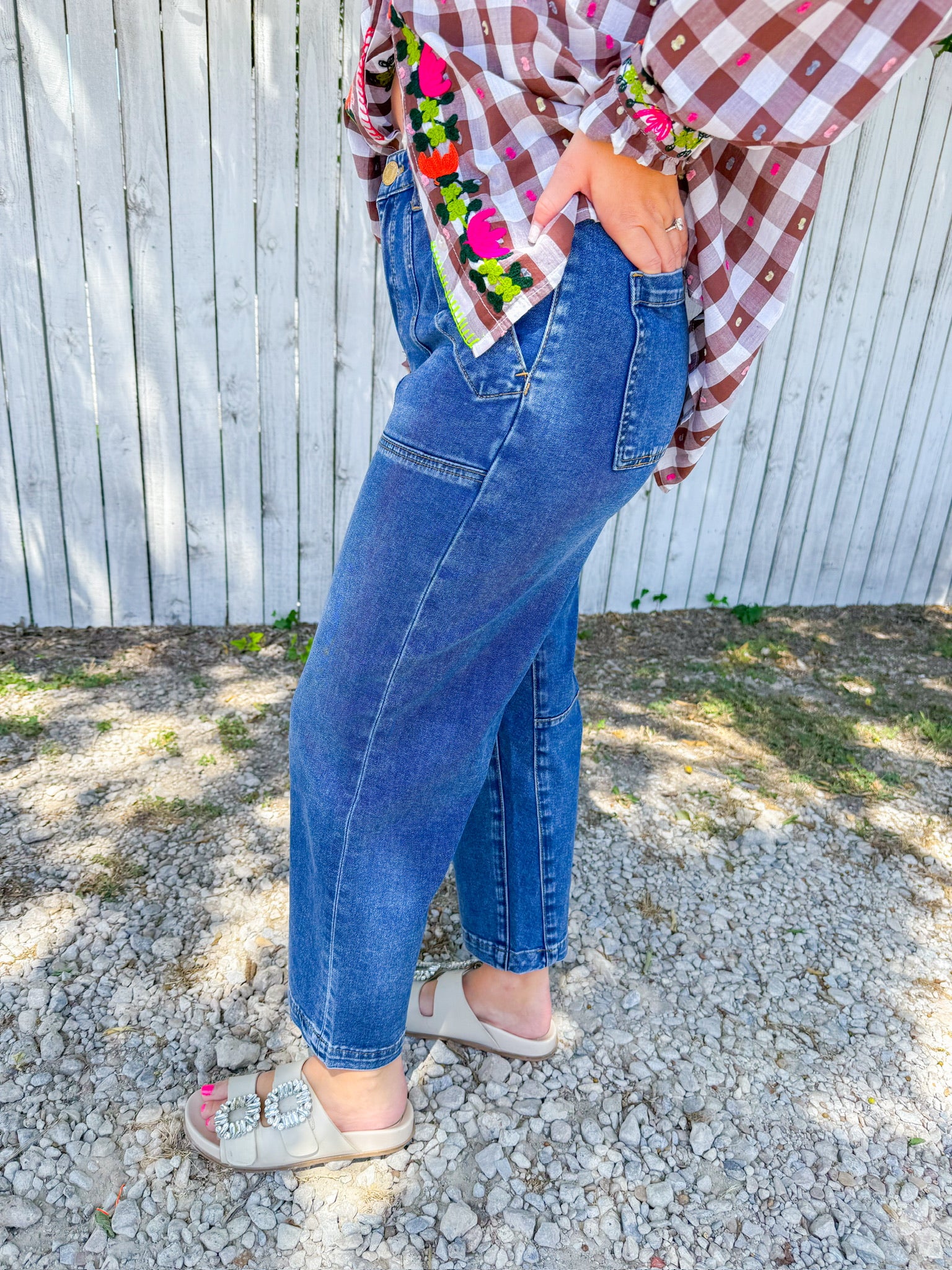 Elevate your denim game with our wide leg barrel pant in a versatile medium wash. Designed for a modern silhouette, these pants feature a flattering barrel leg shape that offers both comfort and style. The clean hem adds a refined finish.