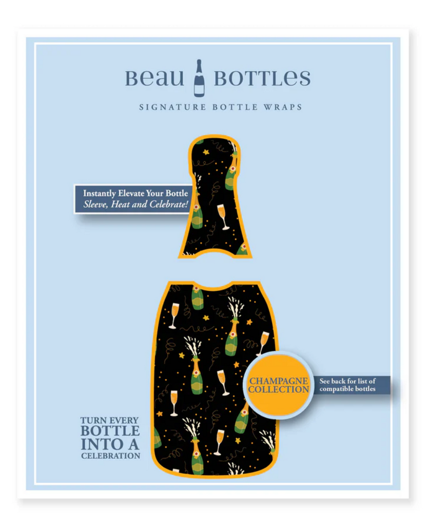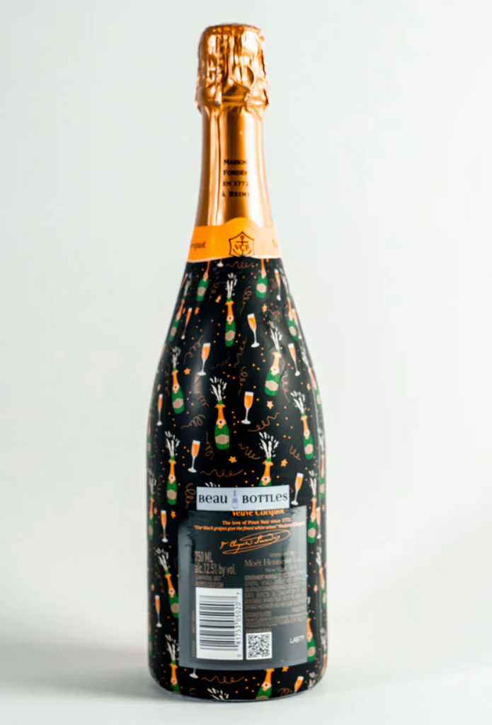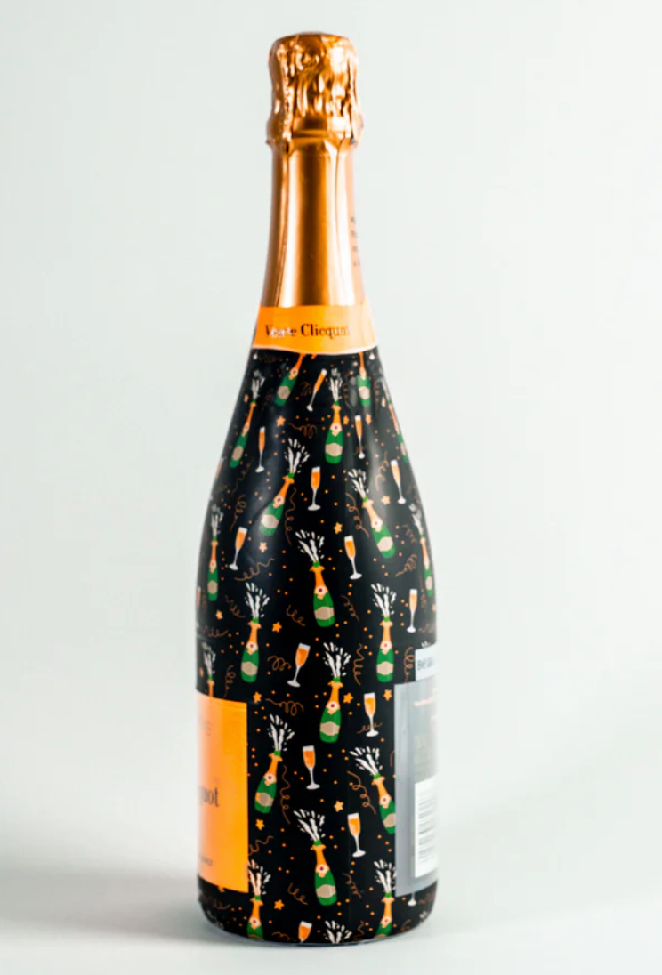 Transform your champagne bottle into an eye catching masterpiece with Beau Bottles wraps! Whether gifting or celebrating, this elegant wrap seamlessly blends with the bottle, adding a touch of sophistication to any occasion. Simply slip the wrap over the specified bottle, use a hairdryer to shrink the wrap into place, and enjoy a smooth professional finish! Designed specifically for Veuve, it turns an ordinary bottle into an extraordinary statement piece!