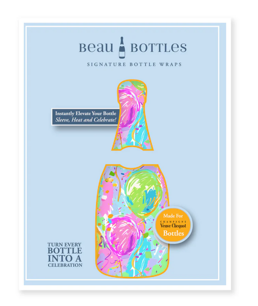 Transform your champagne bottle into an eye catching masterpiece with Beau Bottles wraps! Whether gifting or celebrating, this elegant wrap seamlessly blends with the bottle, adding a touch of sophistication to any occasion. Simply slip the wrap over the specified bottle, use a hairdryer to shrink the wrap into place, and enjoy a smooth professional finish! Designed specifically for Veuve, it turns an ordinary bottle into an extraordinary statement piece!