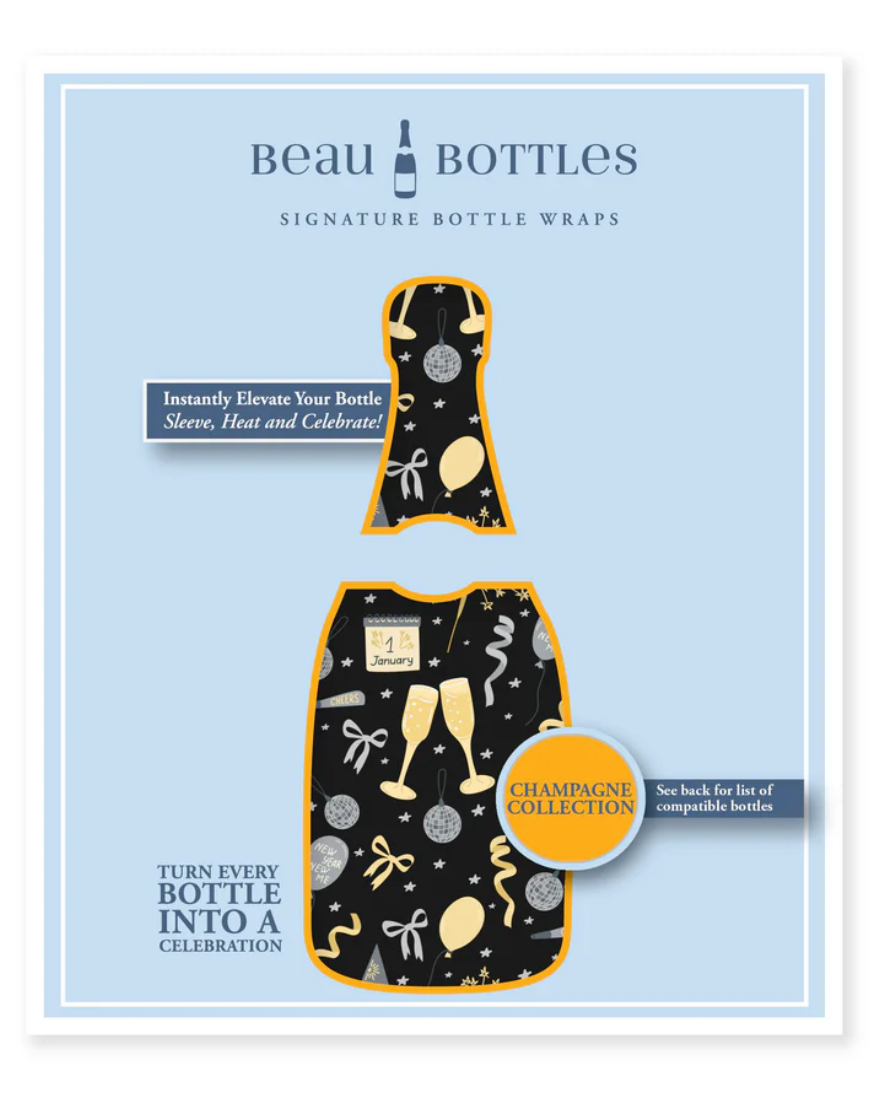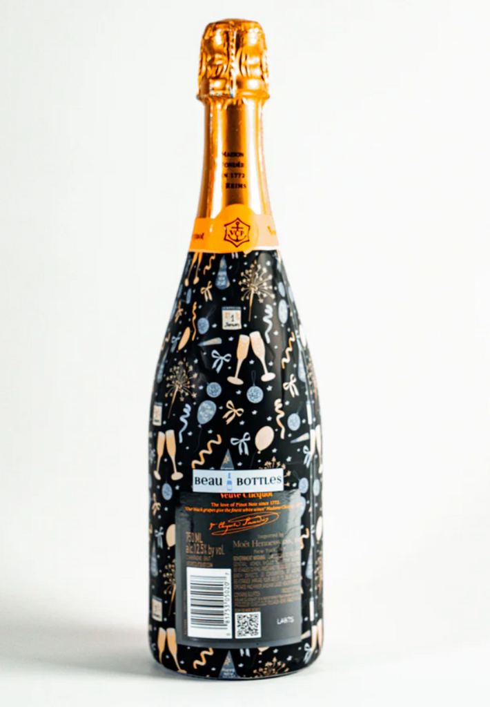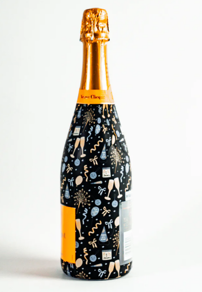 Transform your champagne bottle into an eye catching masterpiece with Beau Bottles wraps! Whether gifting or celebrating, this elegant wrap seamlessly blends with the bottle, adding a touch of sophistication to any occasion. Simply slip the wrap over the specified bottle, use a hairdryer to shrink the wrap into place, and enjoy a smooth professional finish! Designed specifically for Veuve, it turns an ordinary bottle into an extraordinary statement piece!