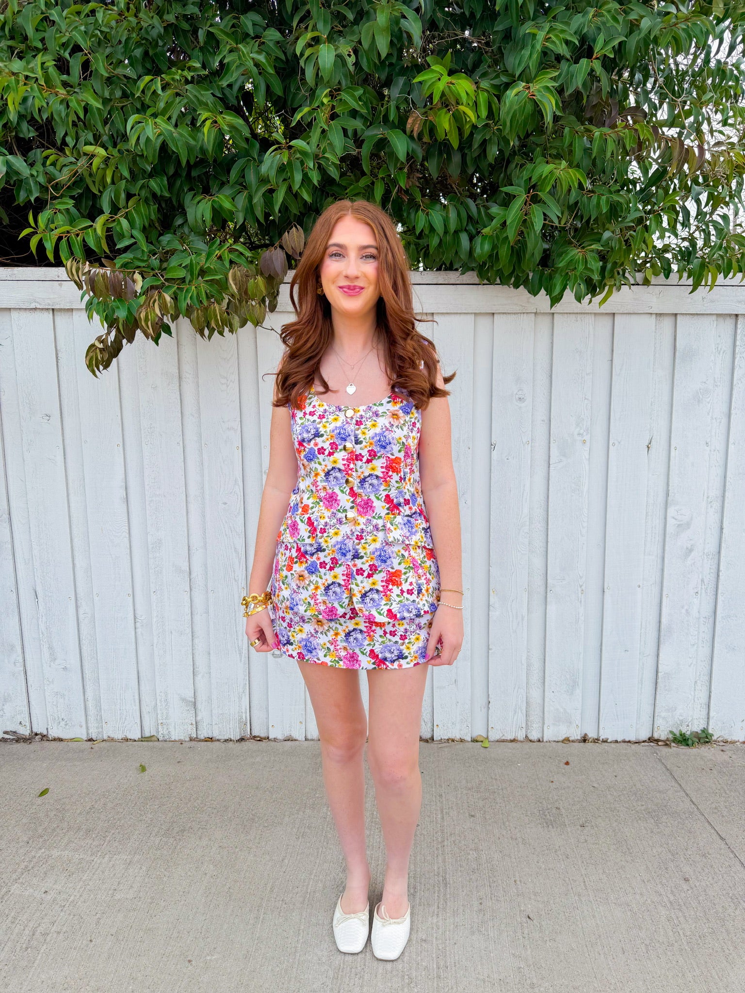 Vibrant floral print brings personality to crisp denim, while front button closure makes dressing easy and breezy.
