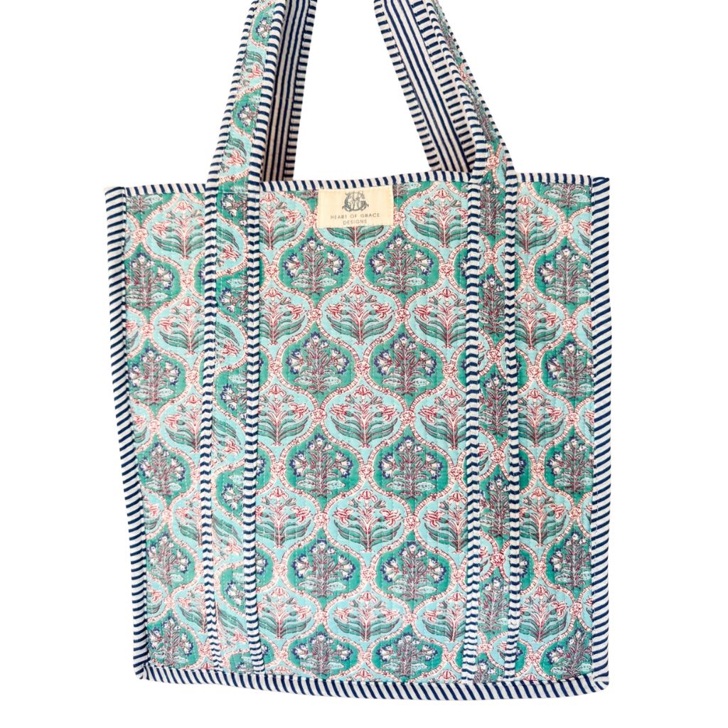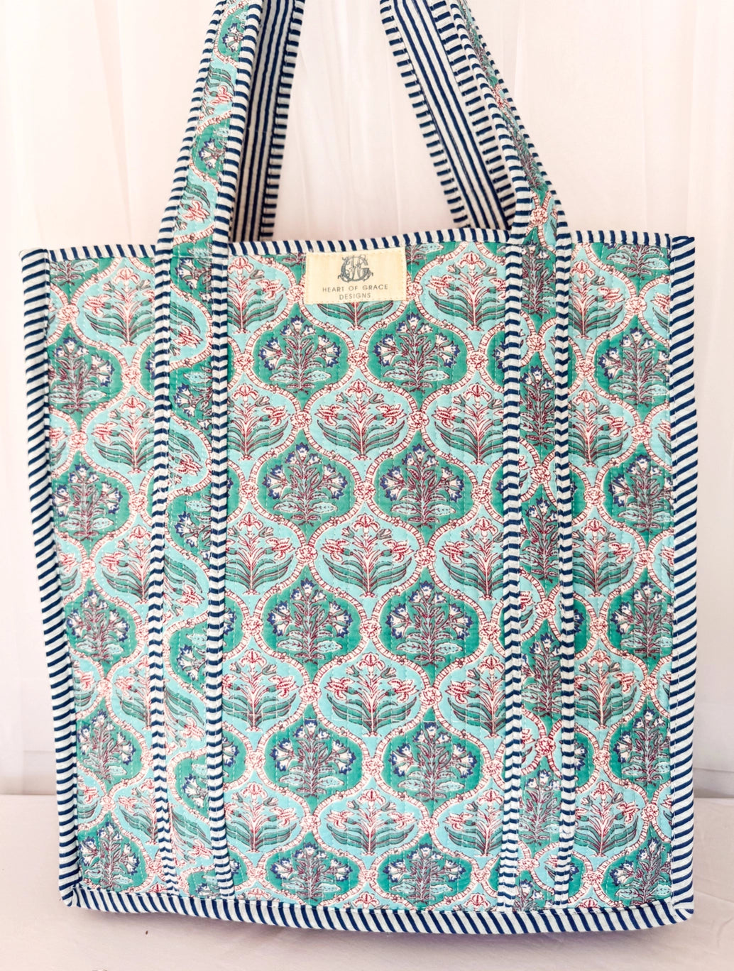 Our Heart of Grace Quilted Tote Collection will be a new customer favorite! These are hand quilted and crafted in India using block printing. Bag measurements: 16” x 15” No zipper Includes an Inside pocket for phones, etc. Each piece is hand crafted and block printed by artisans, making it truly one of a kind and filled with timeless charm. The block printing process may have variations in color, printing, and fabric as part of the handmade process which is what makes each product unique.