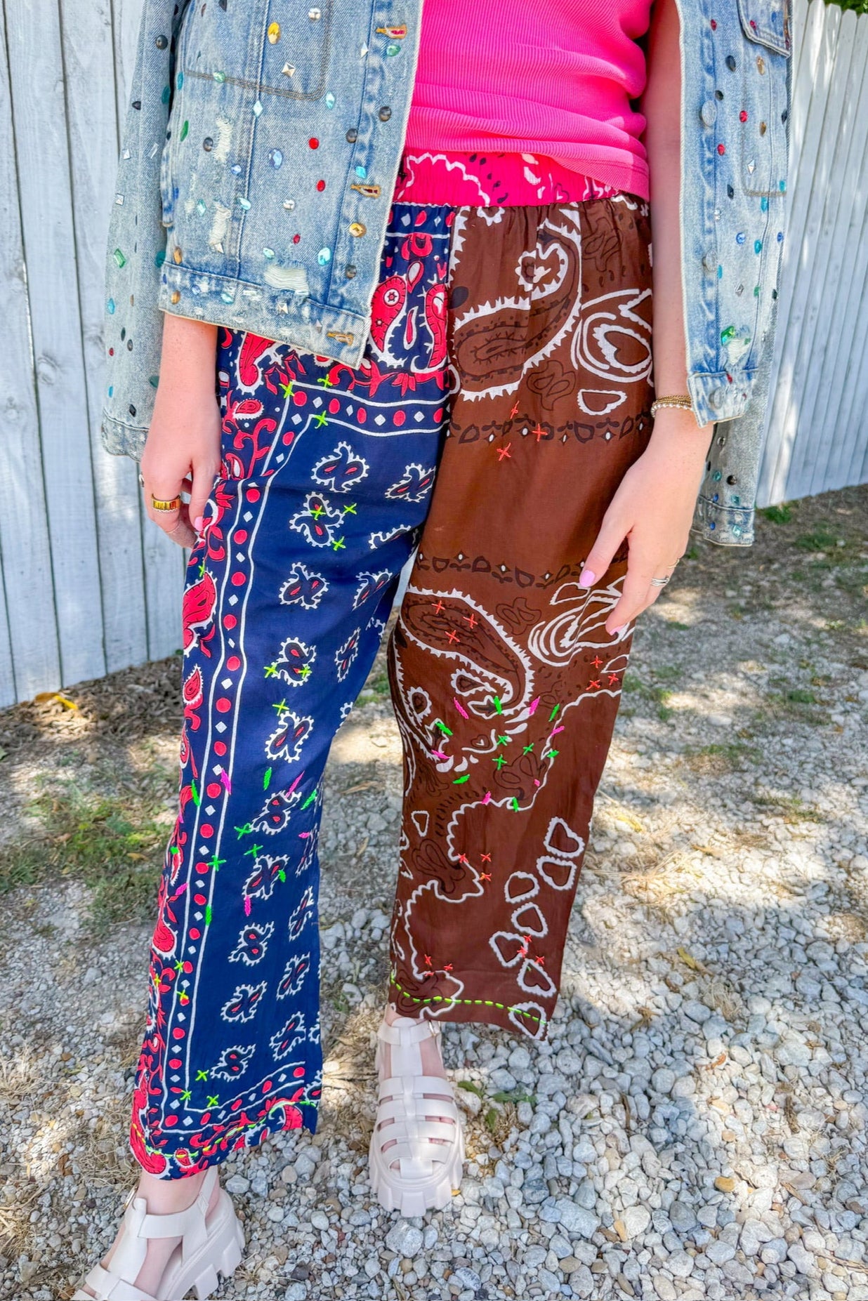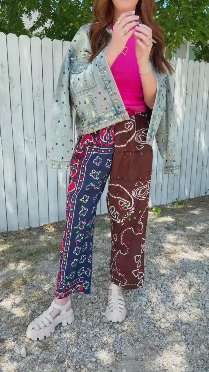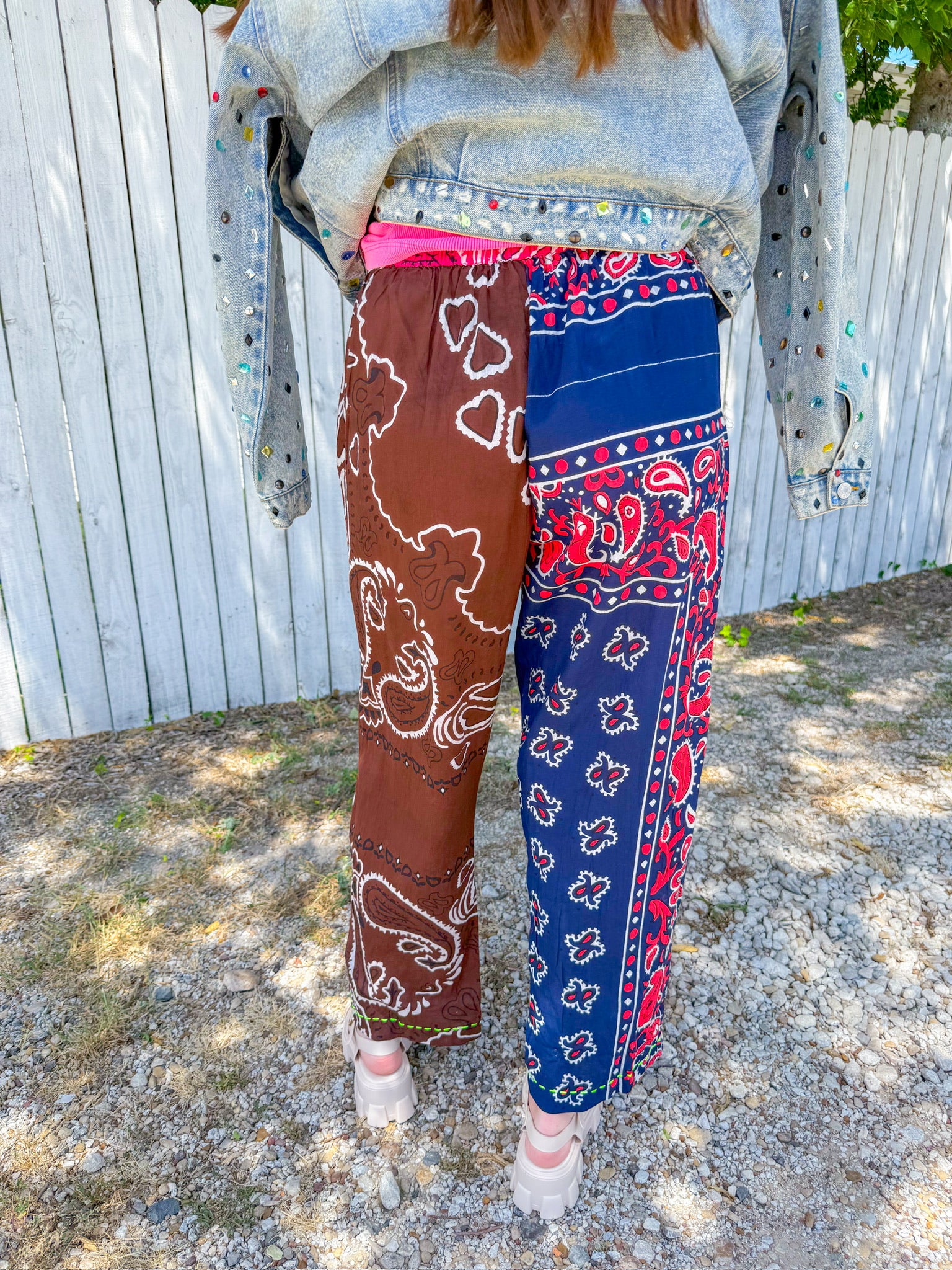 Bandana print meets bold color blocking in these playful statement pants, featuring one leg in vibrant navy and red and the other in a chocolatey brown with embroidered hearts and pops of neon.