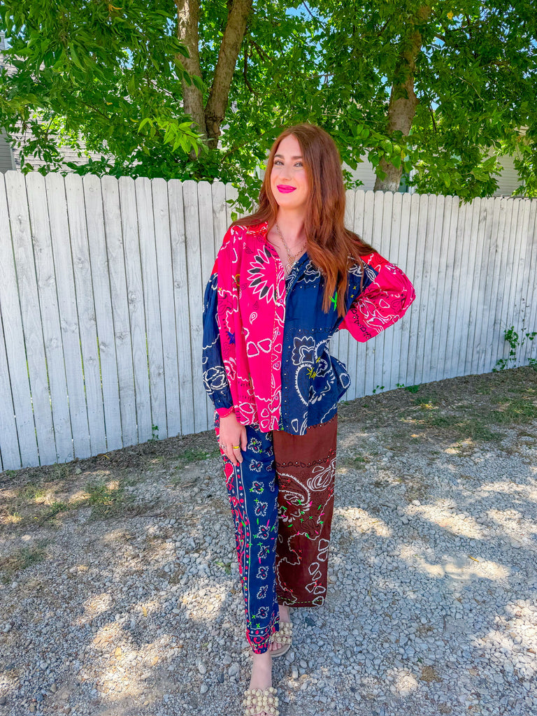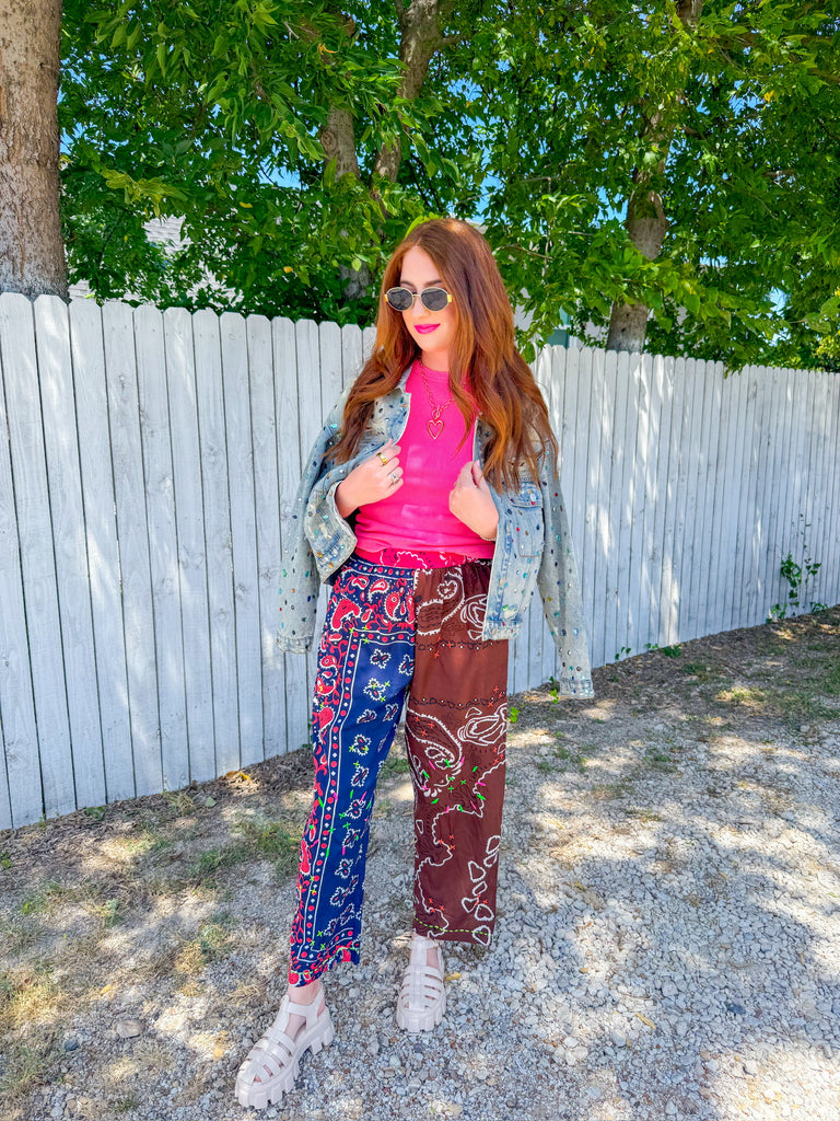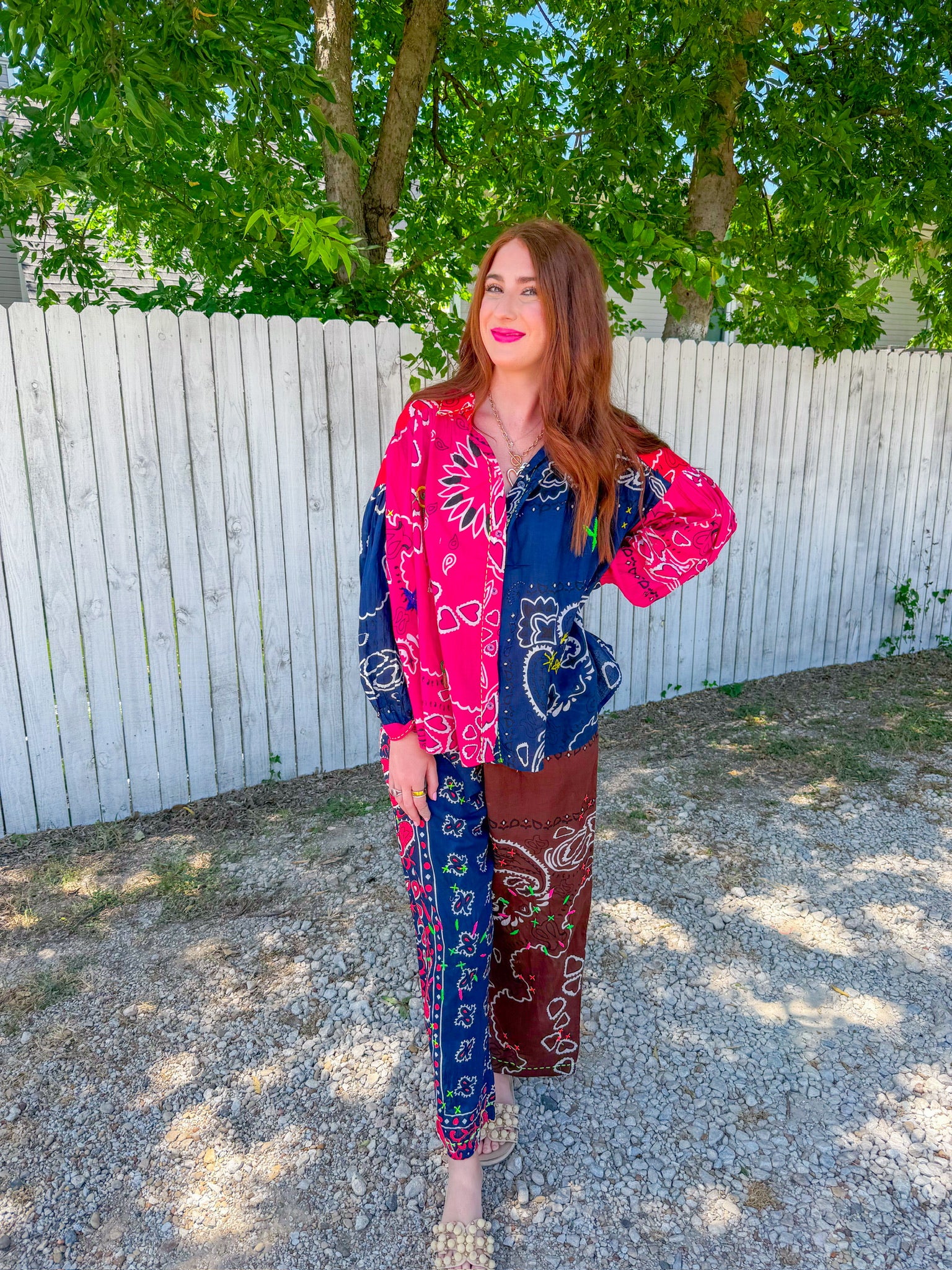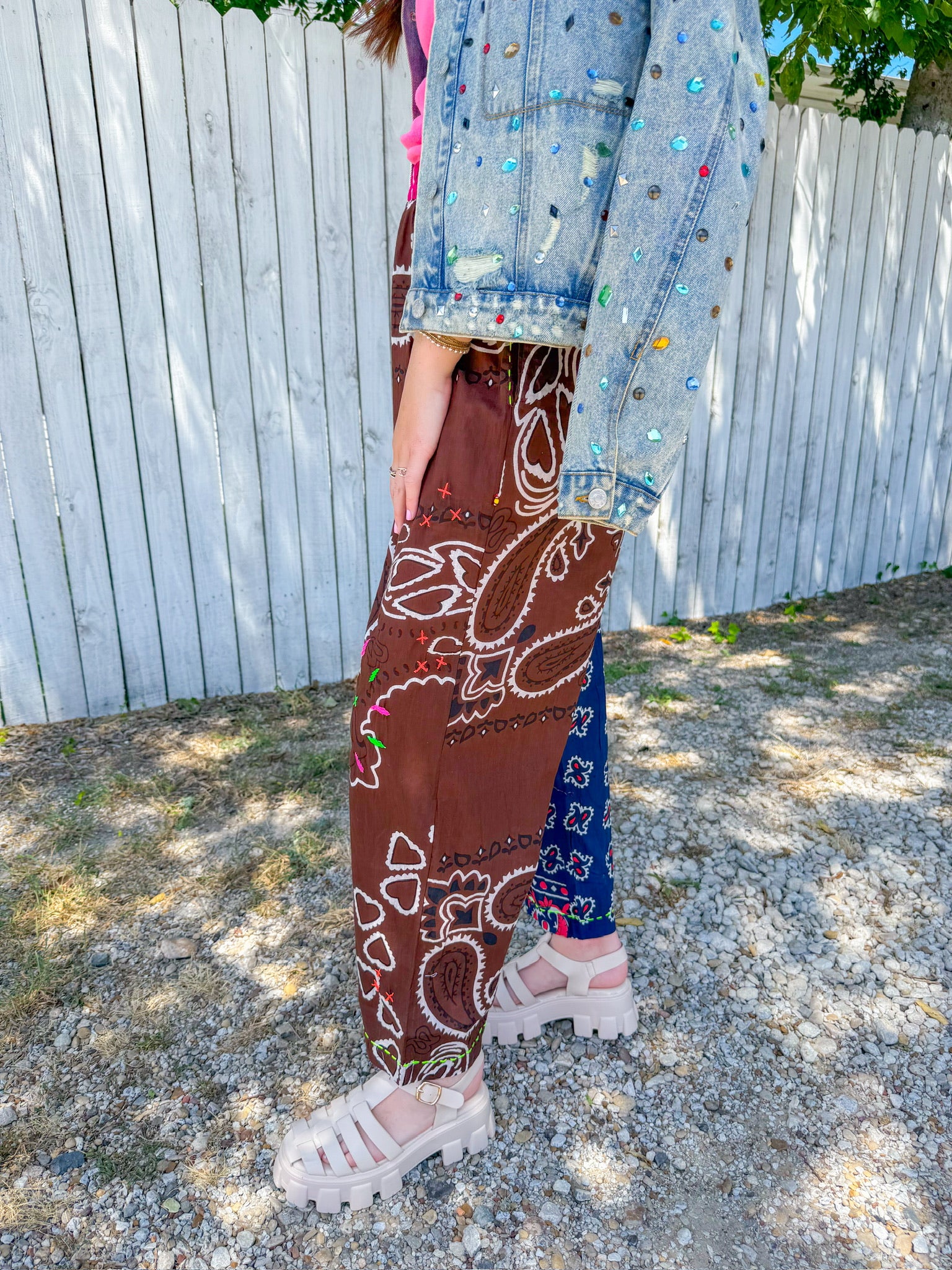 Bandana print meets bold color blocking in these playful statement pants, featuring one leg in vibrant navy and red and the other in a chocolatey brown with embroidered hearts and pops of neon.