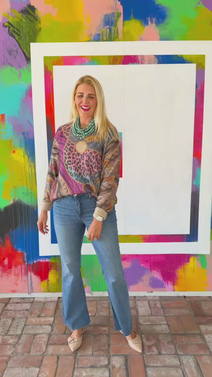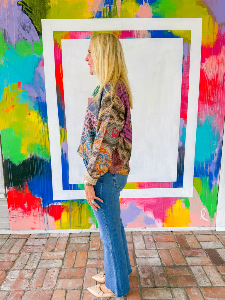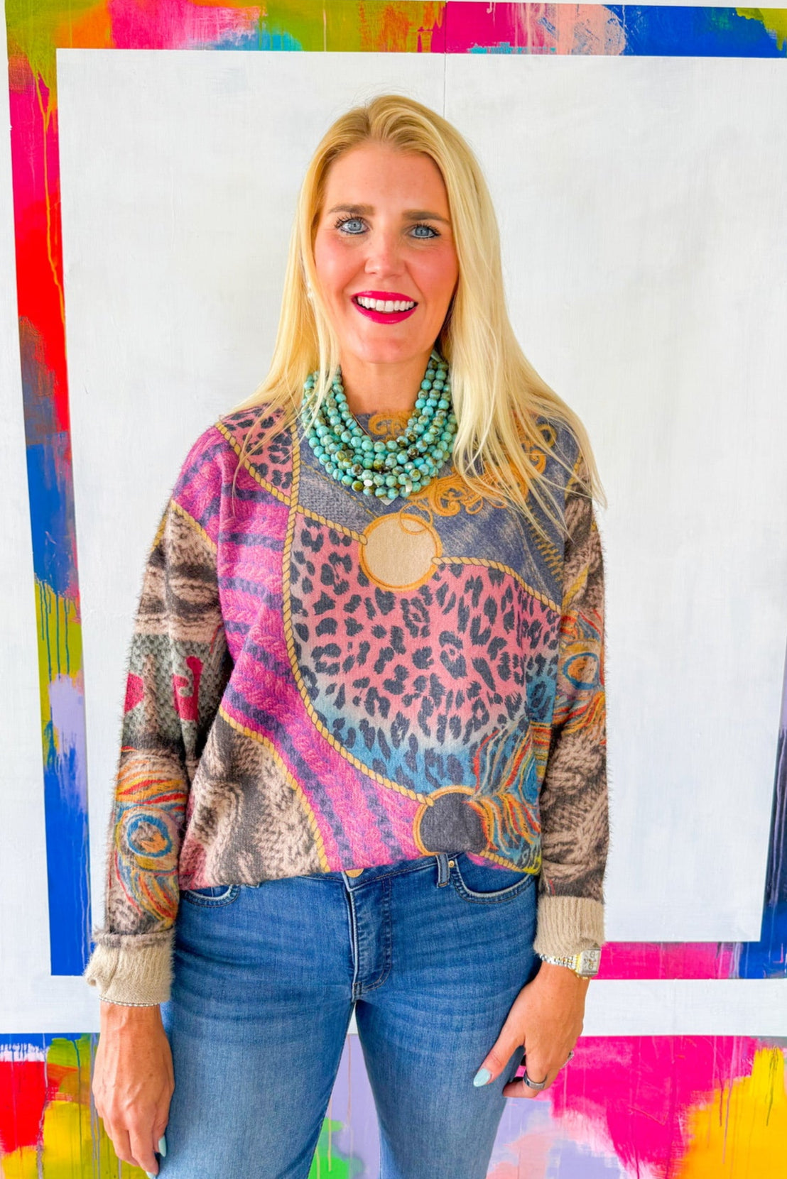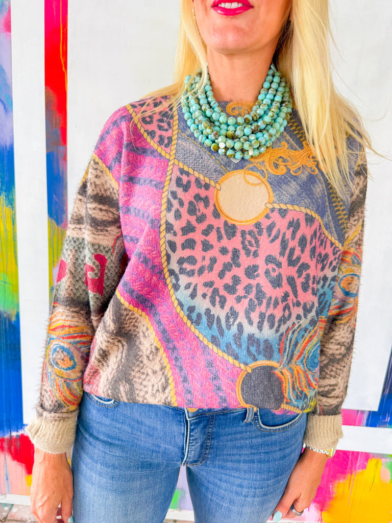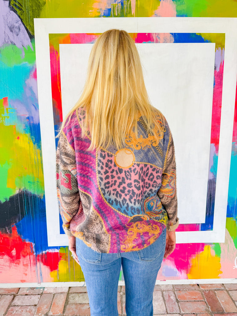 It’s basically your personality in sweater form—bold, fun, and a little unpredictable. Throw it on with jeans for a casual pop or wear it over a slip dress for an artsy layered moment.