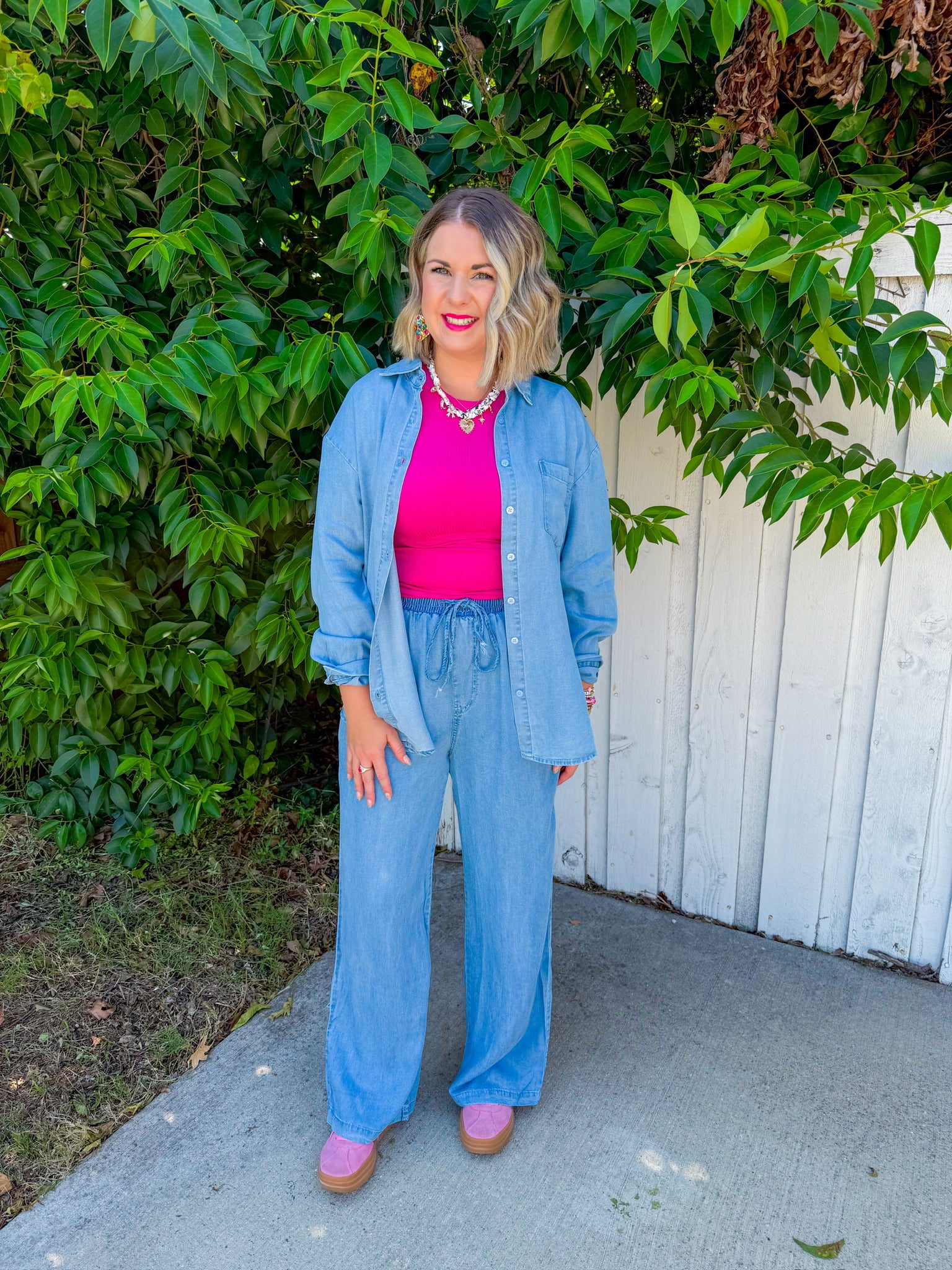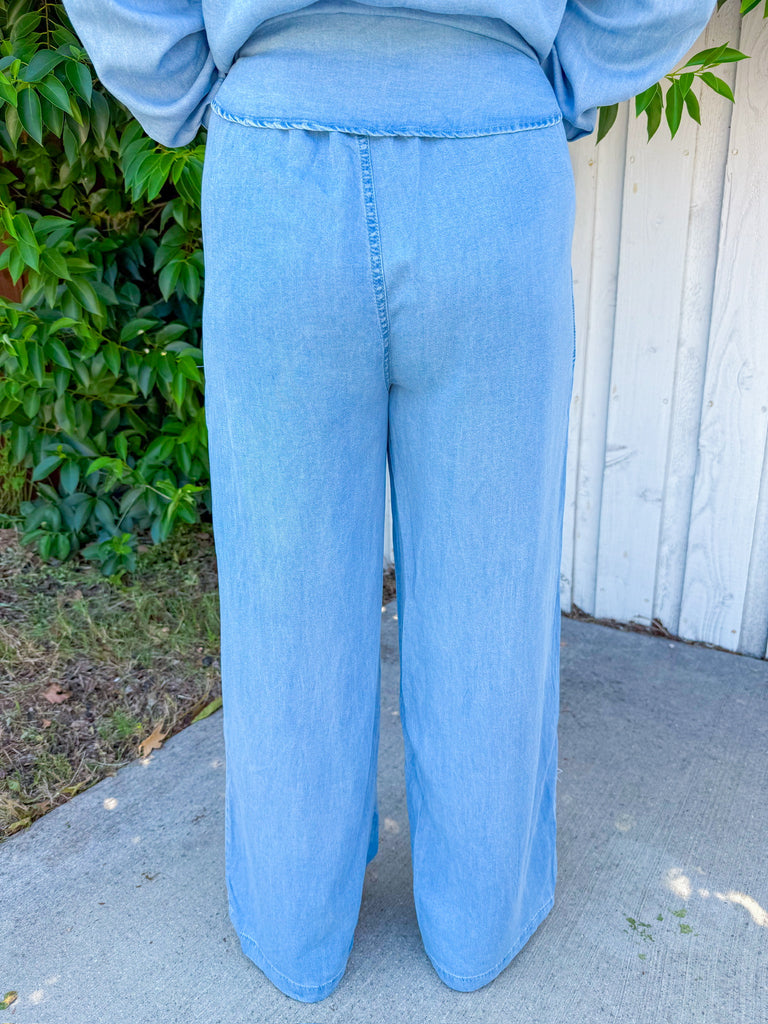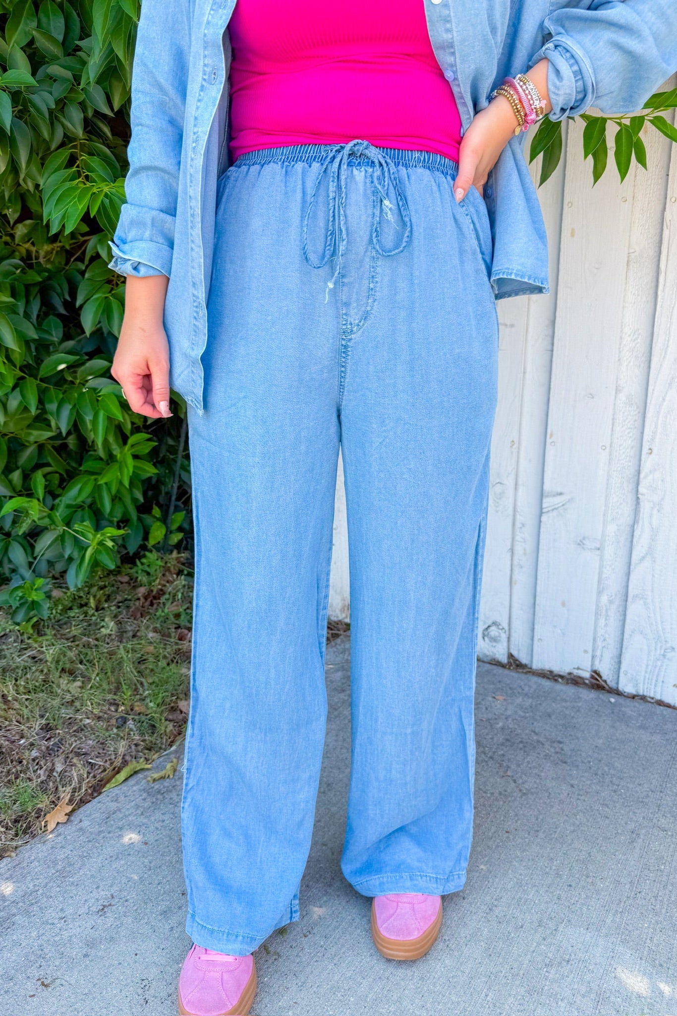 Slip into the Bonjour Blue Pants—a pair of flowy denim pants that bring effortless style and comfort to your day.