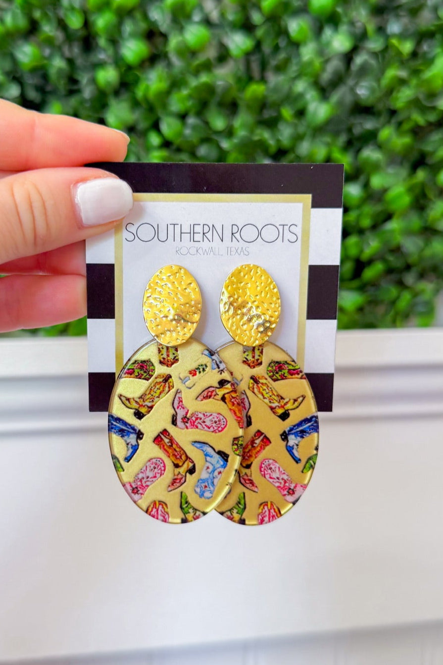 Boot Scoot Earrings in gleaming gold, featuring playful, colorful boots that swing with your every move.