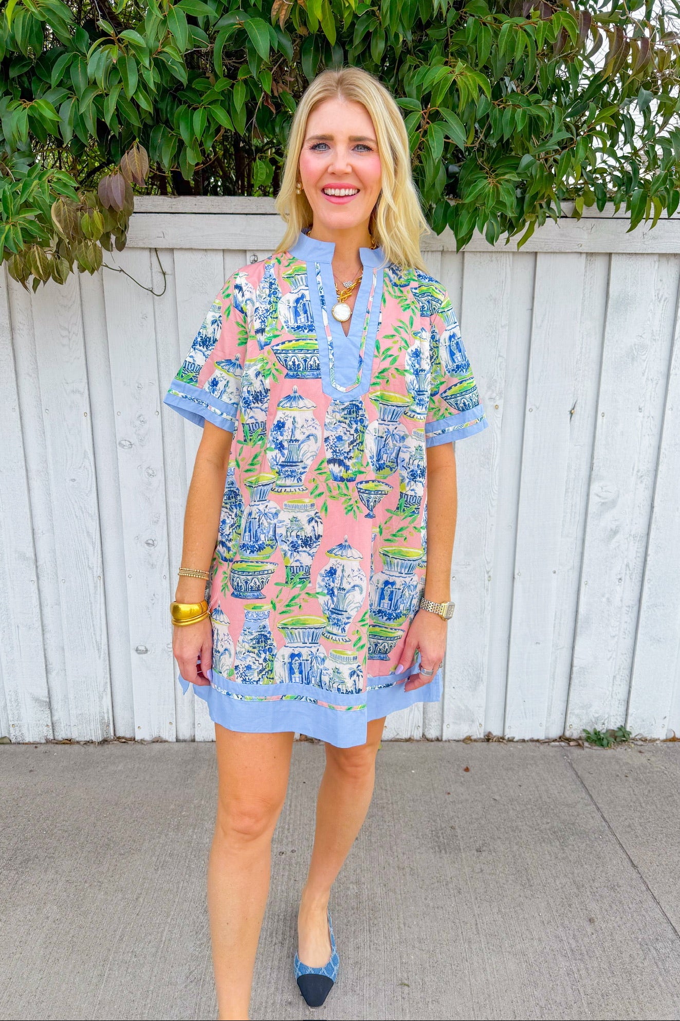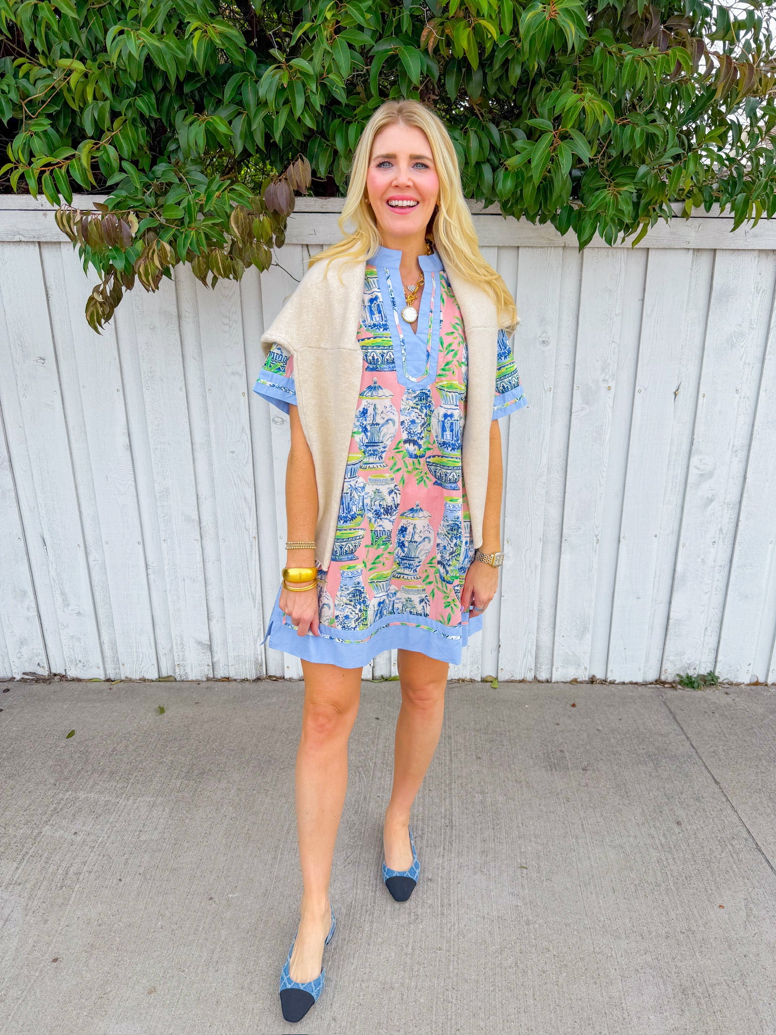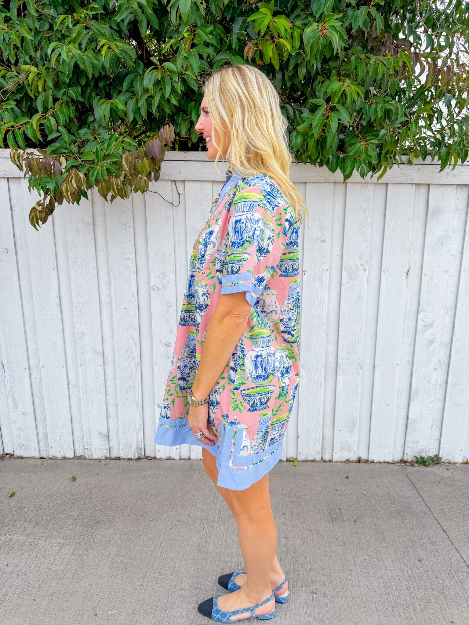 The playful blue botanical print dances across soft fabric, evoking sun-soaked travels and timeless artistry. Perfect for warm-weather adventures, garden parties, or whenever you want to channel effortless style.