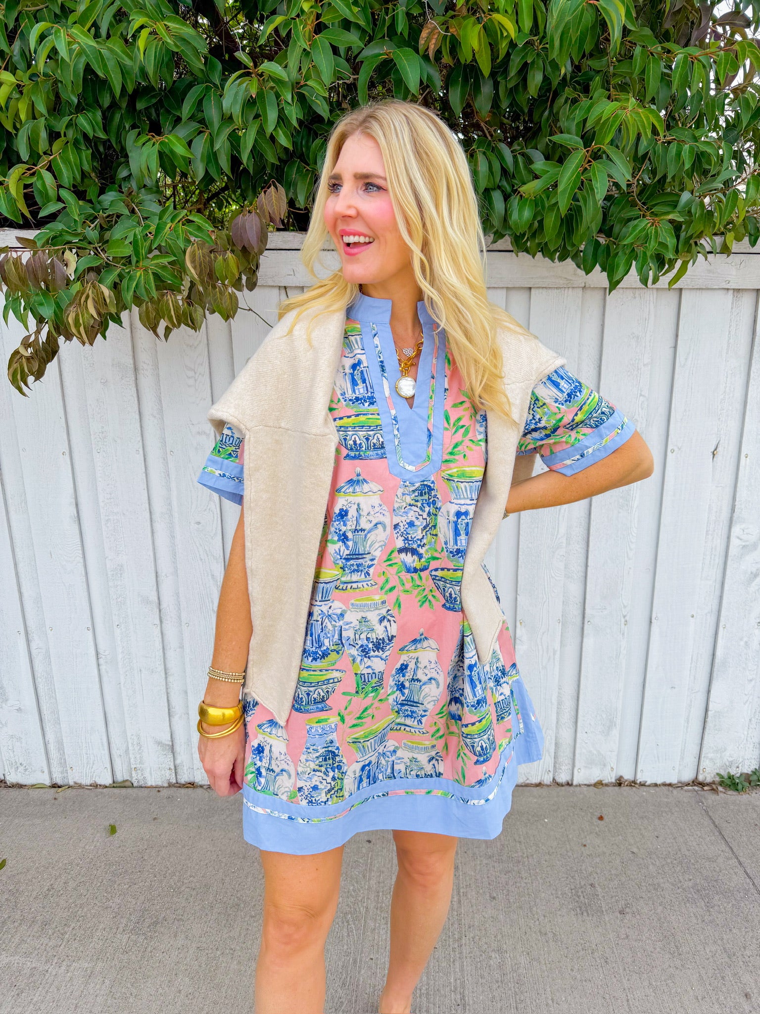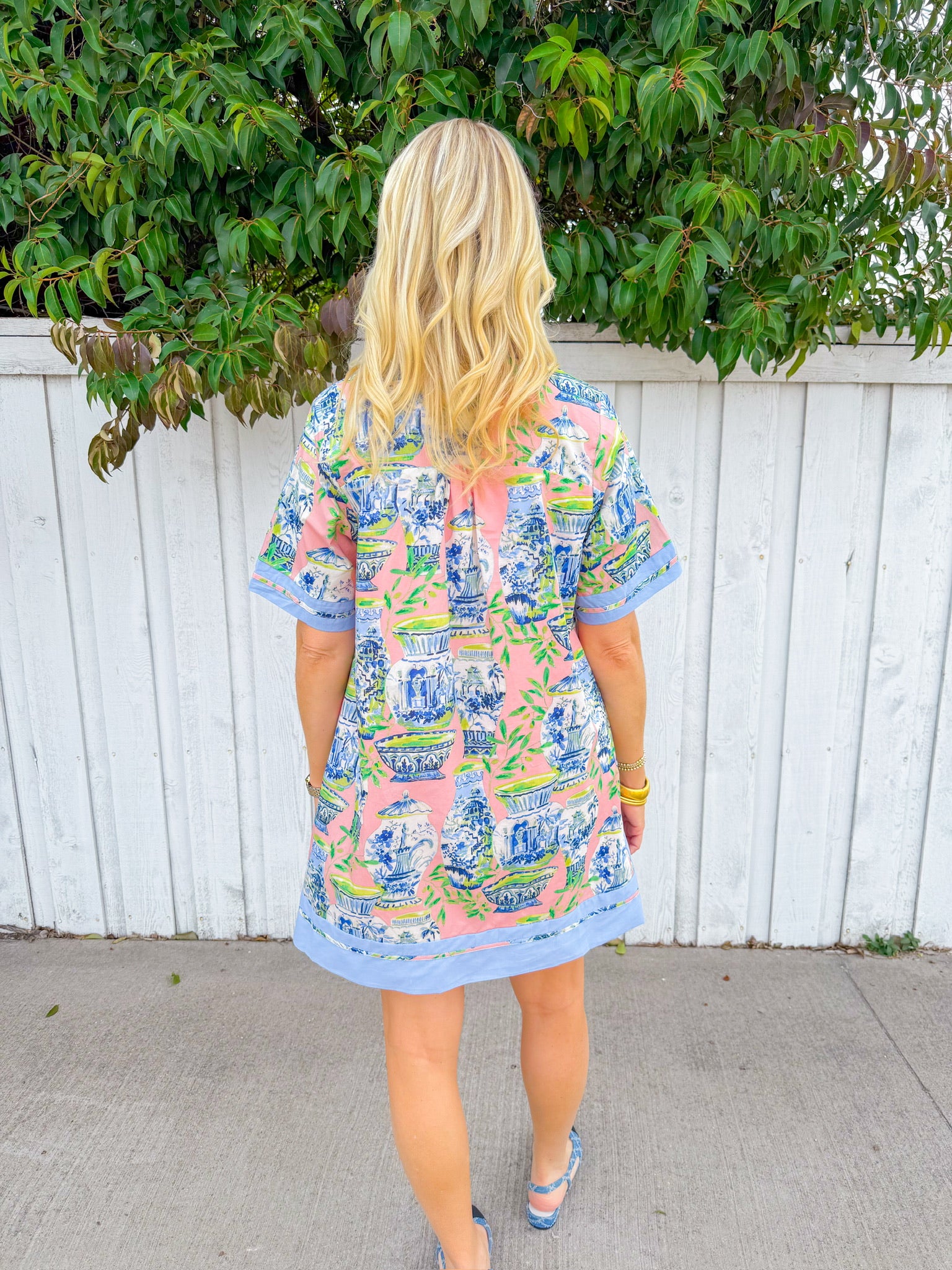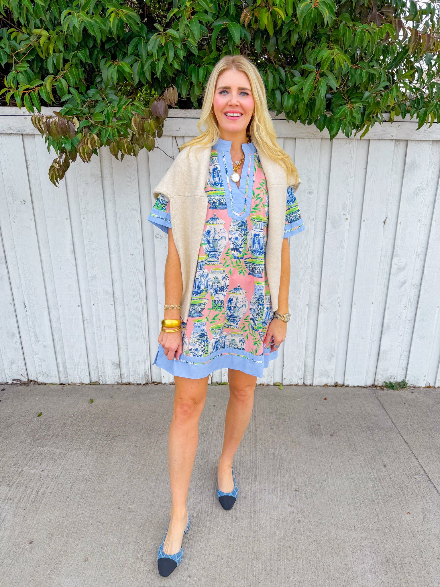 The playful blue botanical print dances across soft fabric, evoking sun-soaked travels and timeless artistry. Perfect for warm-weather adventures, garden parties, or whenever you want to channel effortless style.