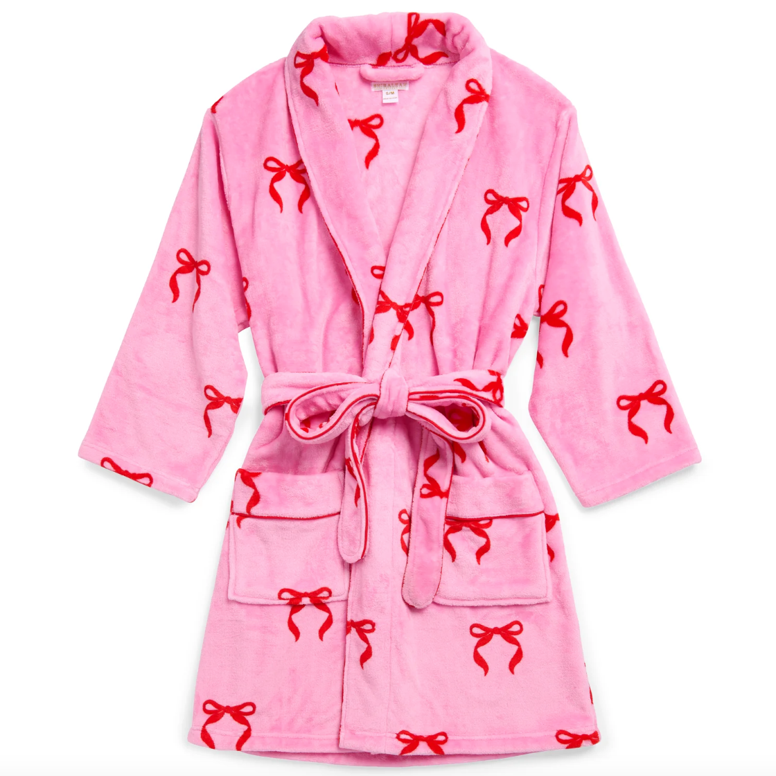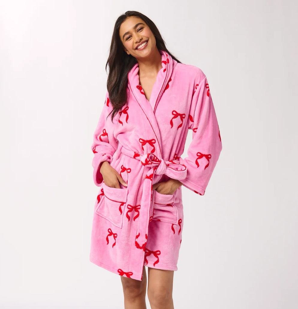 Wrap yourself in playful coziness with our Bow Robe, the perfect piece for lounging in style. Made from super soft fleece, this robe features a dreamy pink hue sprinkled with bright red bow prints for a fun, feminine touch. Complete with a tie belt and roomy front pockets, it’s designed for ultimate comfort and convenience. Whether you’re sipping coffee or opening gifts, this robe brings the cozy vibes all season long.