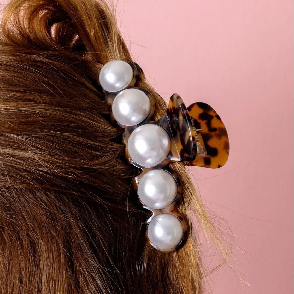 Elevate your outfit with a tortoise + pearl claw clip, in the perfect shade of brown!