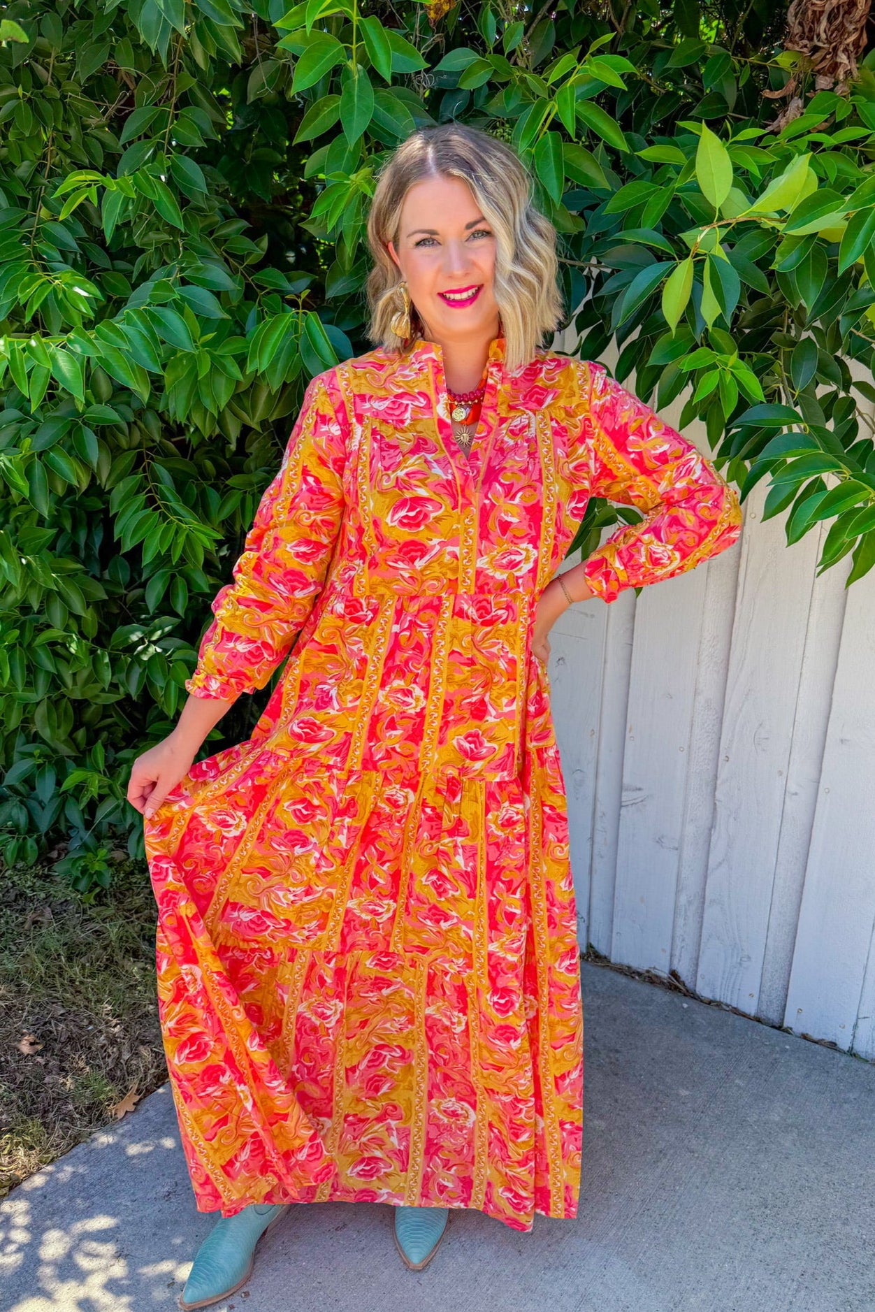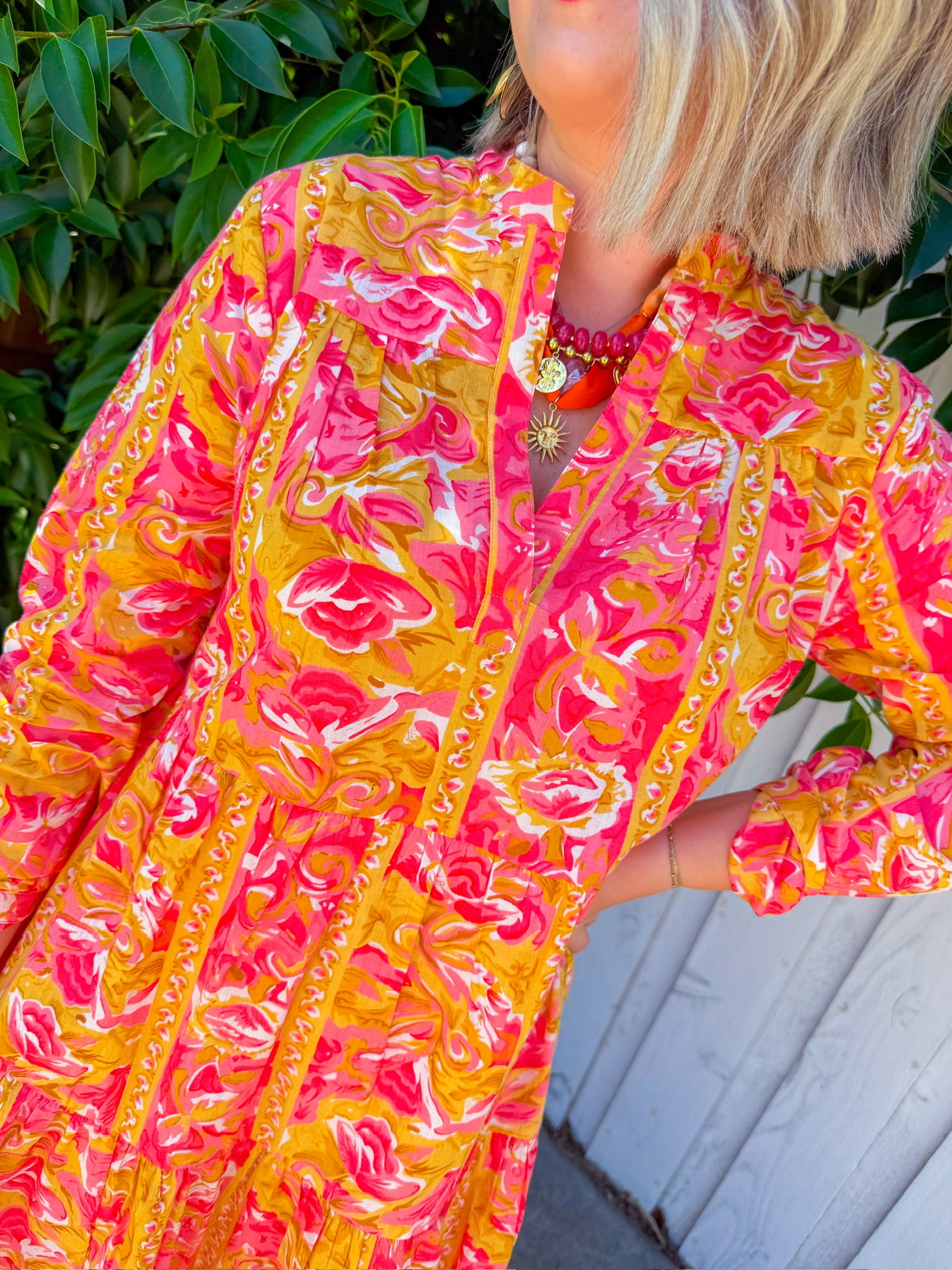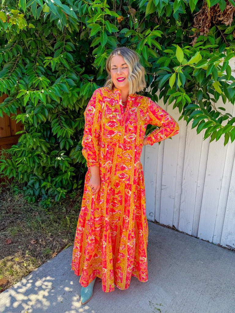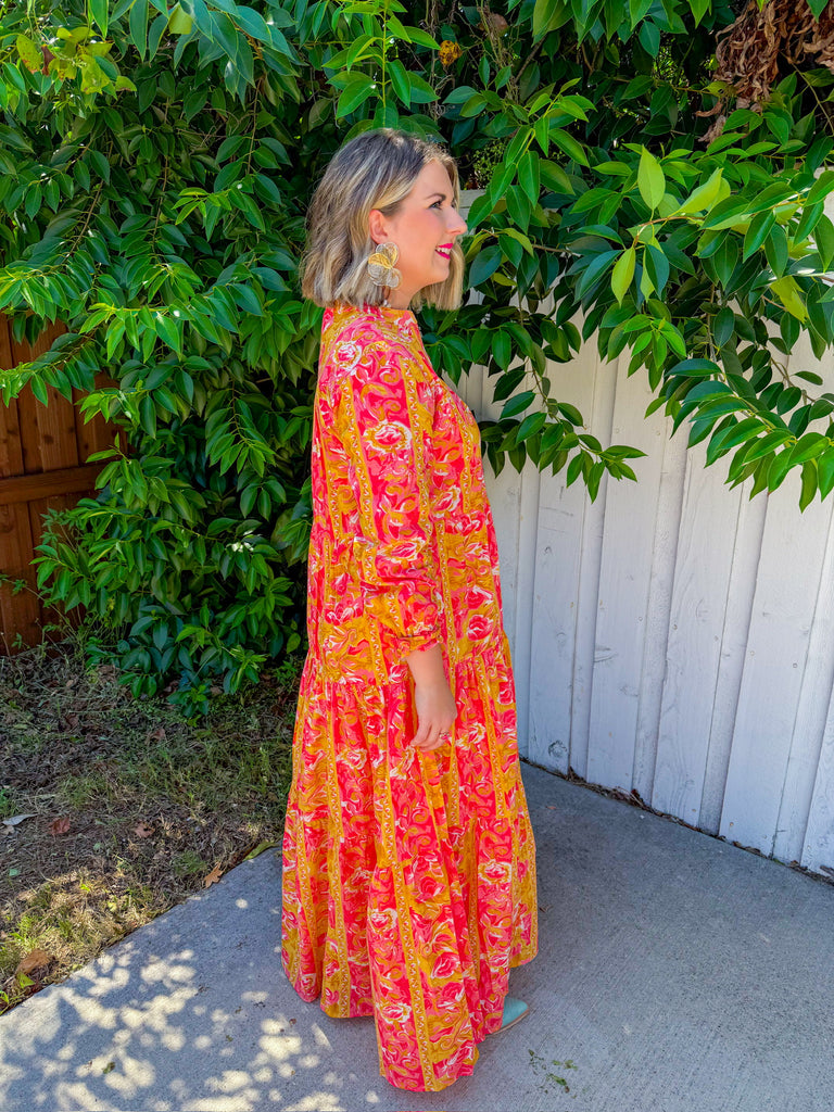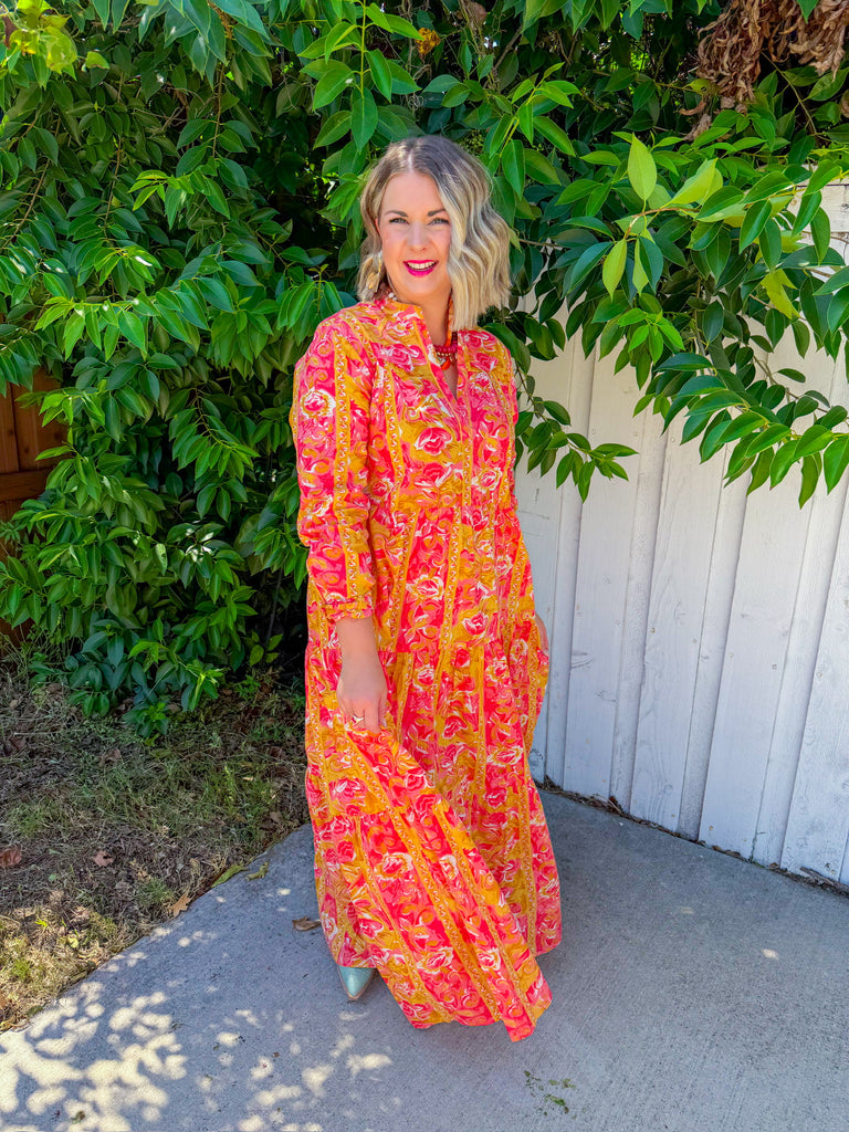 Step into sunshine with the Cafe Chic Maxi Dress in vibrant yellow and playful pink prints. Lightweight and eye-catching, it’s your go-to dress for effortless charm and joyful style.