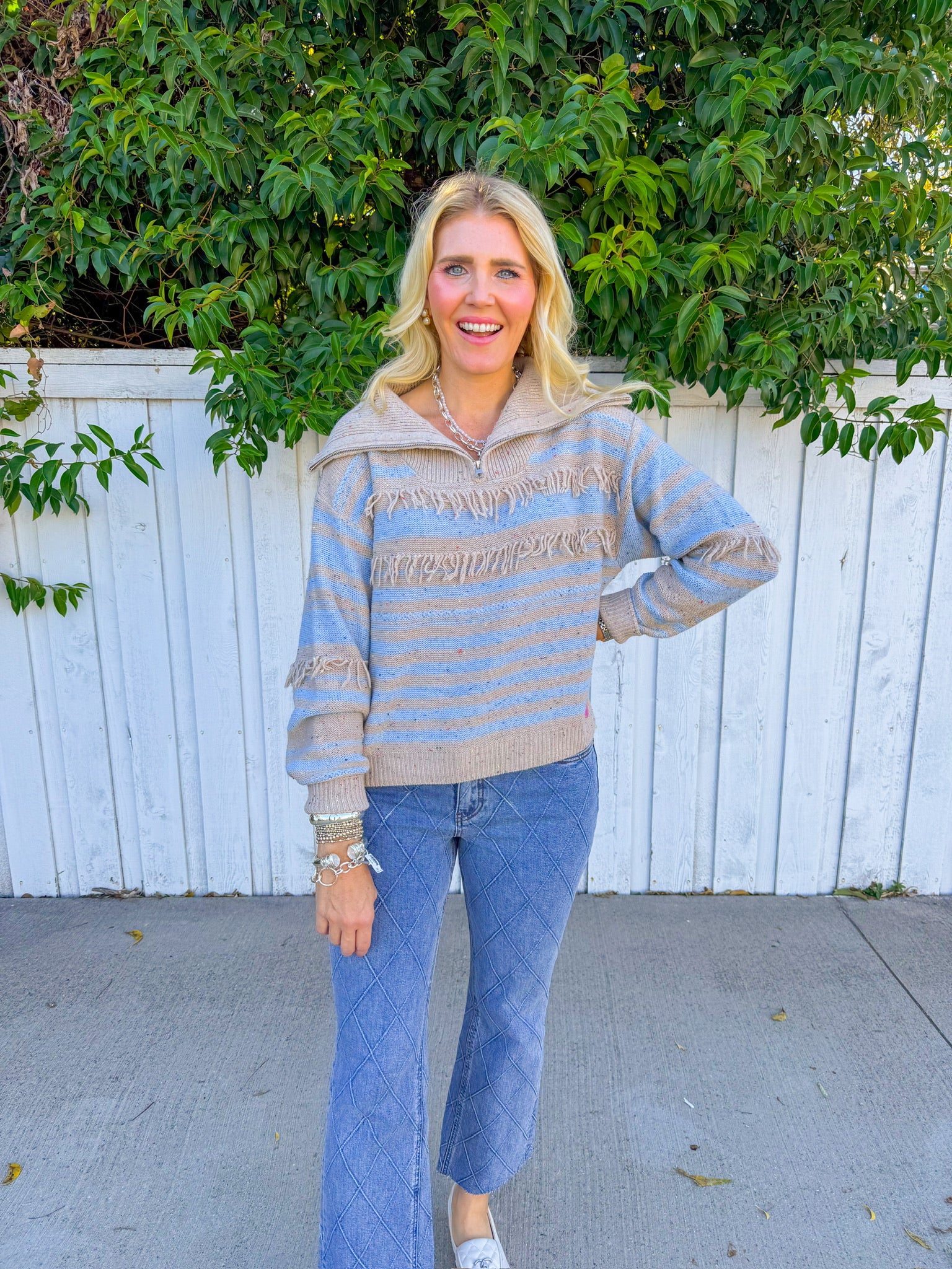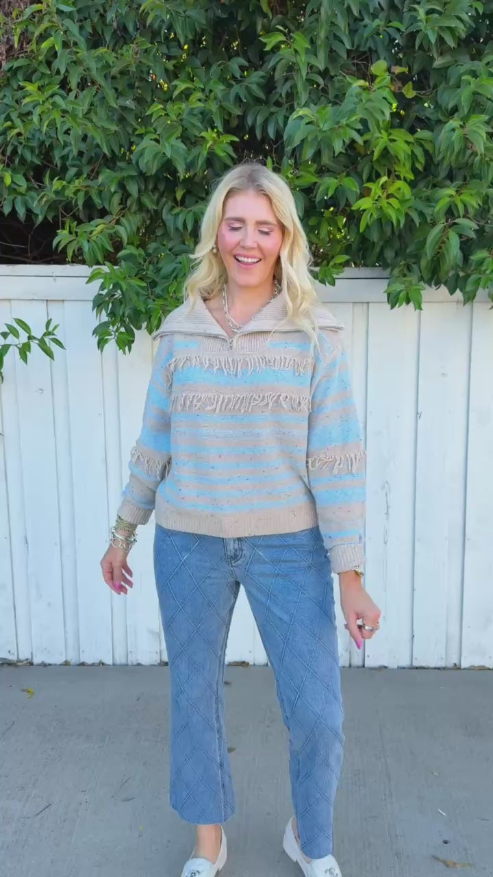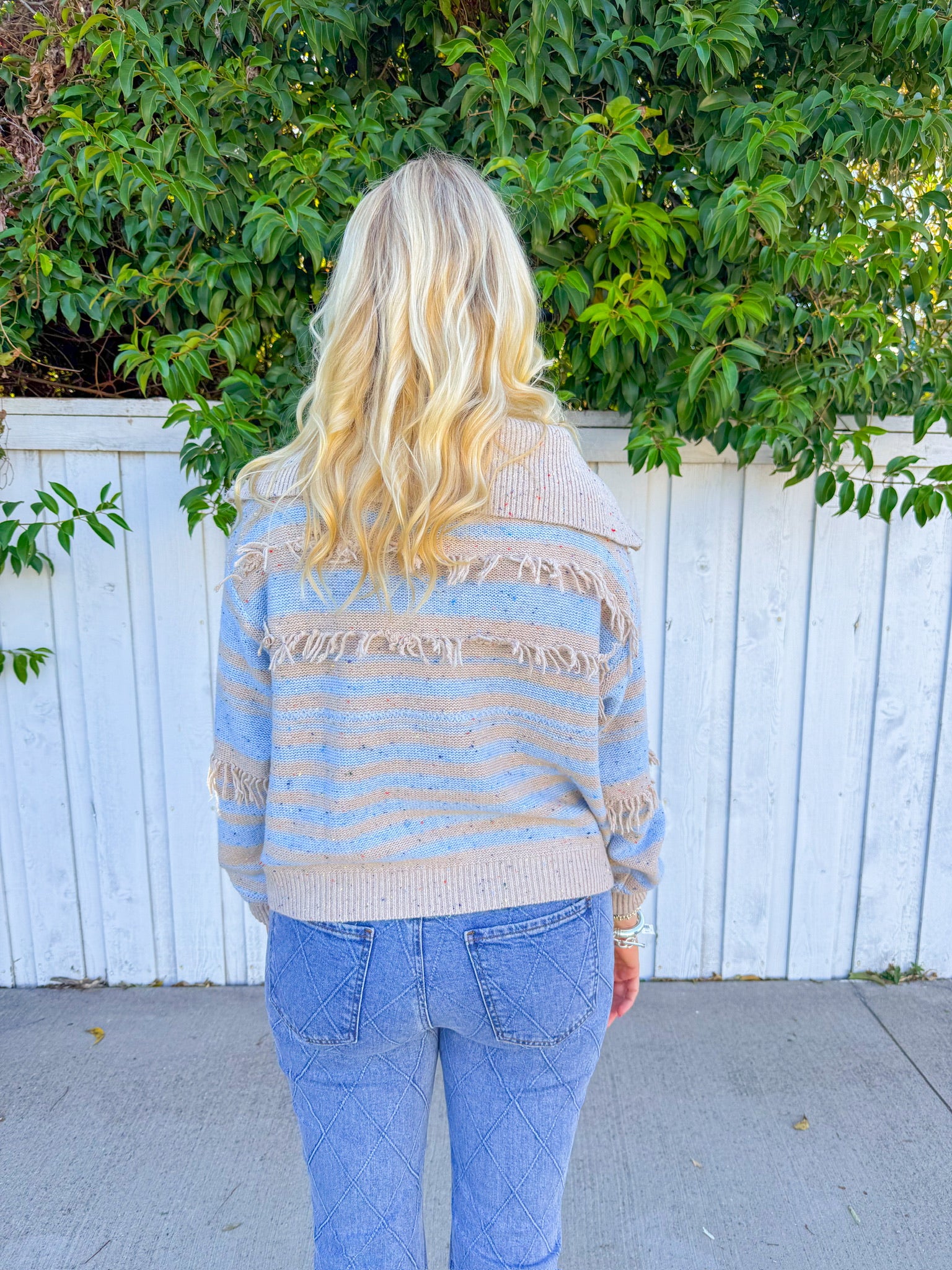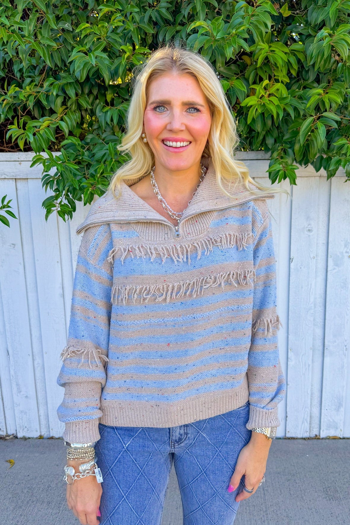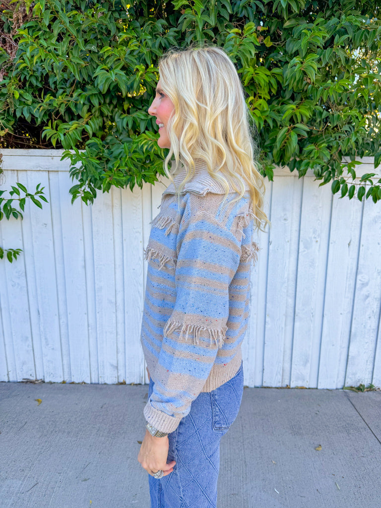 Crisp blue stripes add visual interest while playful fringe detailing along the hem brings movement and personality to your everyday layers.