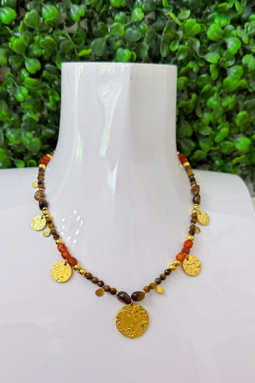 Spread good vibes with this charming beaded necklace featuring warm brown and rust tones that pair perfectly with any outfit. Each bead tells a story, creating a unique piece that's as meaningful as it is stylish.