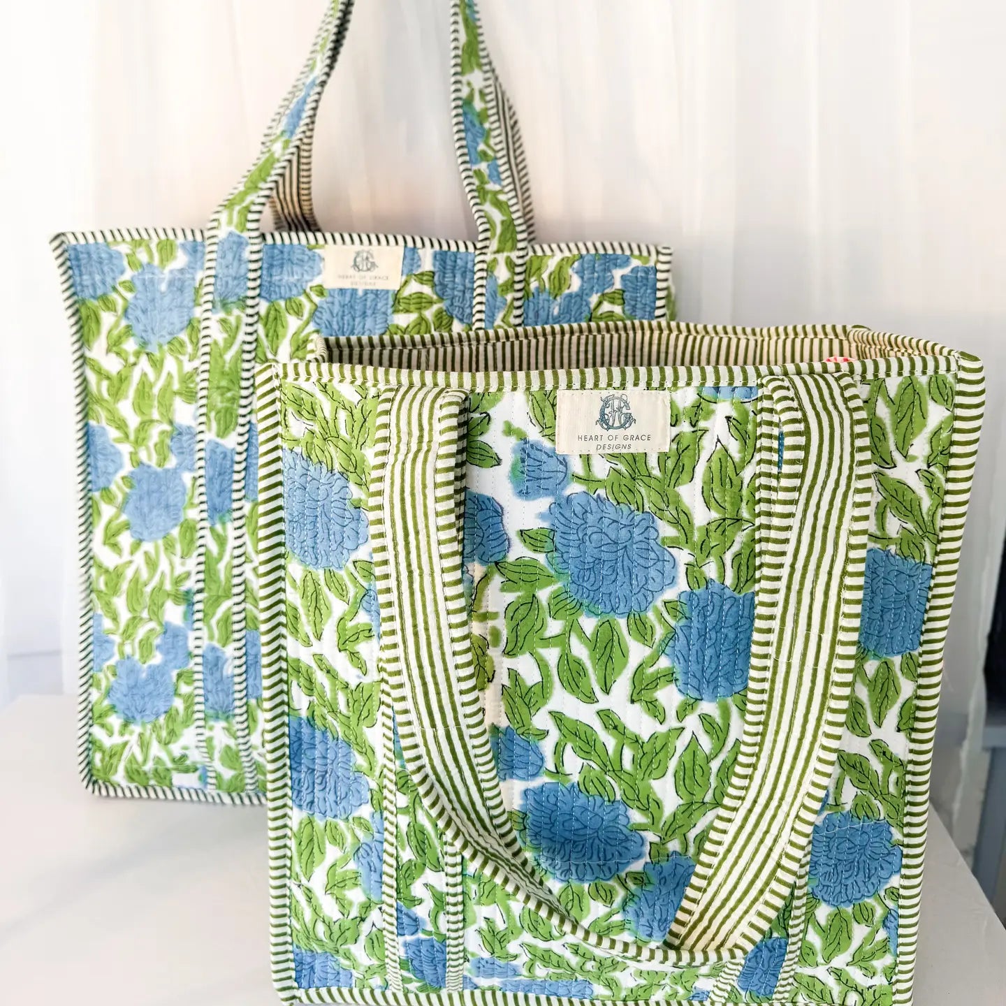 Our Heart of Grace Quilted Tote Collection will be a new customer favorite! These are hand quilted and crafted in India using block printing. Bag measurements: 14” x 15” No zipper Includes an Inside pocket for phones, etc. Each piece is hand crafted and block printed by artisans, making it truly one of a kind and filled with timeless charm. The block printing process may have variations in color, printing, and fabric as part of the handmade process which is what makes each product unique.