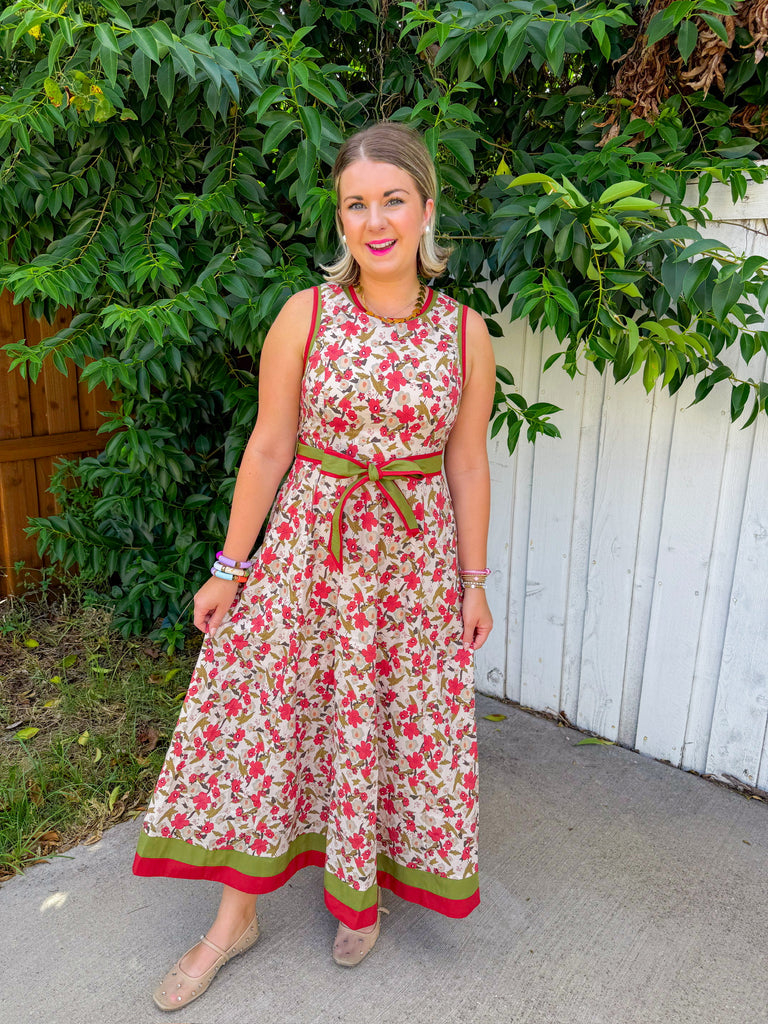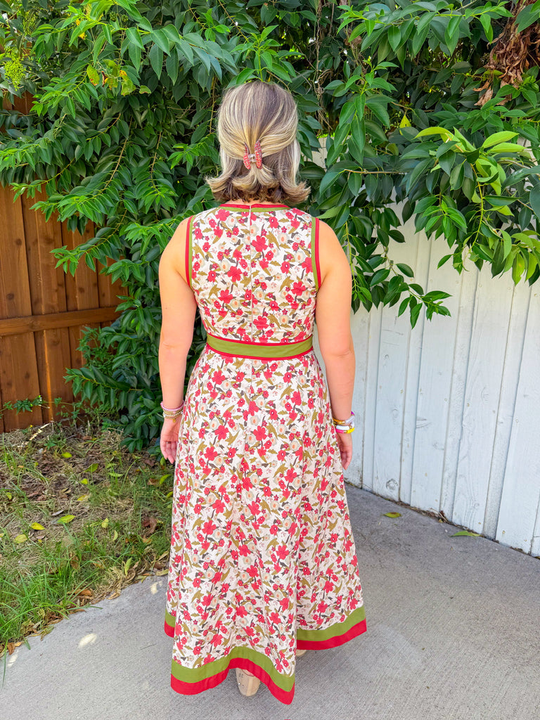 This ecru maxi dress is blooming with charm thanks to its red floral print and color-blocked hem in festive green and crimson.
