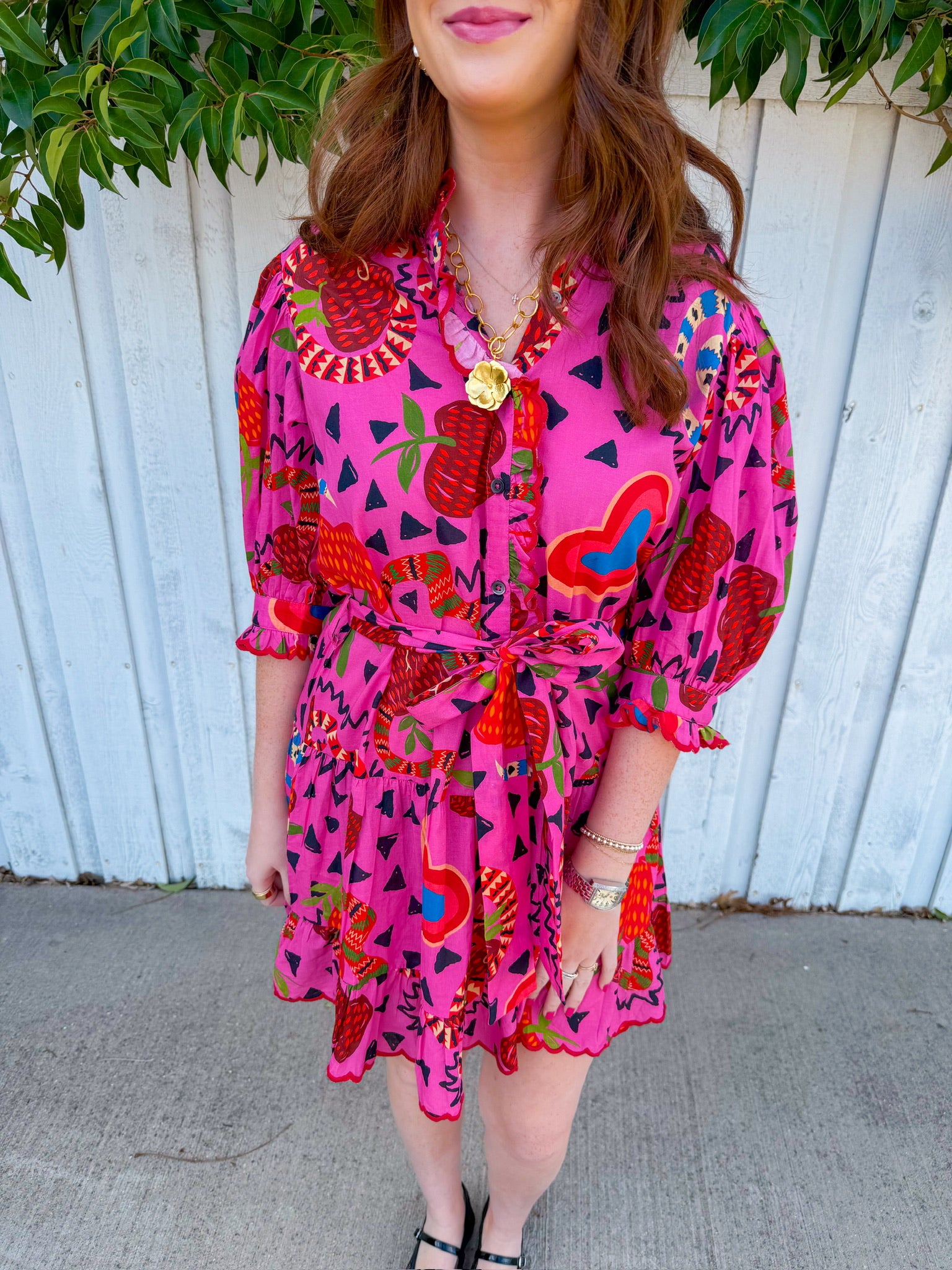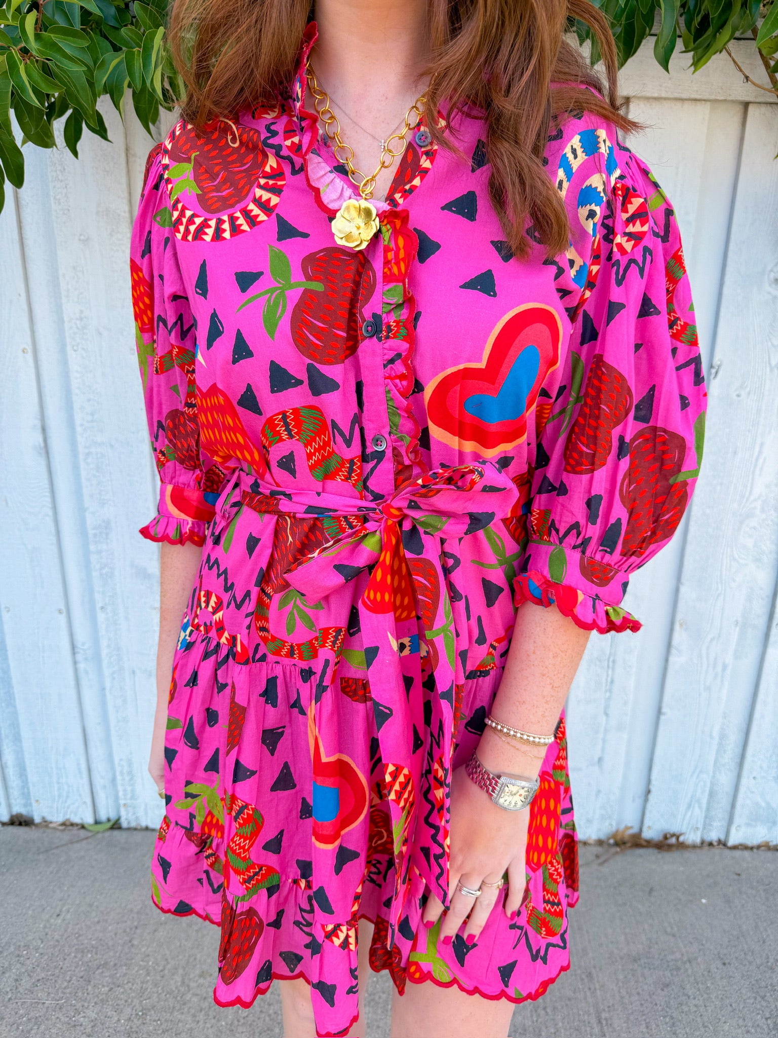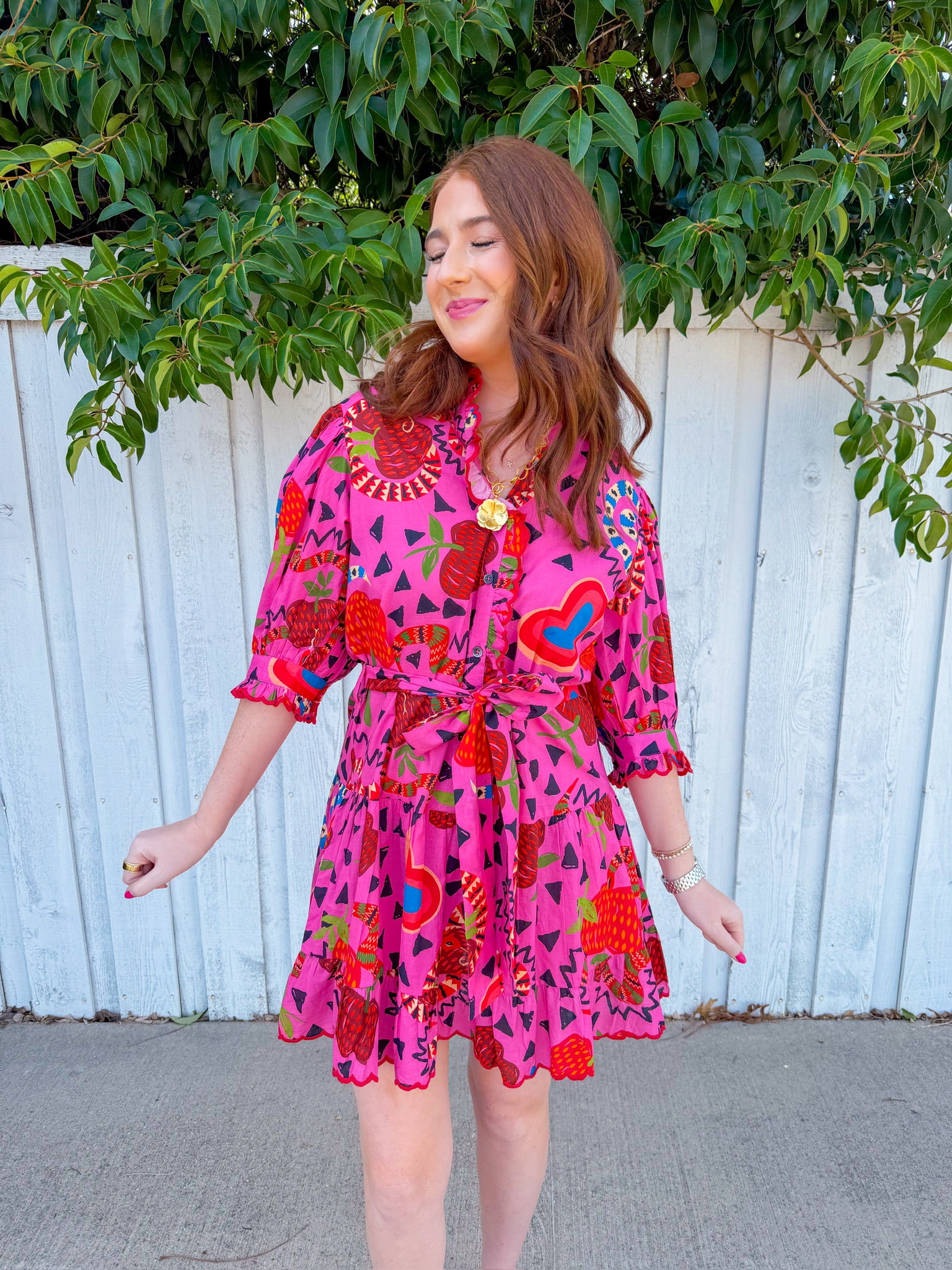 Step into fun with the Ivy Jane Charming Snakes Dress in hot pink! This playful mini dress features a vibrant multi-color snake pattern that brings personality to any outfit.