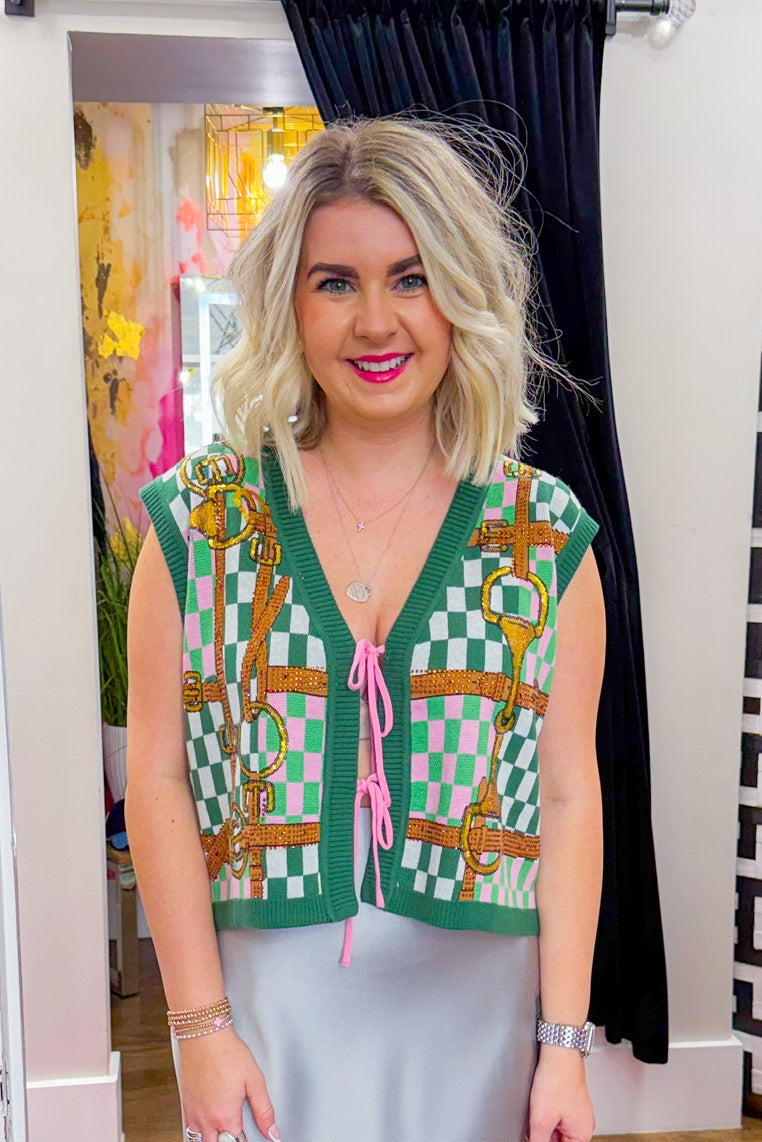 Checkered Horse Bit Tie Up Knit Tank- Green