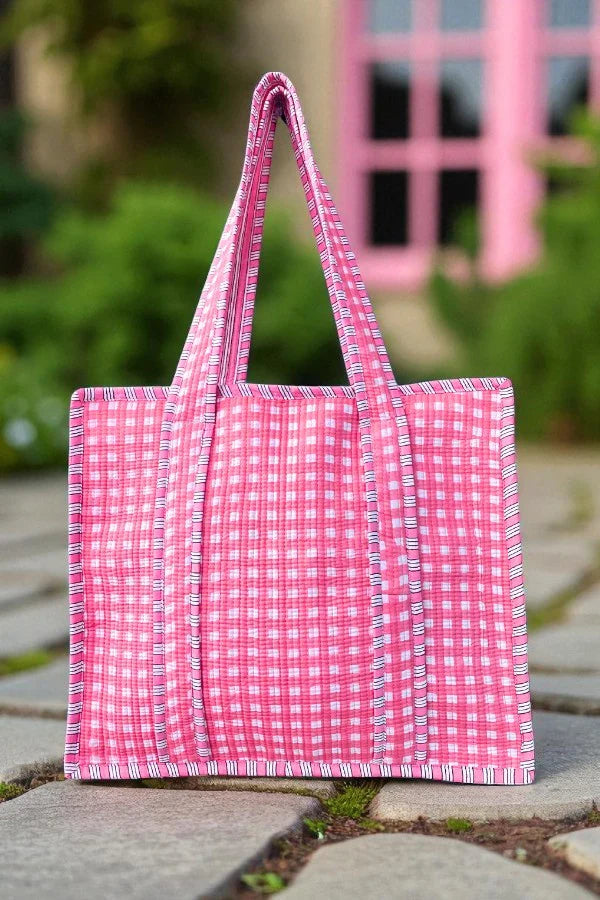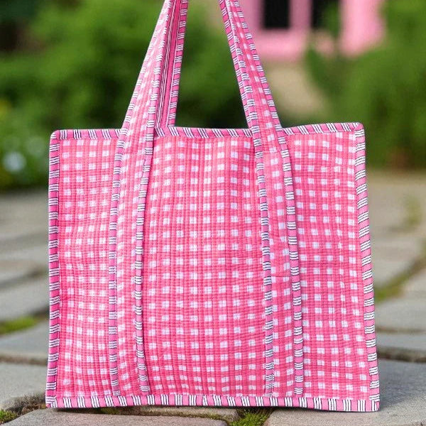 Add a pop of playful charm to your everyday routine with our Pink Checkered Tote Bag! Featuring a classic gingham-inspired checkered pattern in vibrant shades of pink and white, this spacious and lightweight tote is perfect for everything from errands and work to weekend adventures. Designed with durable handles and a roomy interior, it’s both functional and fun. Whether you're heading to the market, beach, or just out and about, this pink tote bag is your go-to for style and convenience.