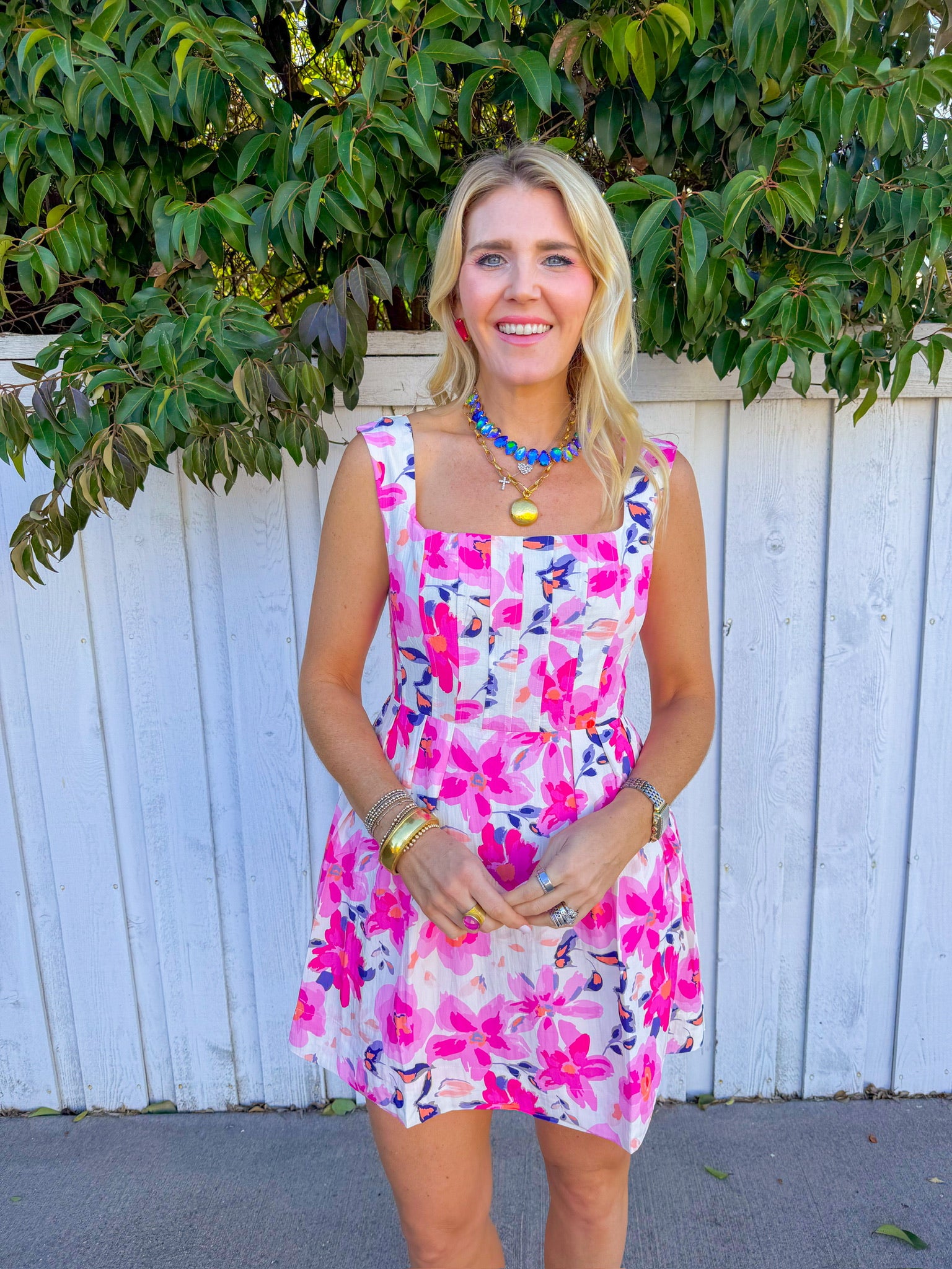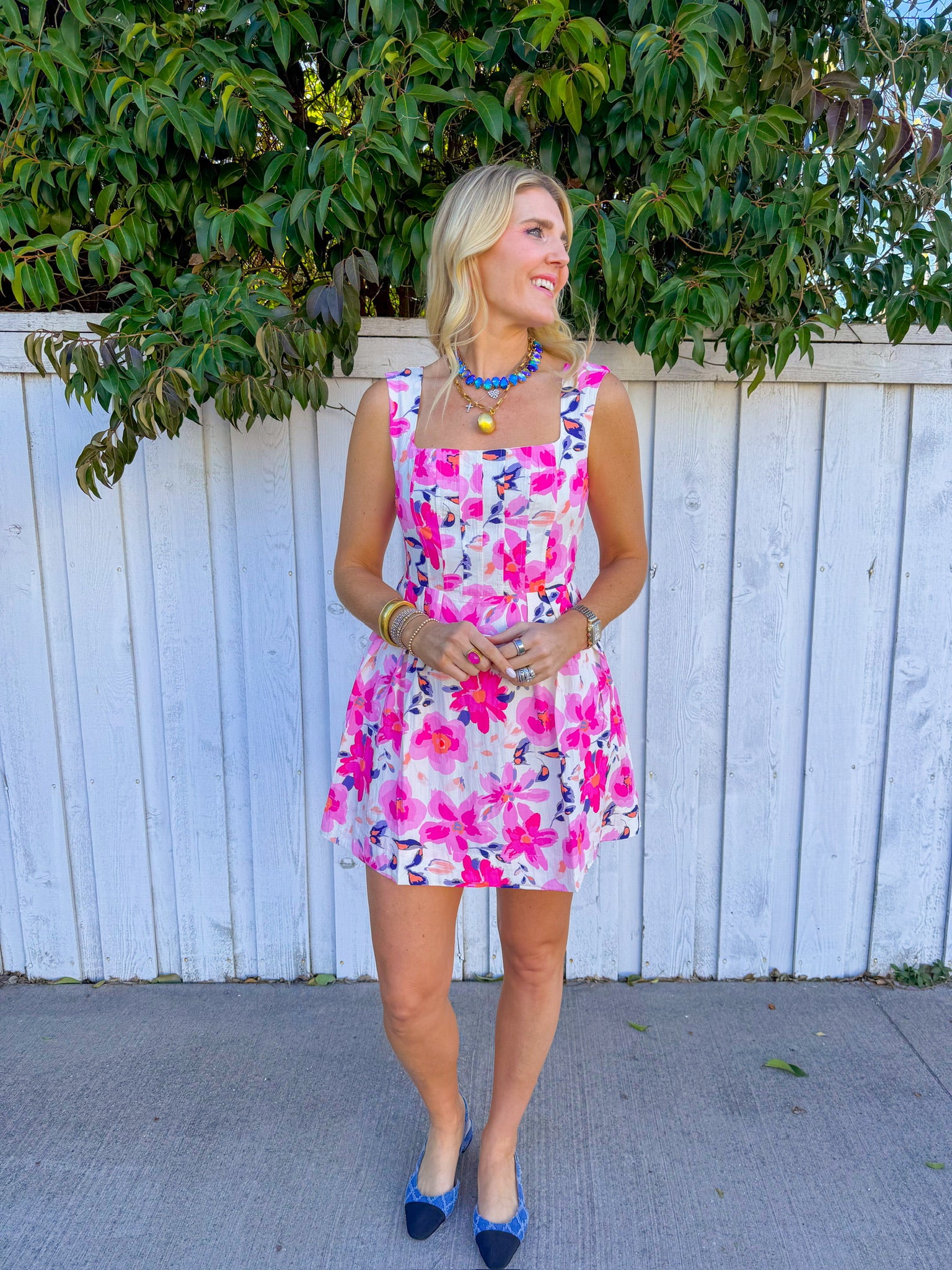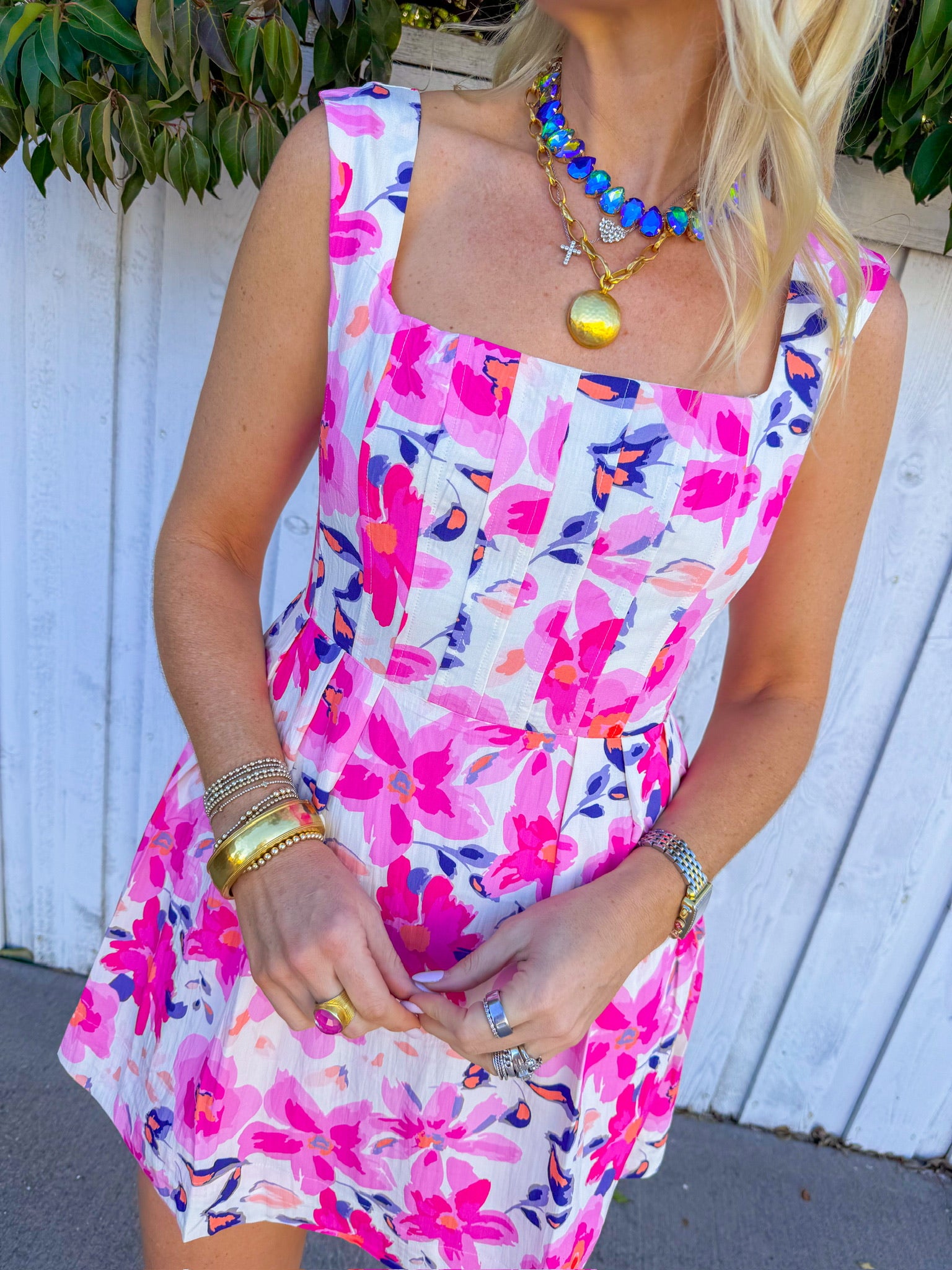 Off-white canvas meets botanical romance in this mini dress that's impossible to ignore. Soft pink and blue florals bloom across the fabric while corset pleating sculpts a stunning silhouette.