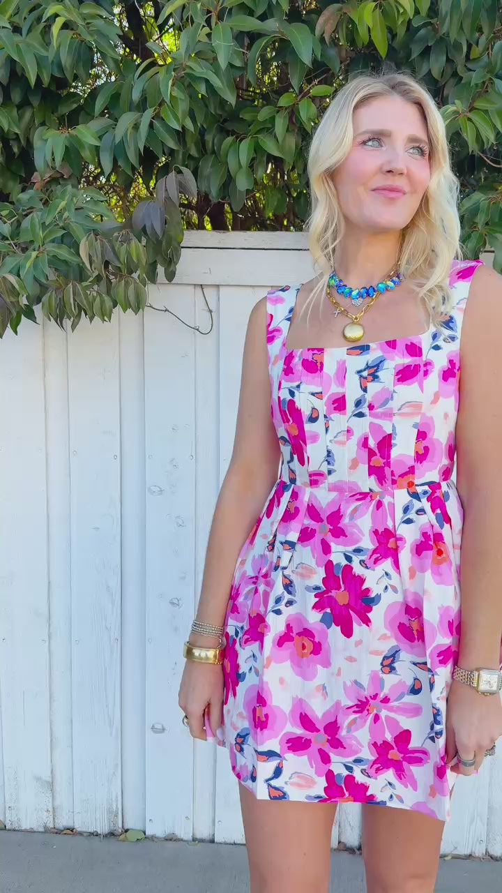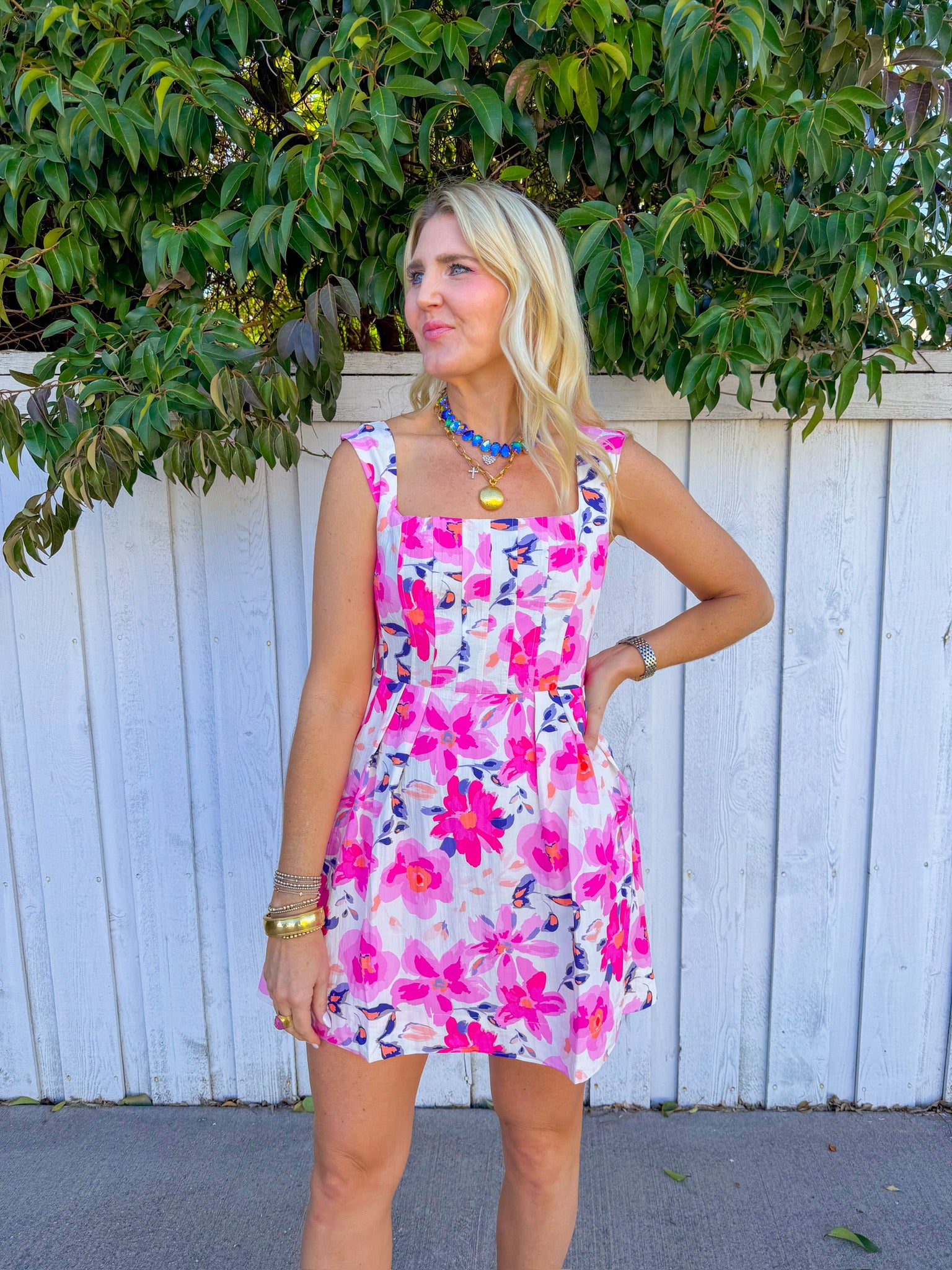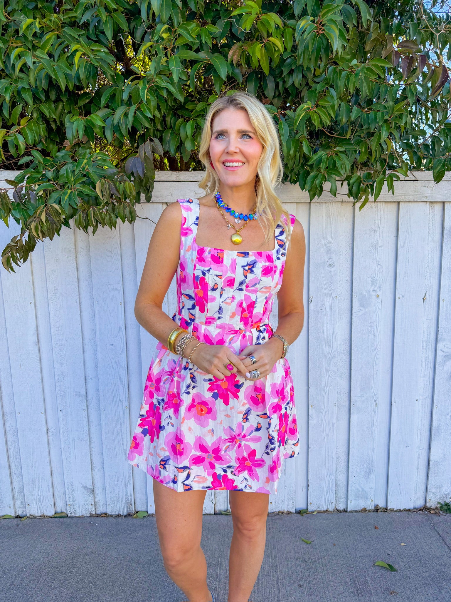 Off-white canvas meets botanical romance in this mini dress that's impossible to ignore. Soft pink and blue florals bloom across the fabric while corset pleating sculpts a stunning silhouette.