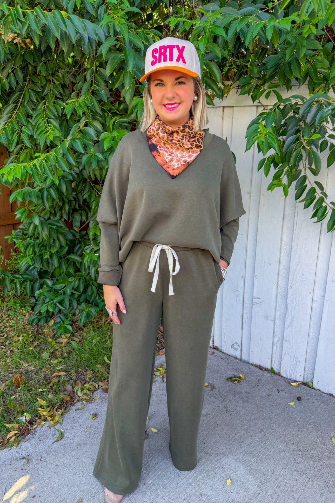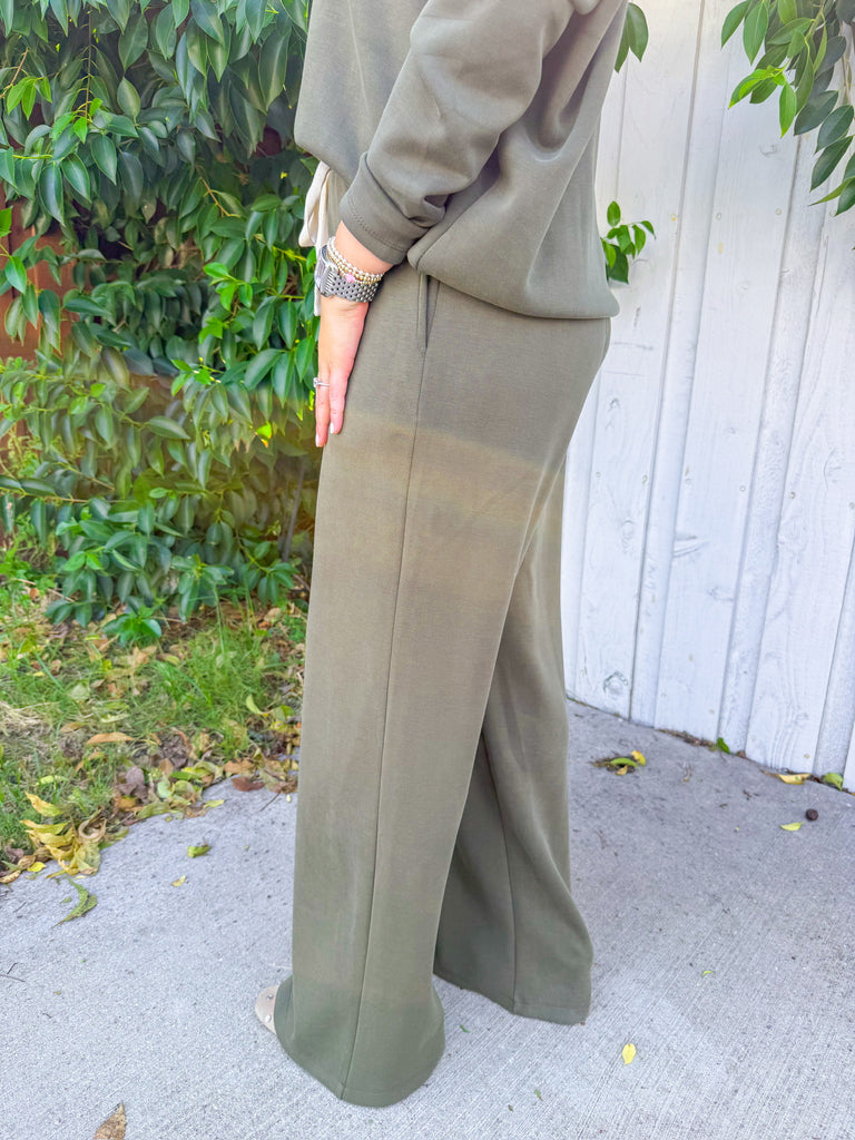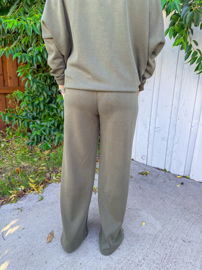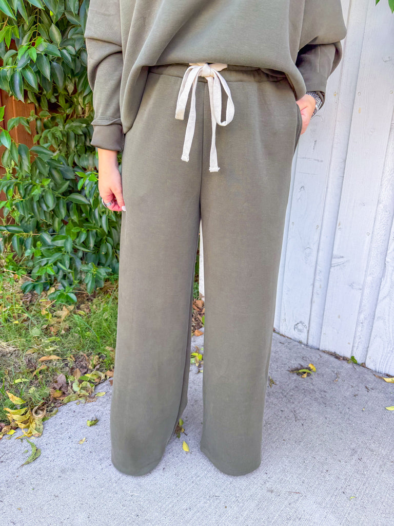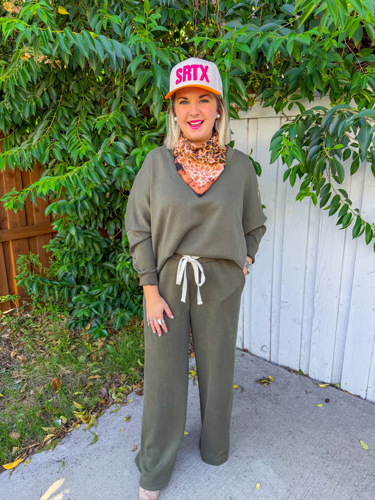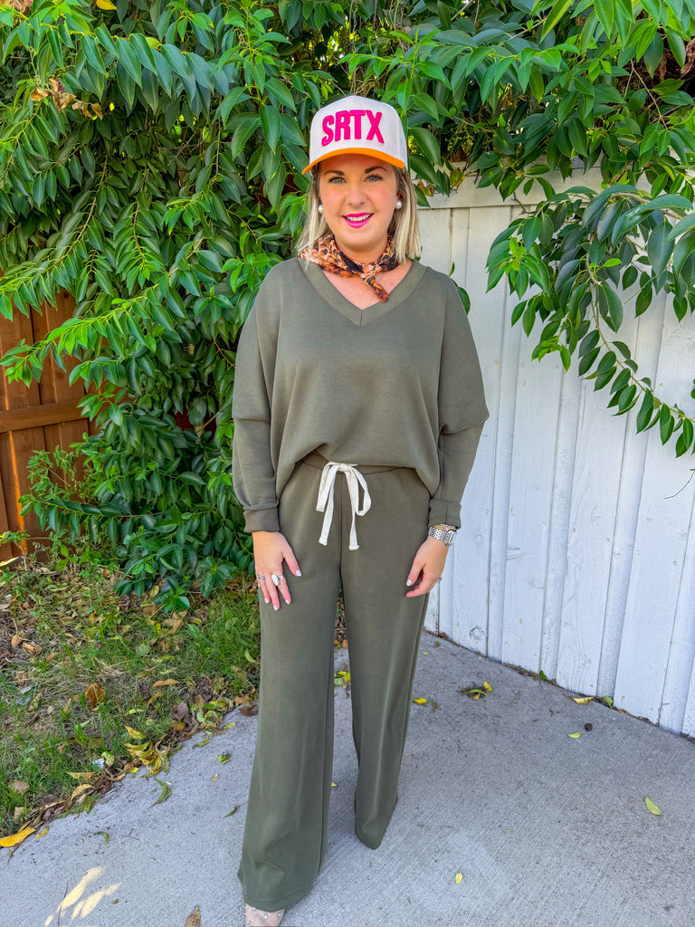 Olive lounge set with a cropped V-neck sweatshirt and wide-leg drawstring pants—buttery soft and perfect for travel days or cozy weekends. Wear with sneakers and a cap now, then add a denim jacket or puffer when it’s chilly.