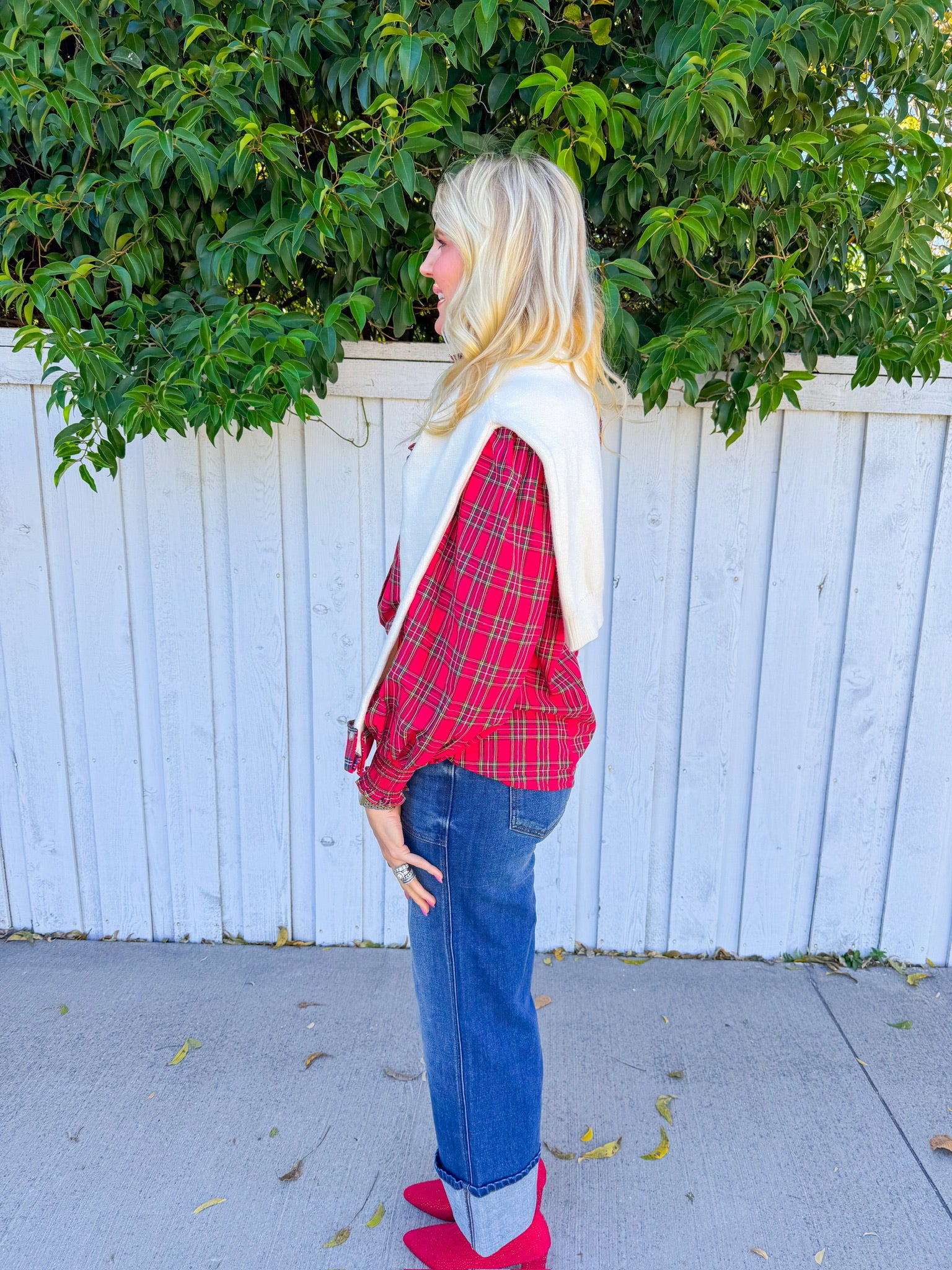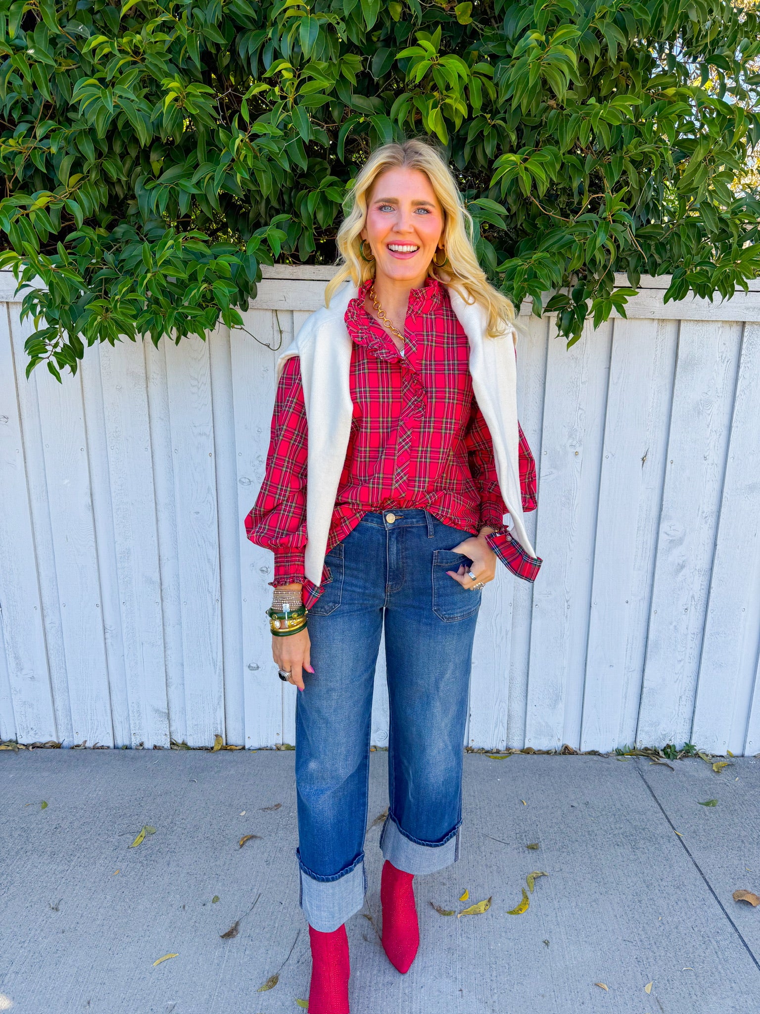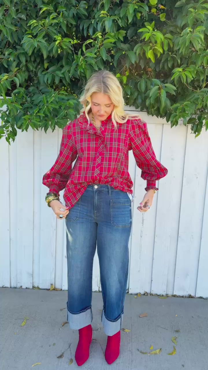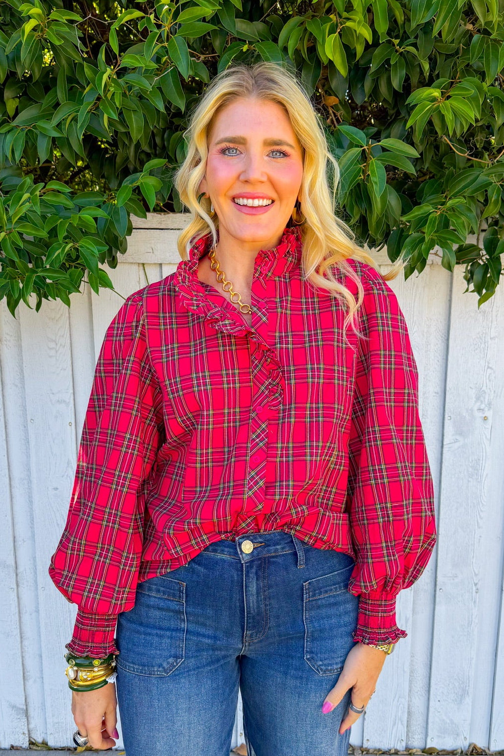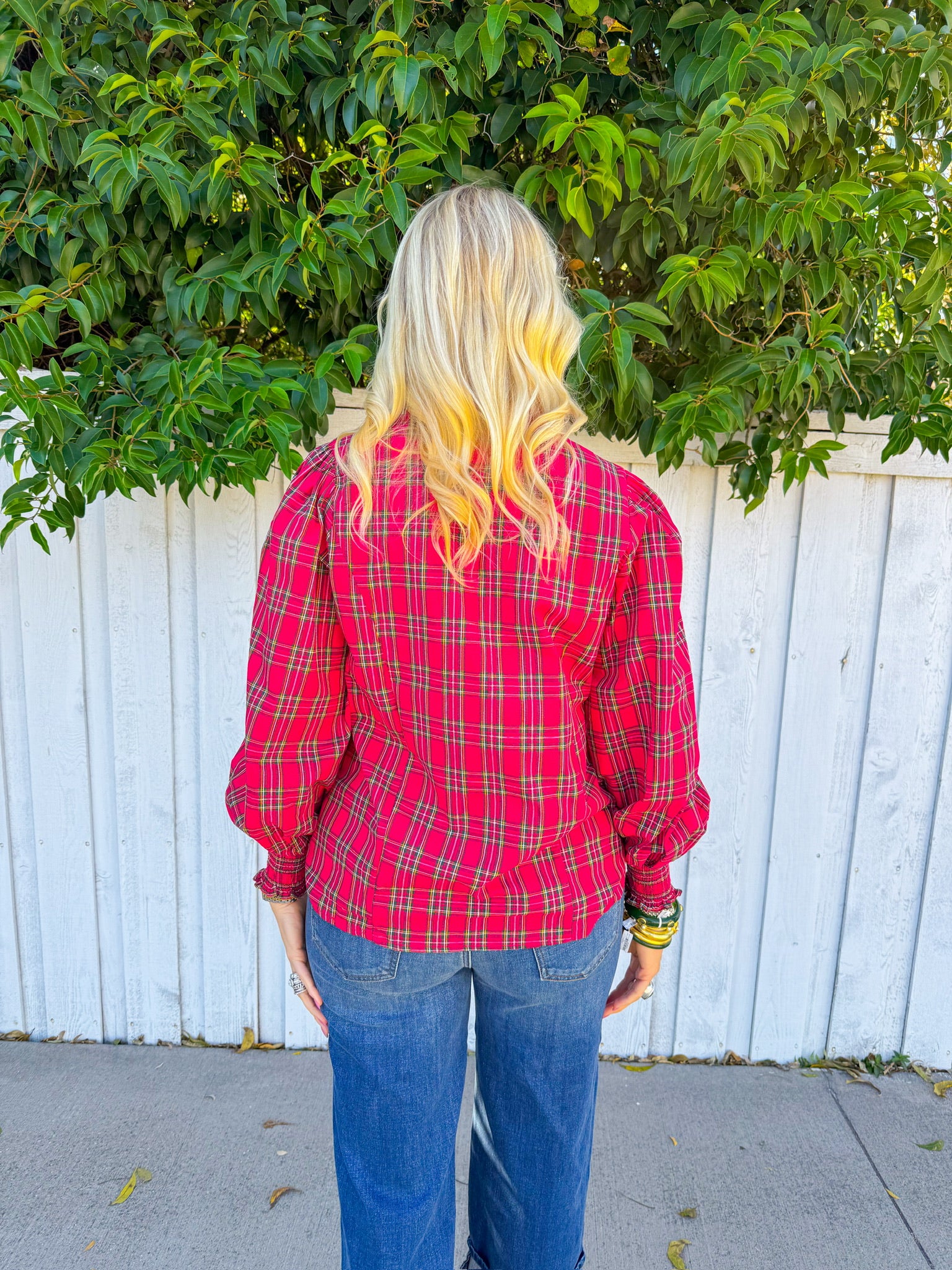 Cozy up in festive style with this charming red plaid long sleeve top. Featuring a ruffled button-down front and timeless plaid pattern, it's the perfect piece for holiday gatherings, casual outings, or layering through the season.