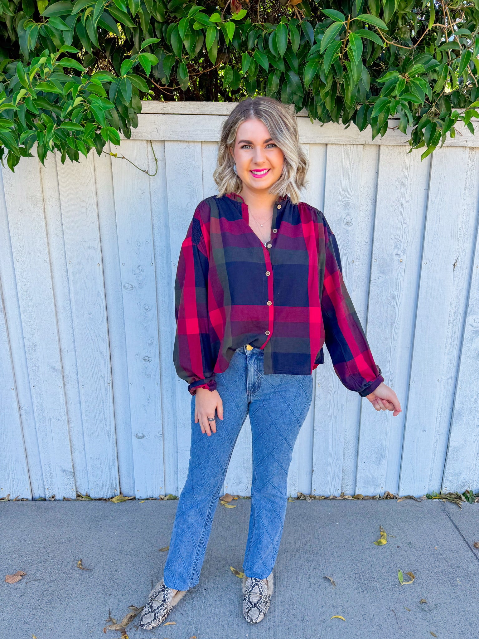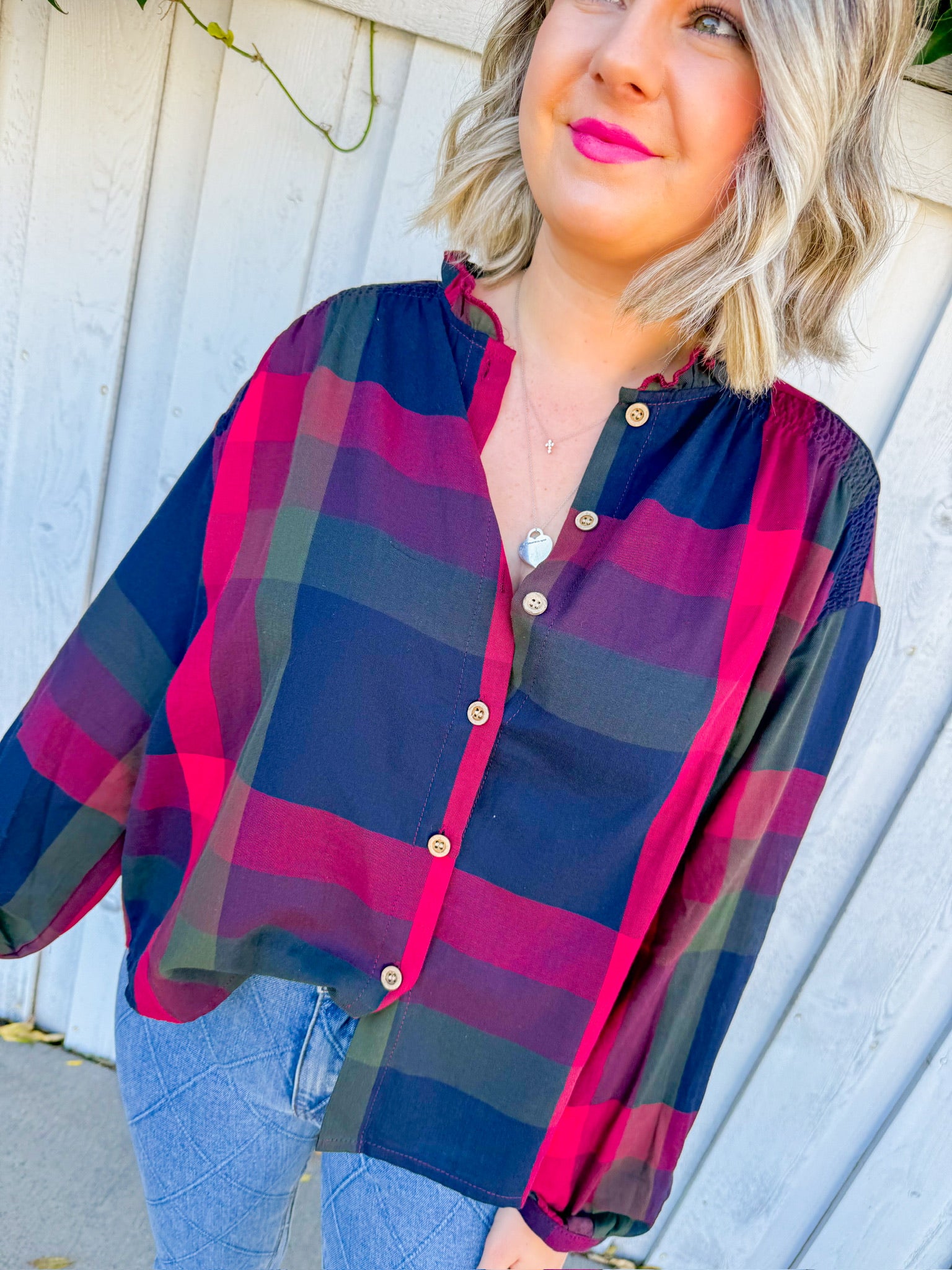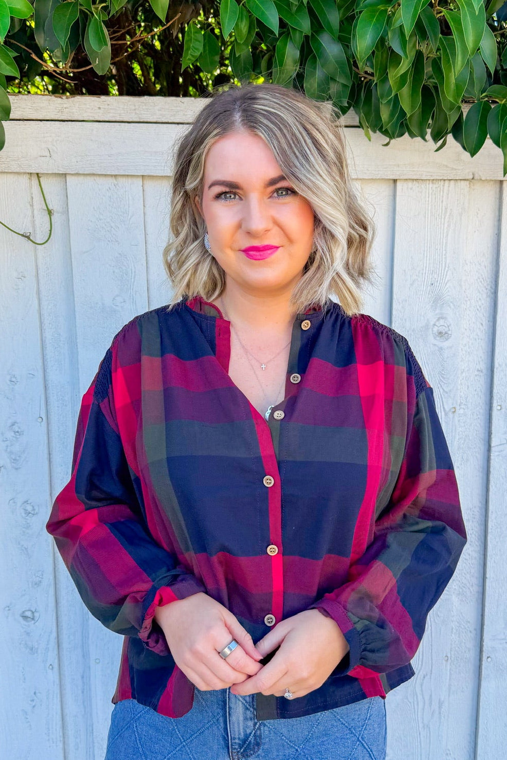 Cinnamon Spice Top - Multi Warm up your wardrobe with this charming plaid blouse in rich red, black, and dark green tones.