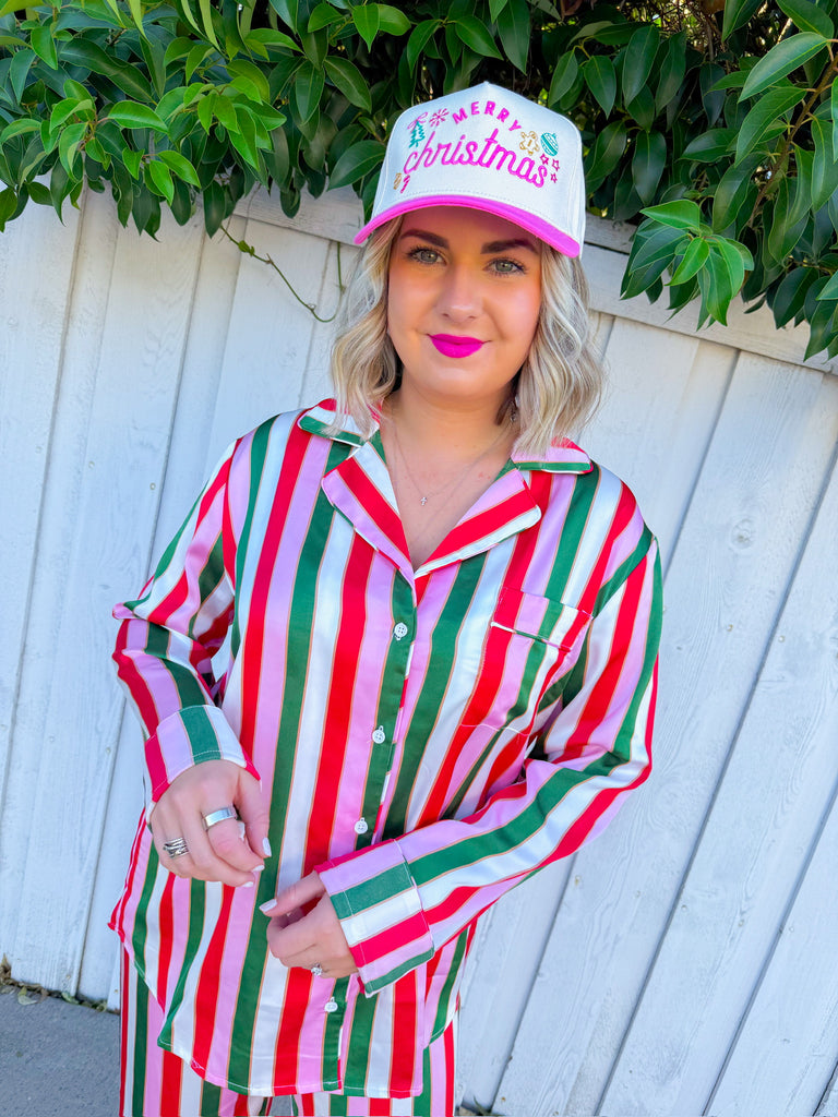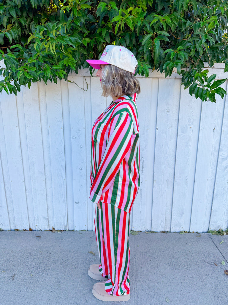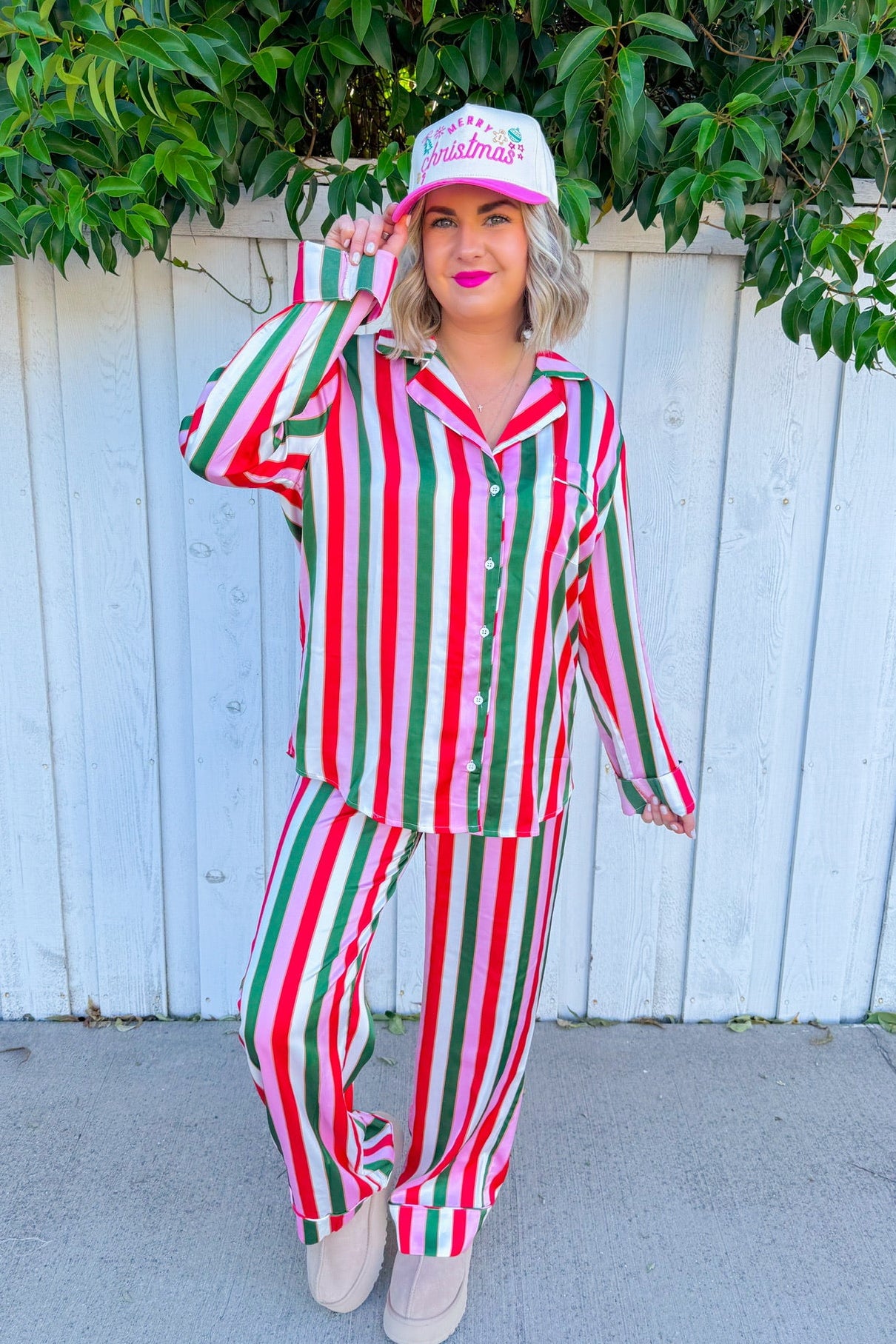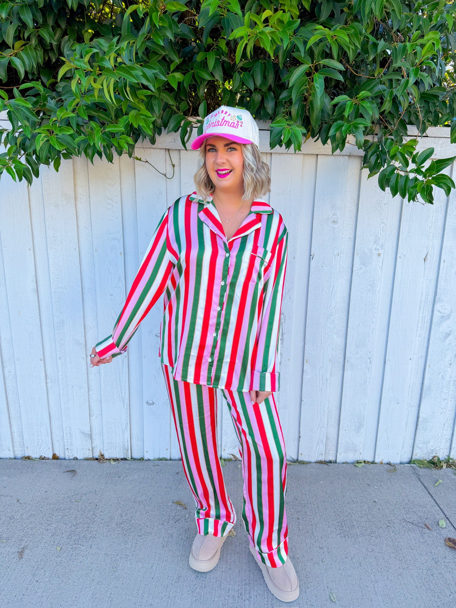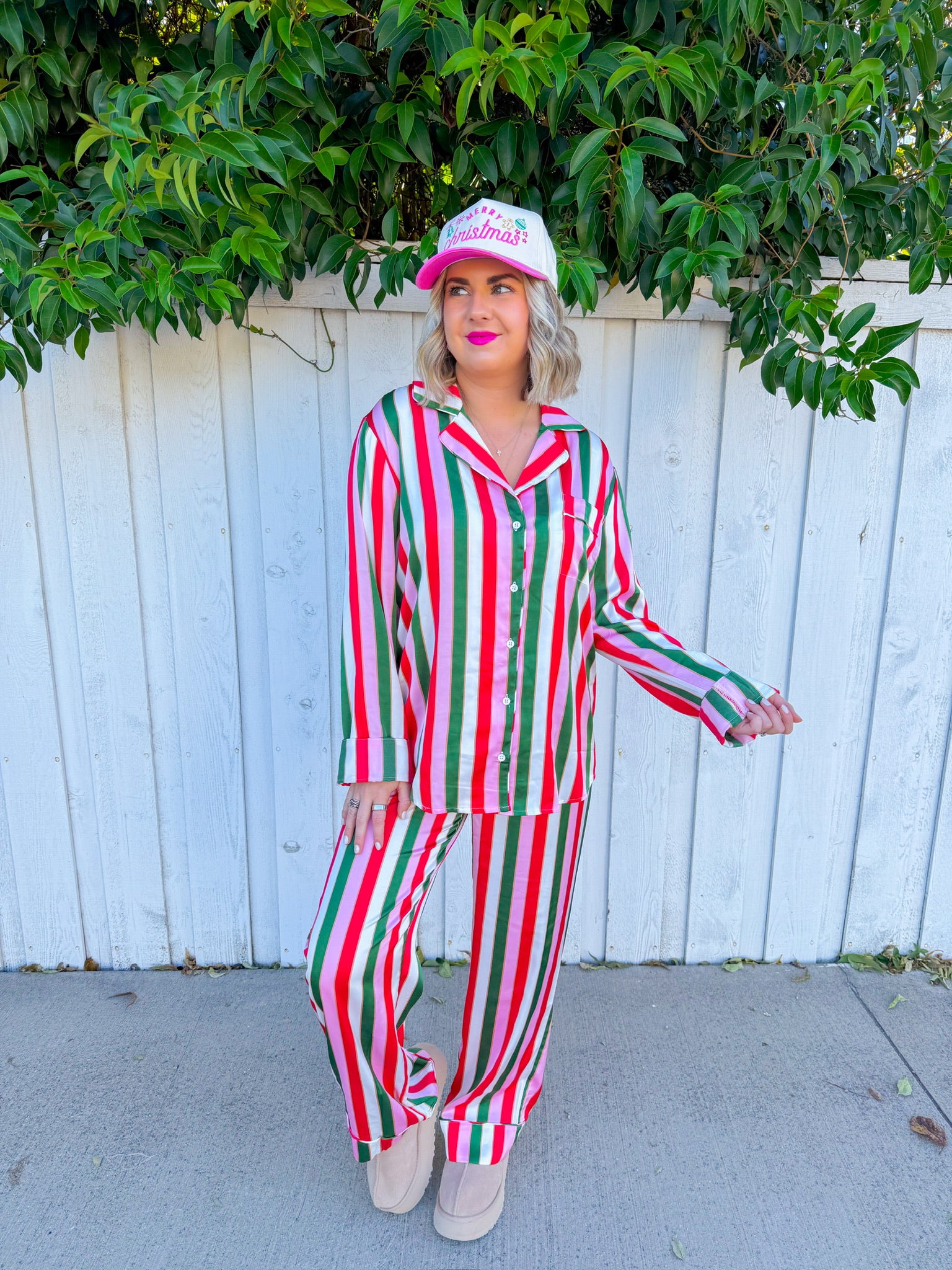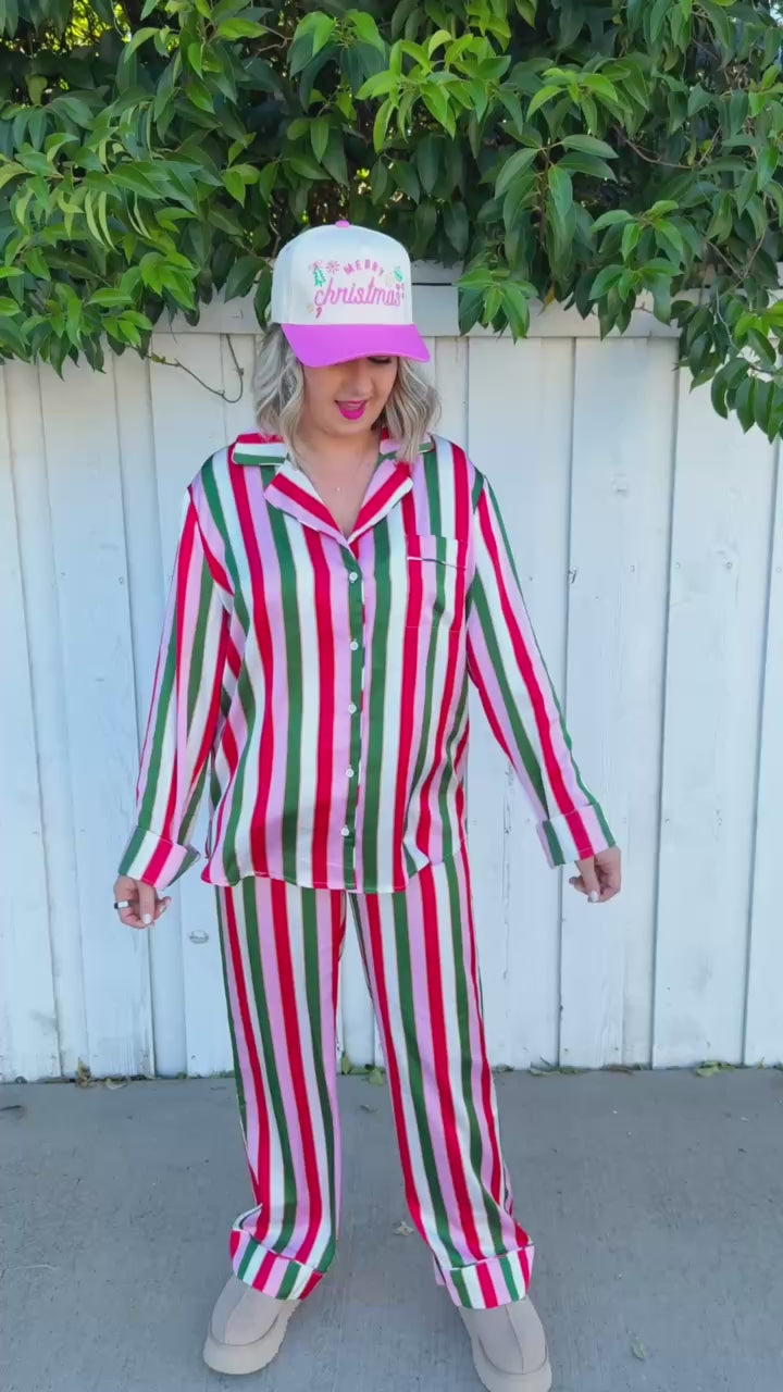 Snooze in style with these vibrant striped silky pajamas featuring a playful mix of red, pink, and green. Crafted from luxuriously smooth silky fabric, this Classic PJ Set keeps you comfortable all night long while the cheerful stripes add personality to your bedtime routine.