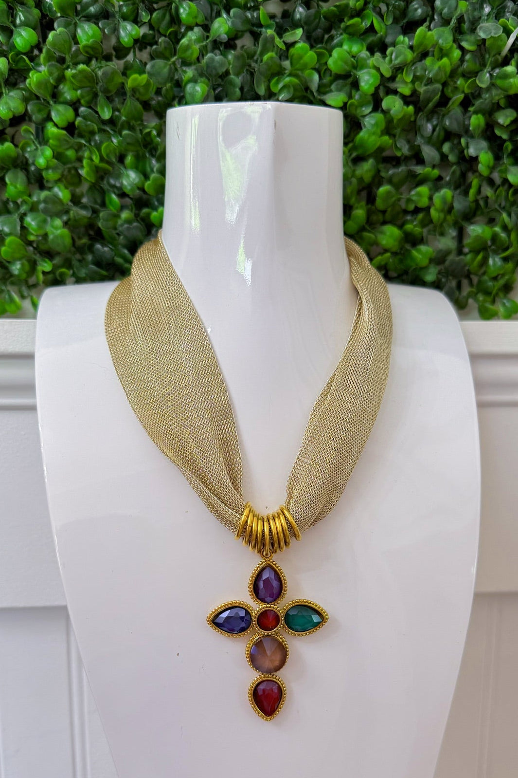 Elevate your everyday style with the Cleo Necklace, a stunning gold mesh chain that pairs perfectly with a vibrant cross pendant. This playful piece blends timeless elegance with a pop of color, making it ideal for layering or wearing solo.