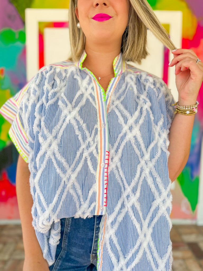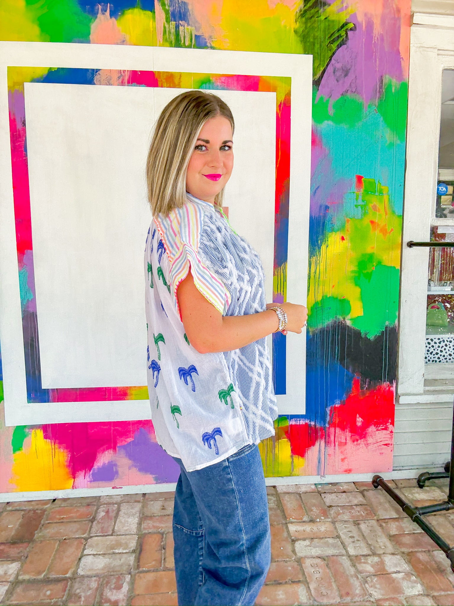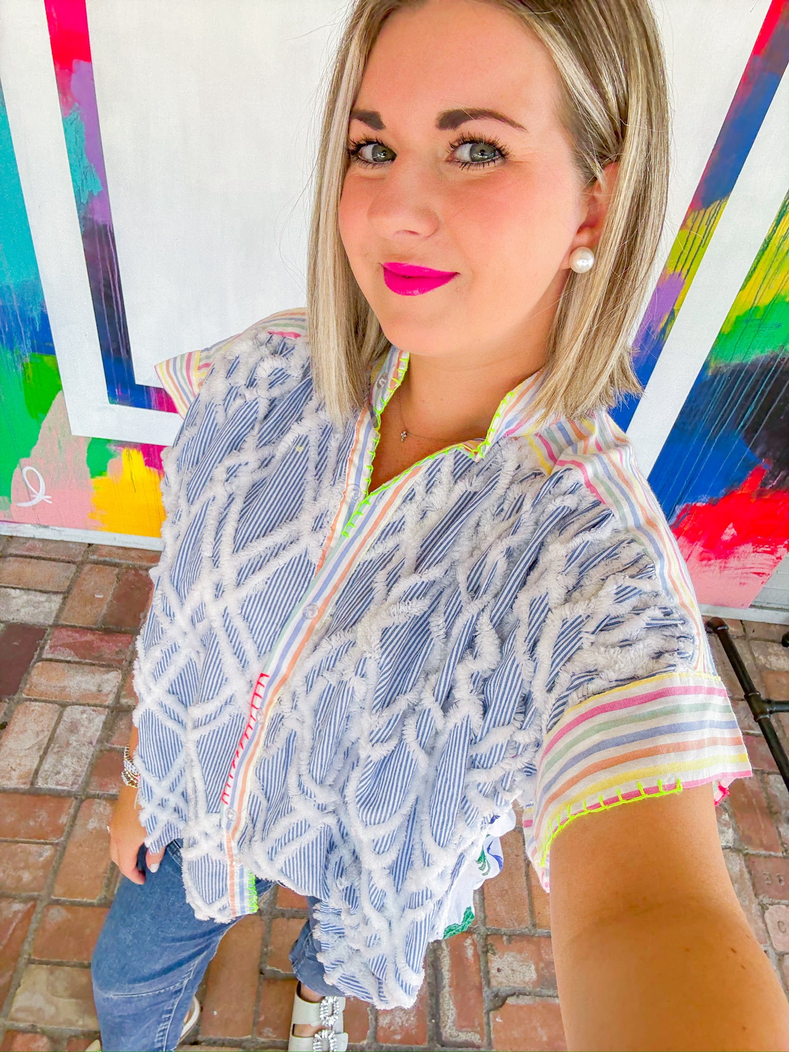 The subtle stripe base gives it that crisp, coastal feel while the pops of neon keep things fun and fresh.