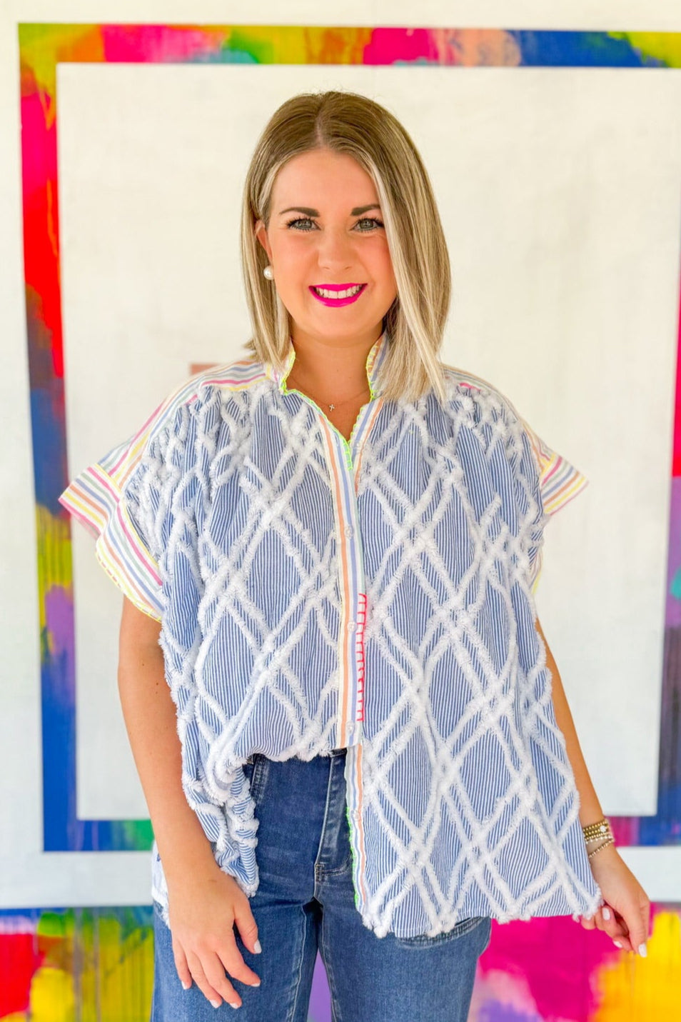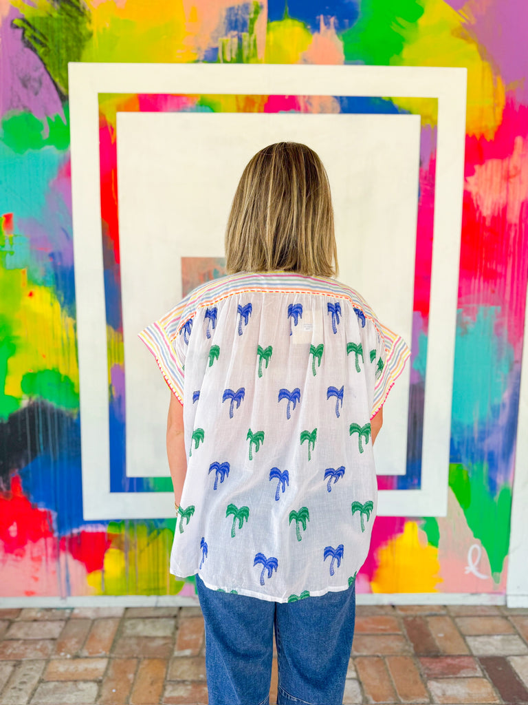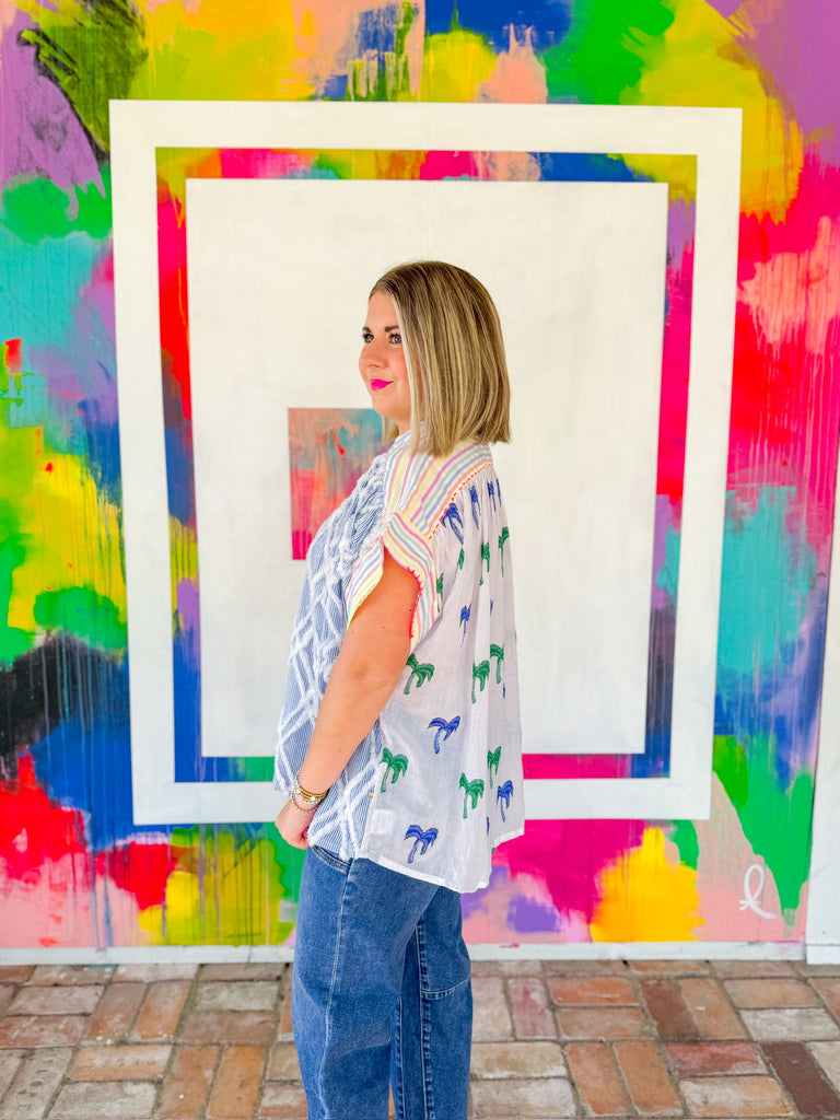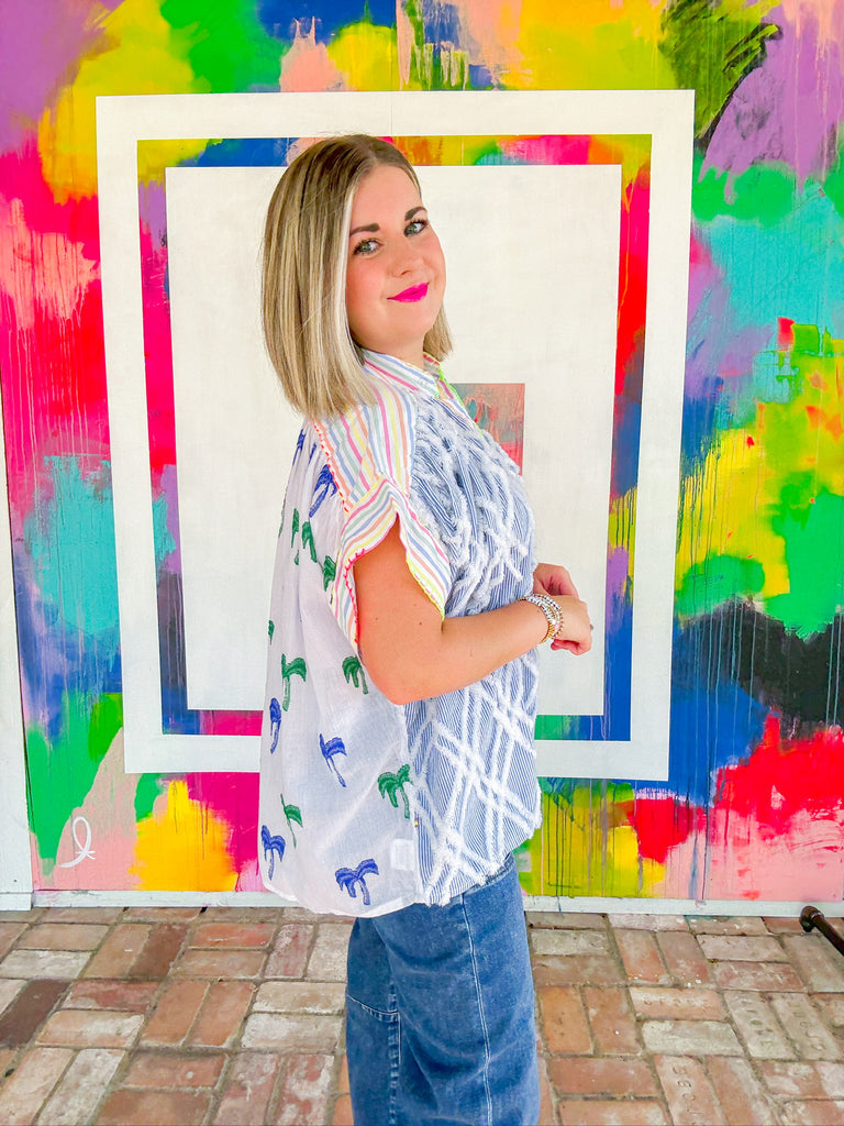 The subtle stripe base gives it that crisp, coastal feel while the pops of neon keep things fun and fresh.