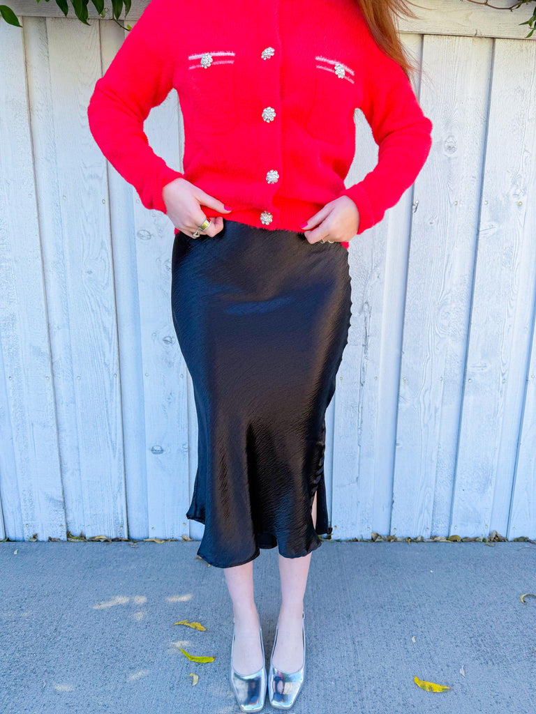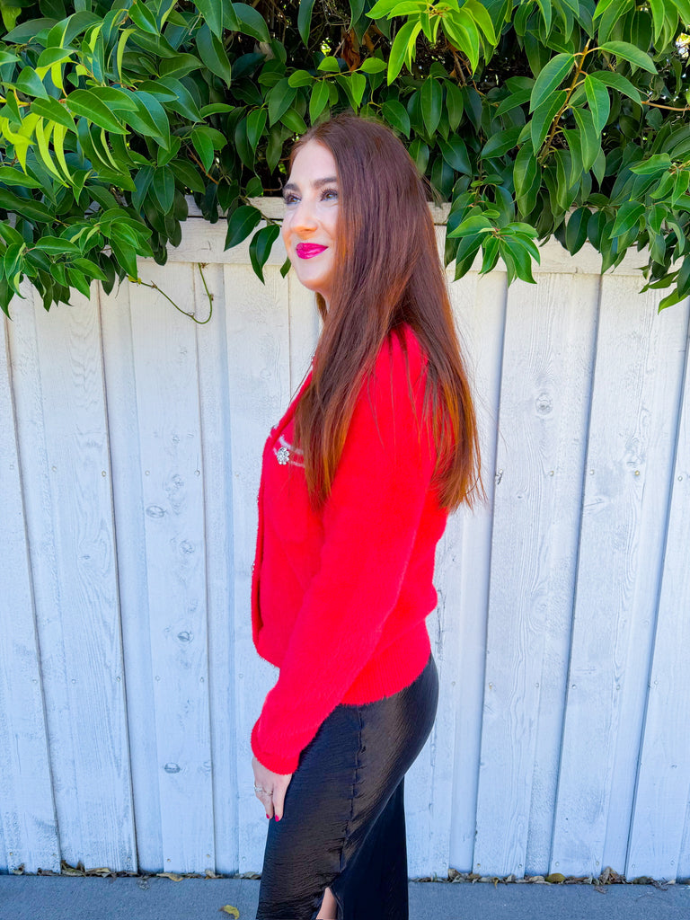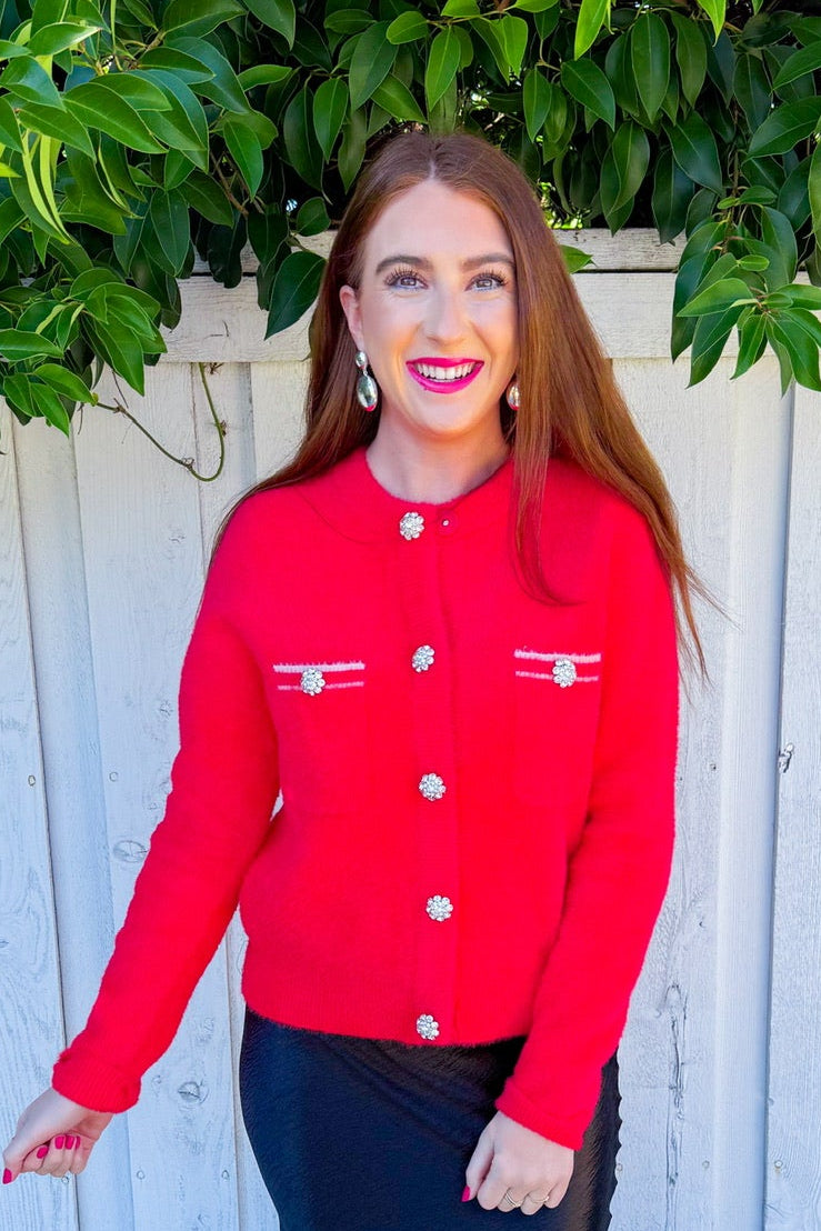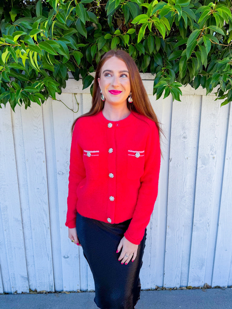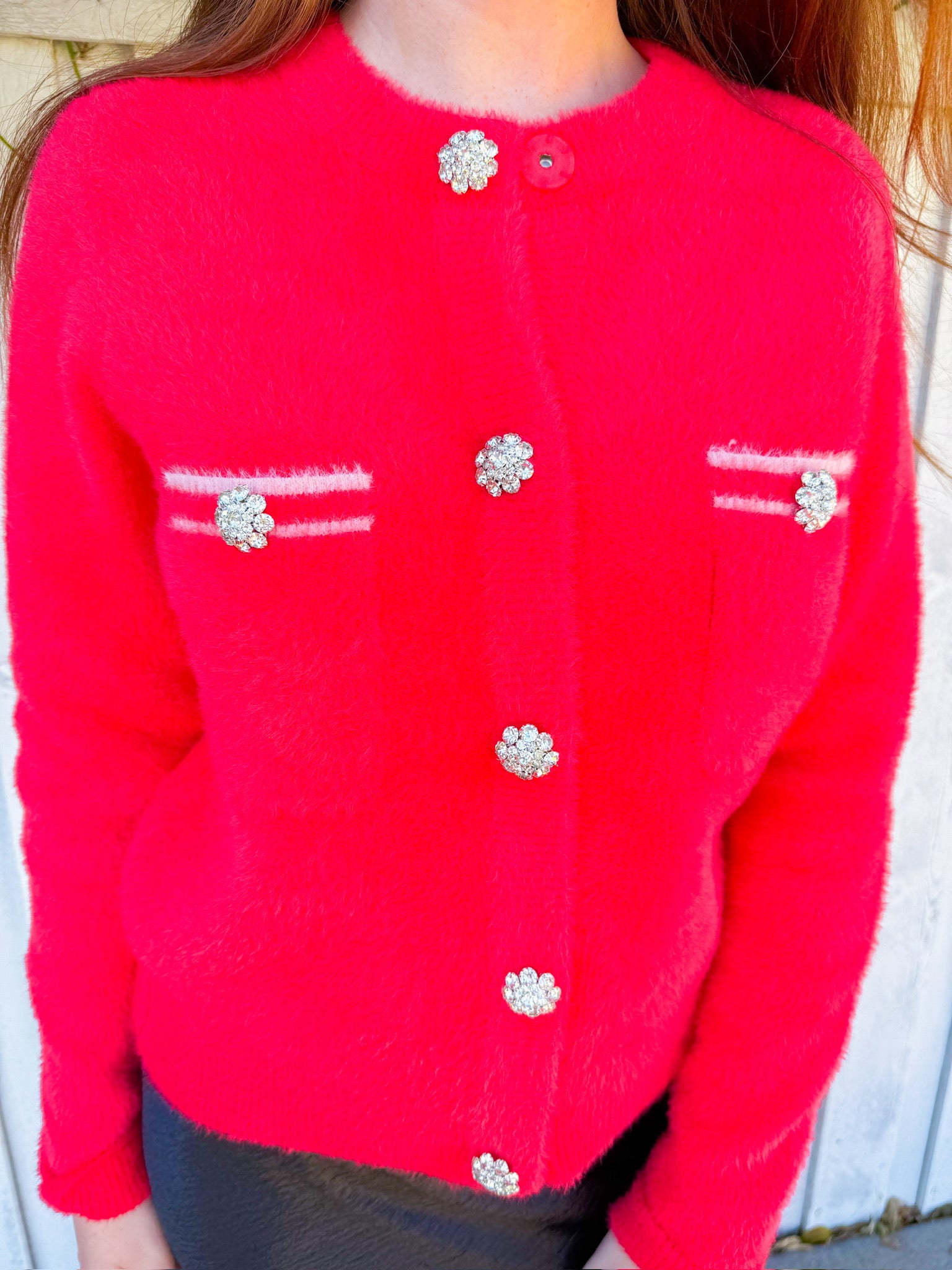 The rhinestone button closure adds just the right amount of glamour to elevate any outfit—whether you're layering over a dress or pairing it with your favorite jeans.