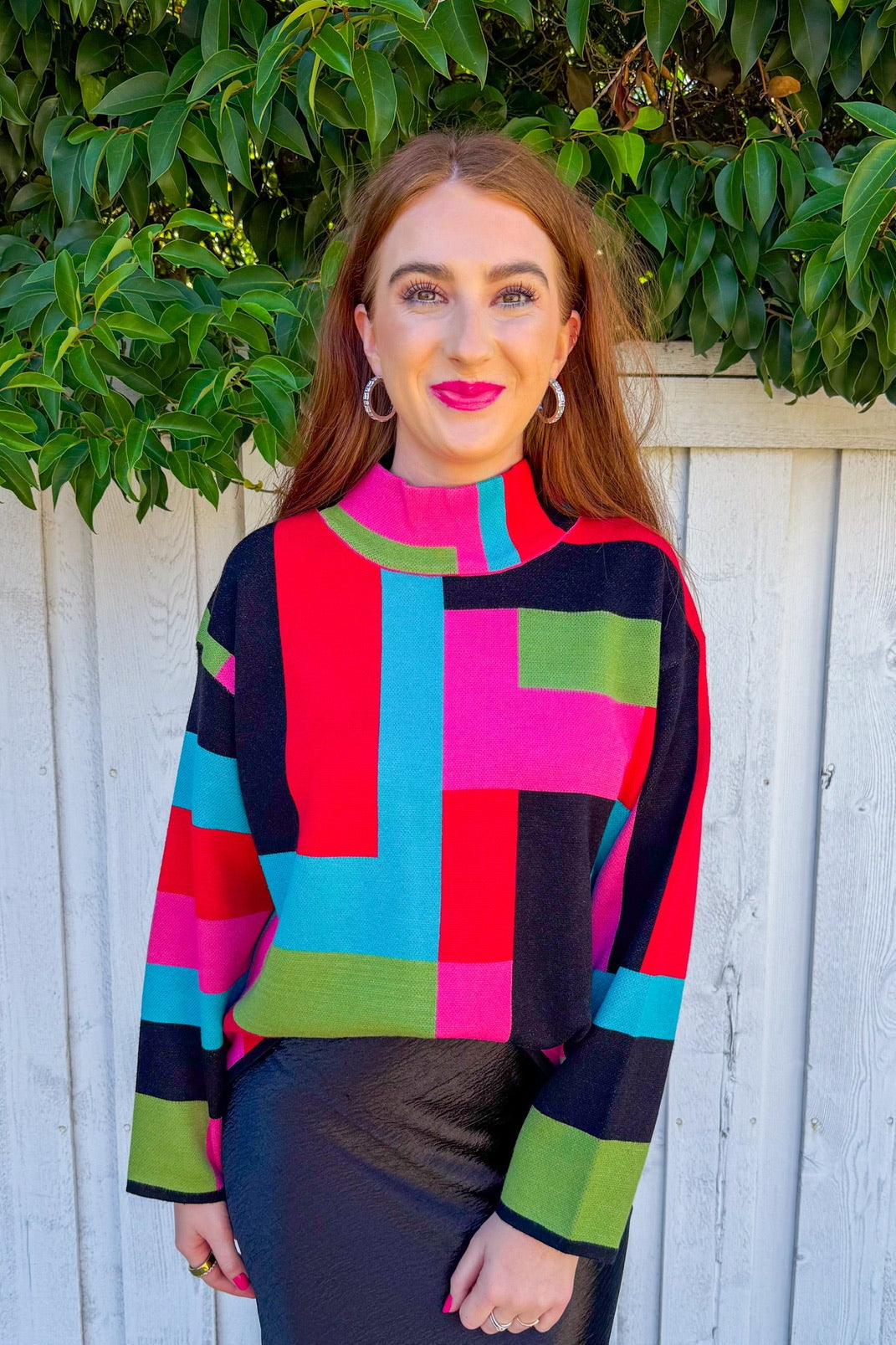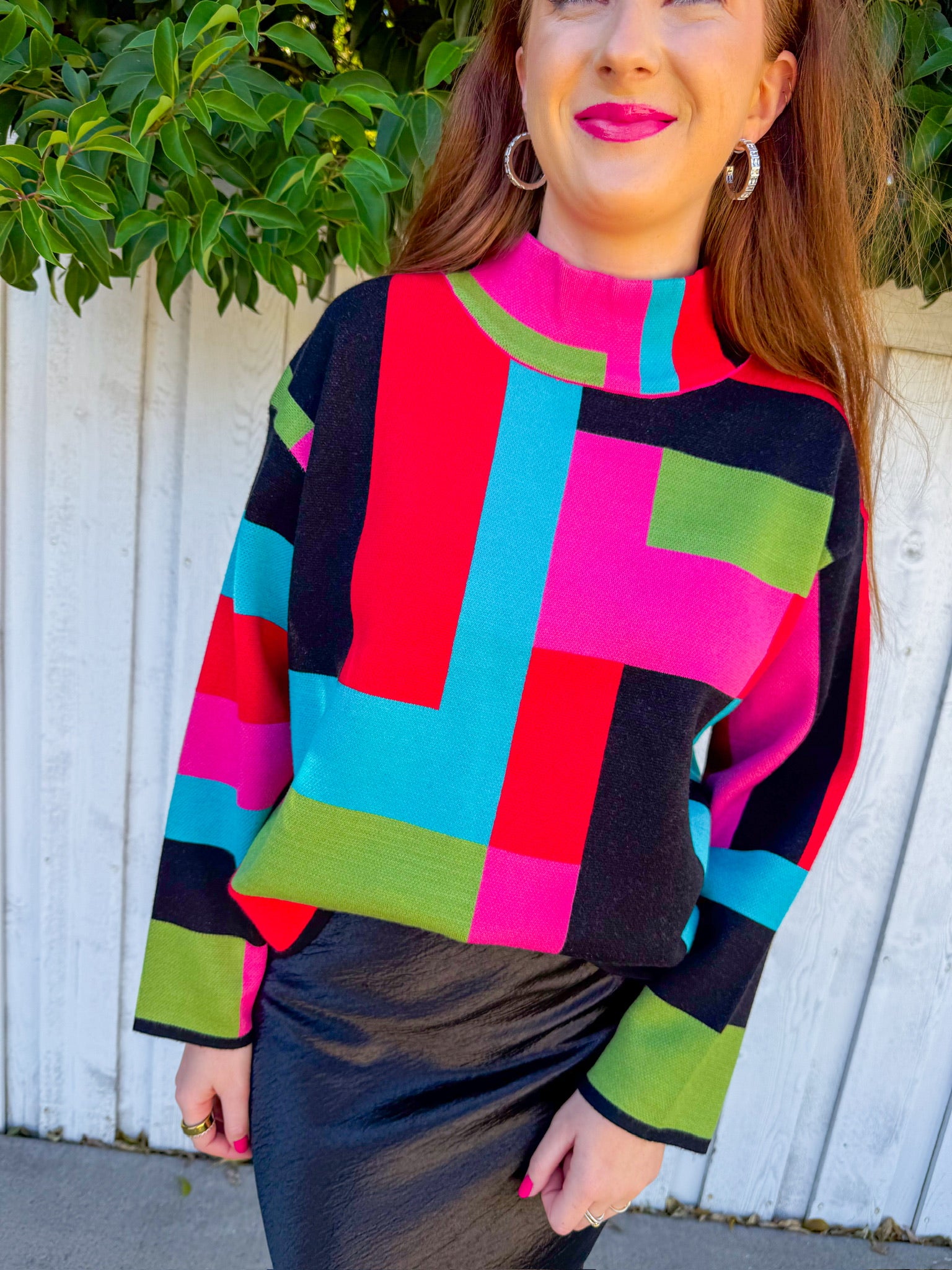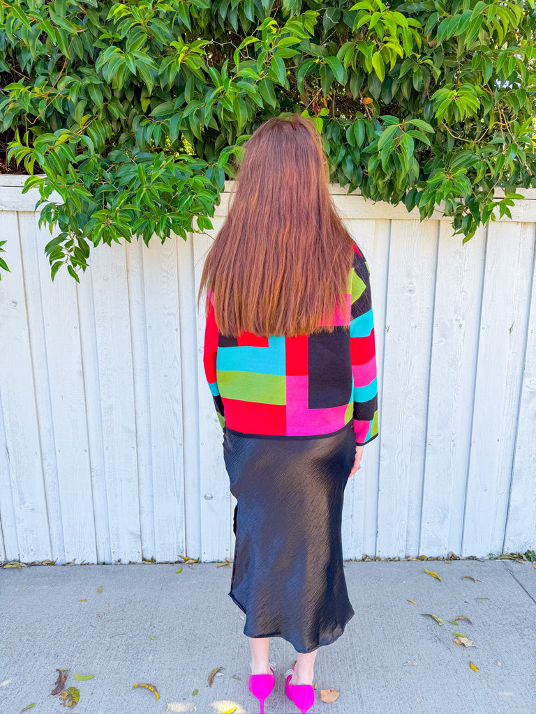 Vibrant hues blend seamlessly across the front and sleeves, creating a dynamic look that pairs effortlessly with neutrals or stands alone as a statement piece.