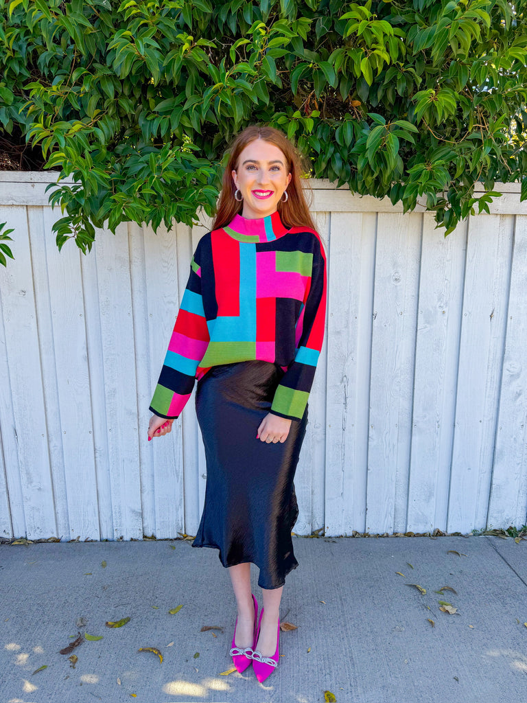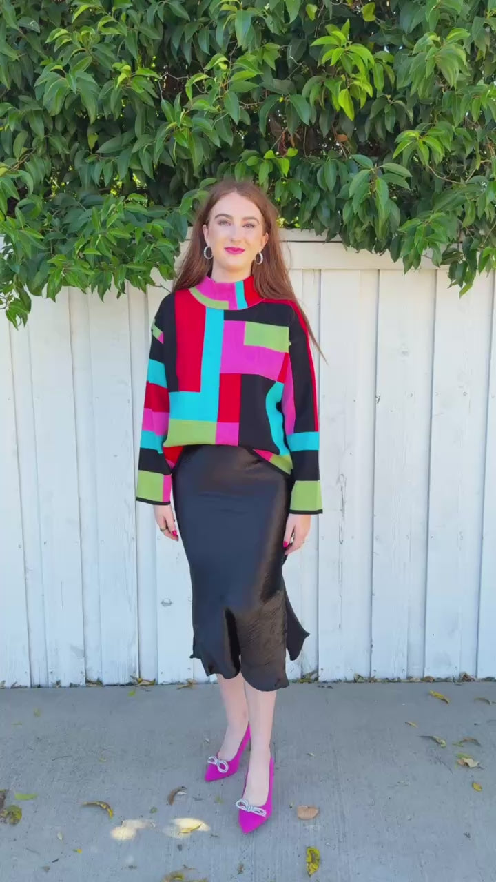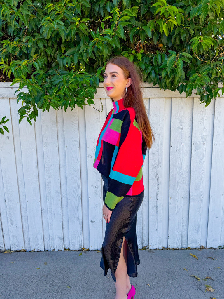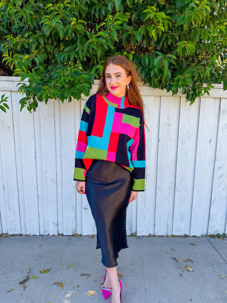 Vibrant hues blend seamlessly across the front and sleeves, creating a dynamic look that pairs effortlessly with neutrals or stands alone as a statement piece.