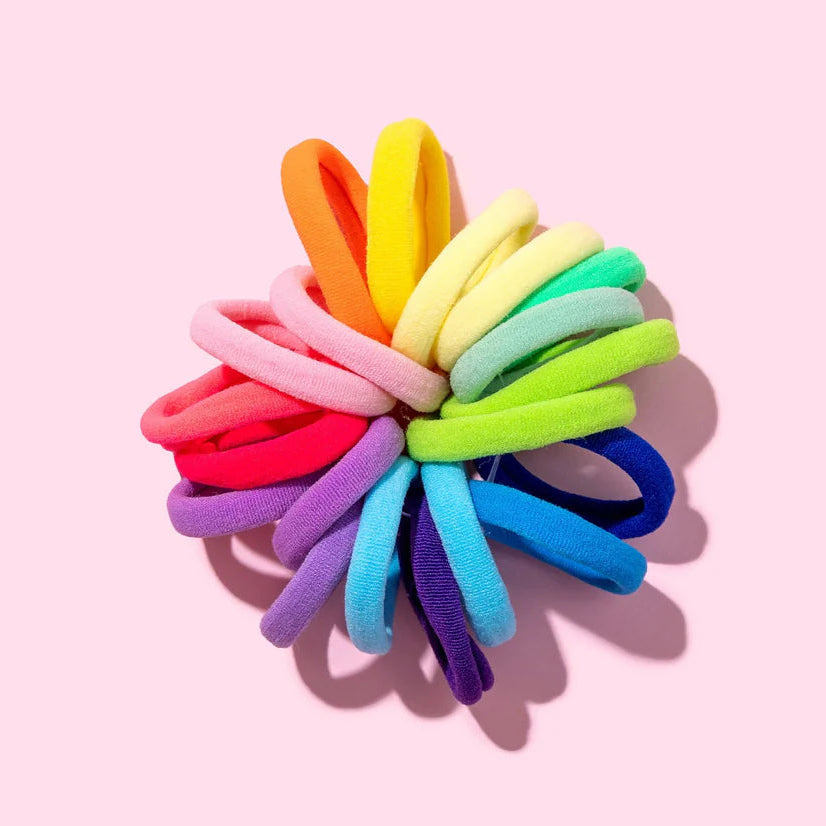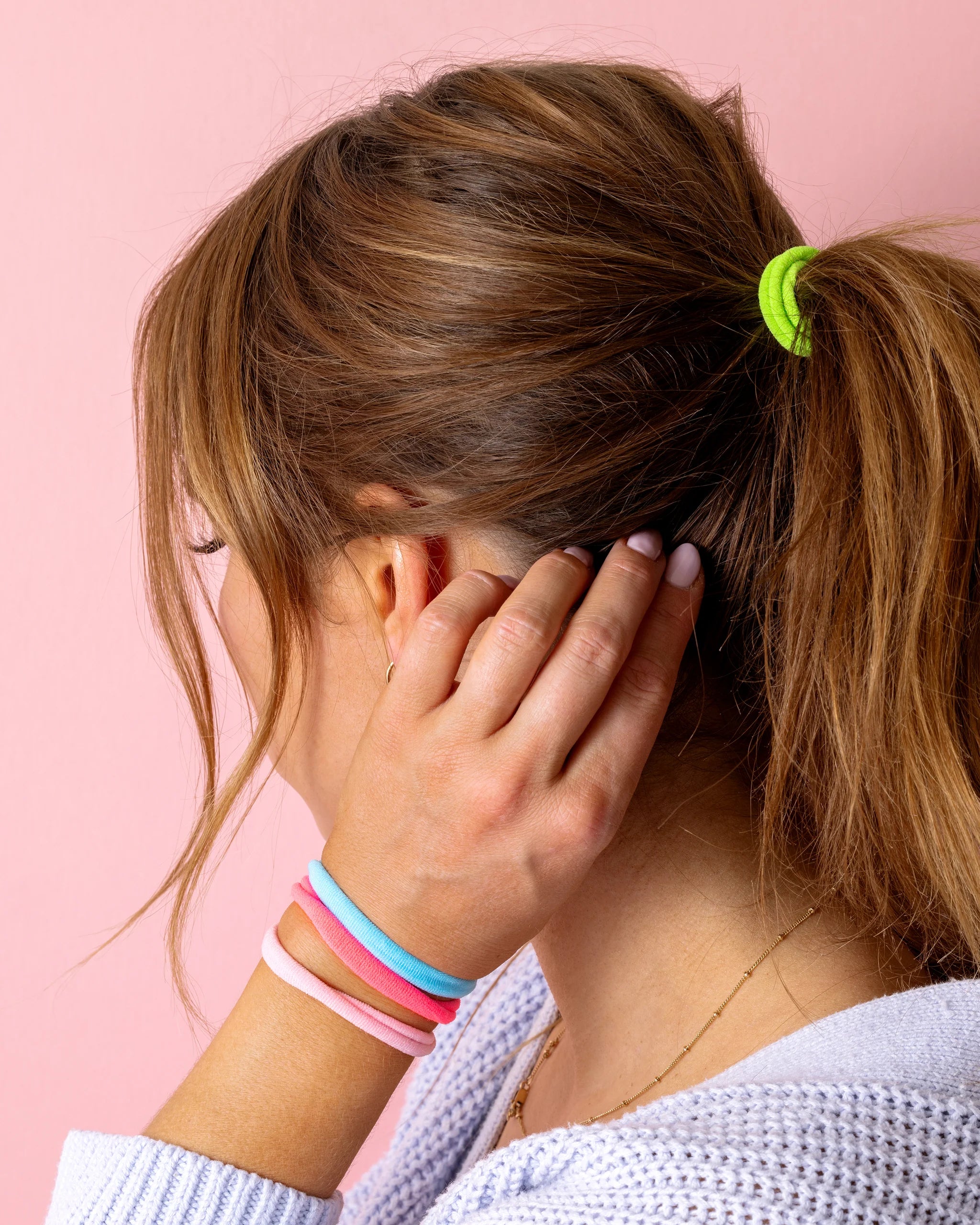 An easy add-on to a gift, our colorful hair ties are super cute tied to a notebook and pen set!