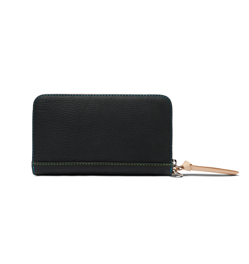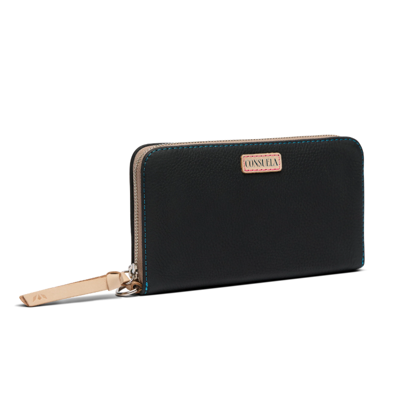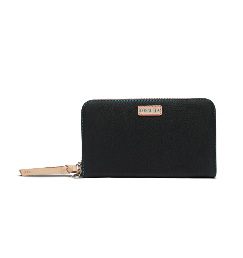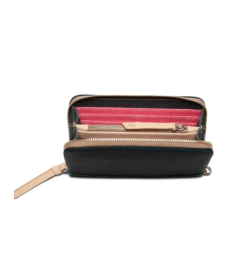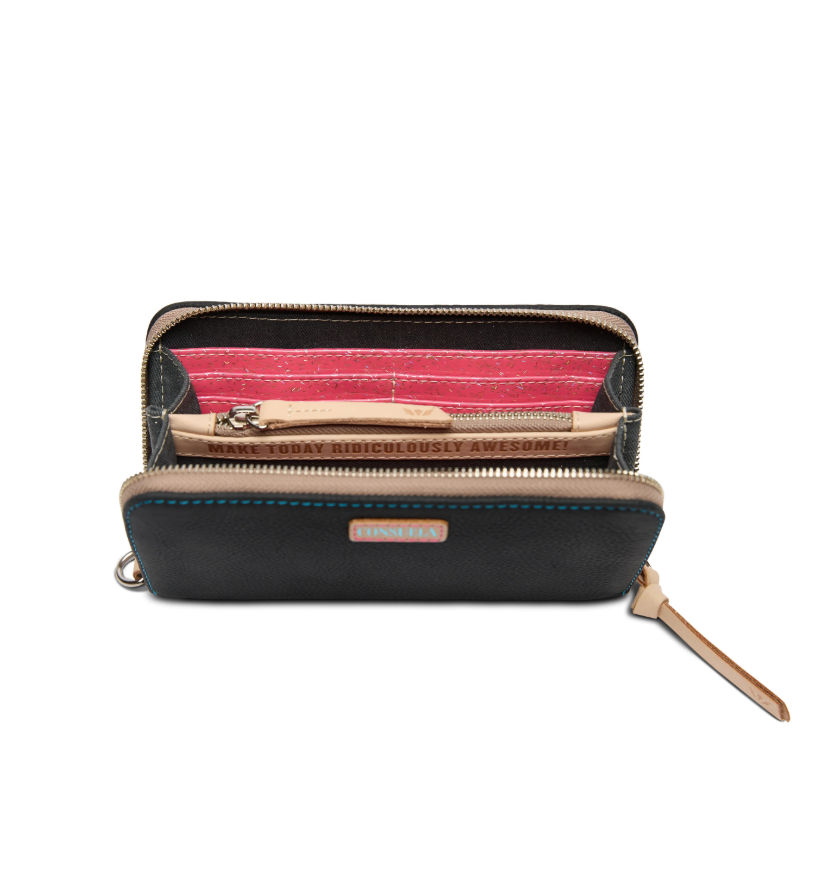Function and versatility in the palm of your hand. Our new Essential Wallet is a streamlined, large capacity wallet with tons of room for cards, cash, and receipts — plus a zippered center compartment for coins and keepsakes. We added a D-ring so you can easily clip it to any Consuela wristlet strap or anchor onto an inside lanyard for added security.