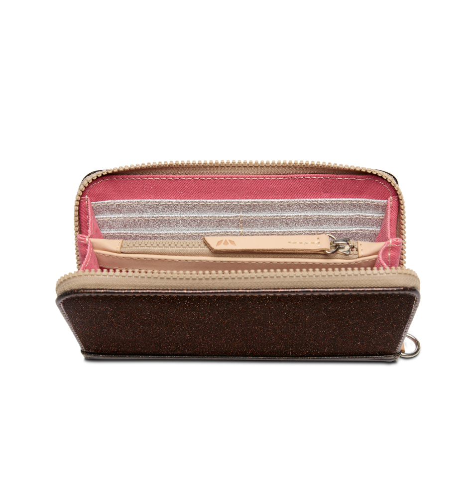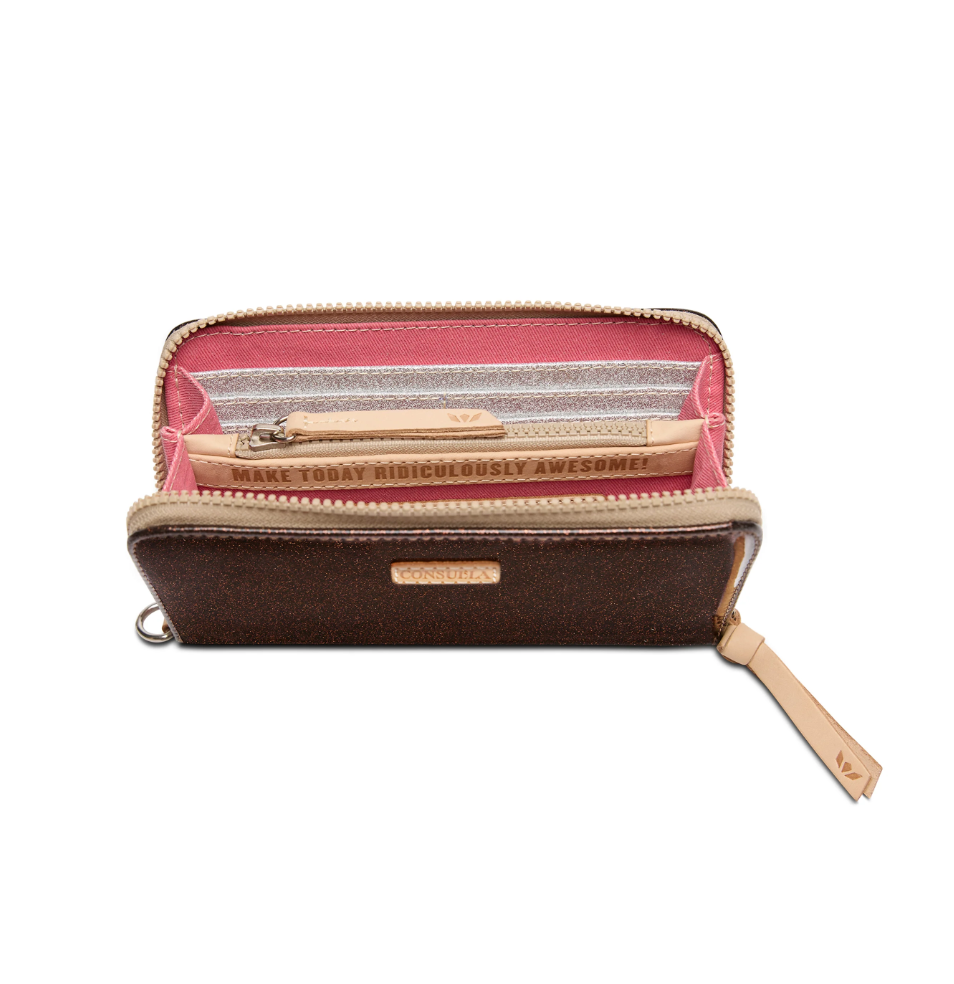 Function and versatility in the palm of your hand. Our new Essential Wallet is a streamlined, large capacity wallet with tons of room for cards, cash, and receipts — plus a zippered center compartment for coins and keepsakes. We added a D-ring so you can easily clip it to any Consuela wristlet strap or anchor onto an inside lanyard for added security.