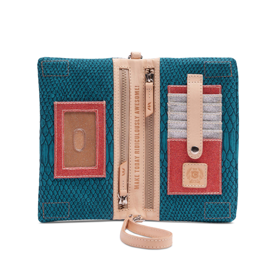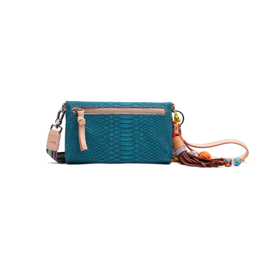 - Included detachable wristlet strap and adjustable woven crossbody strap