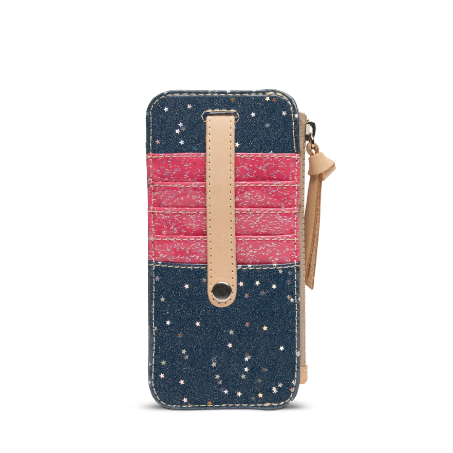 Keeping things light and easy, the card organizer is perfect for credit cards and folded bills. This colorful wallet’s snap-closure and zipper compartment provides security while you take on the day.