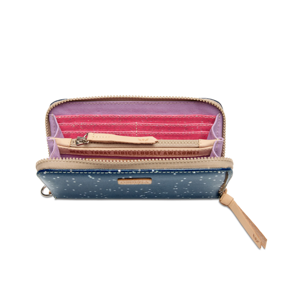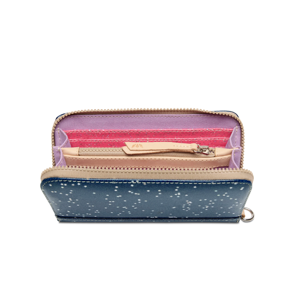 Function and versatility in the palm of your hand. Our new Essential Wallet is a streamlined, large capacity wallet with tons of room for cards, cash, and receipts — plus a zippered center compartment for coins and keepsakes. We added a D-ring so you can easily clip it to any Consuela wristlet strap or anchor onto an inside lanyard for added security.