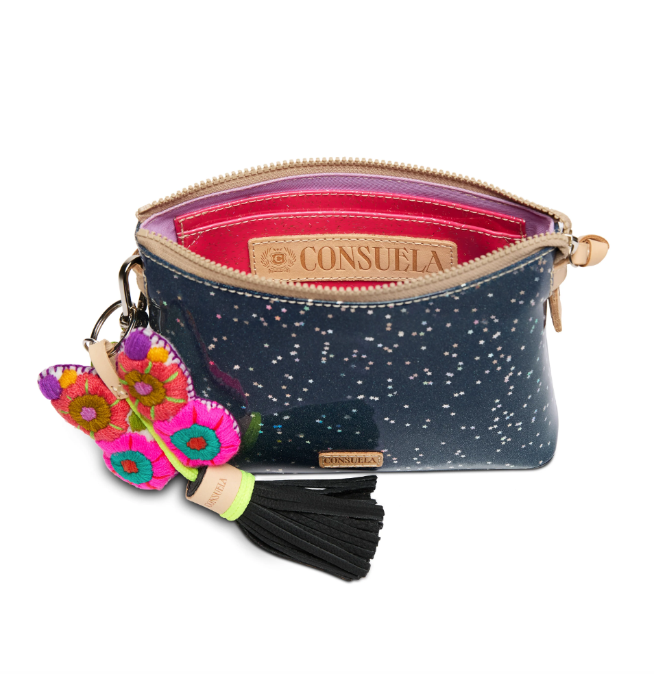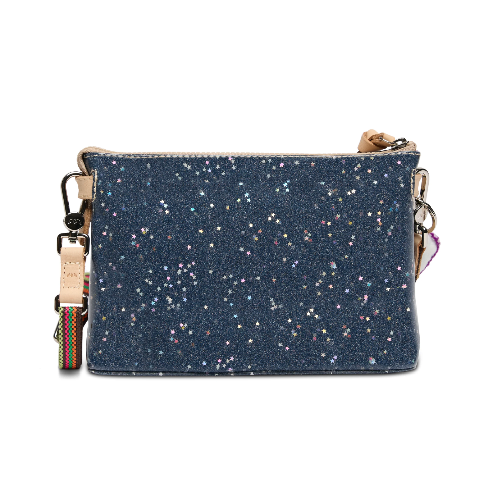 - 8 ¼" (W at the base), 9 ¼” (W at the top) x 5 ¾” (H) x 2" (D), 14 ½”-27 ½” adjustable crossbody strap drop