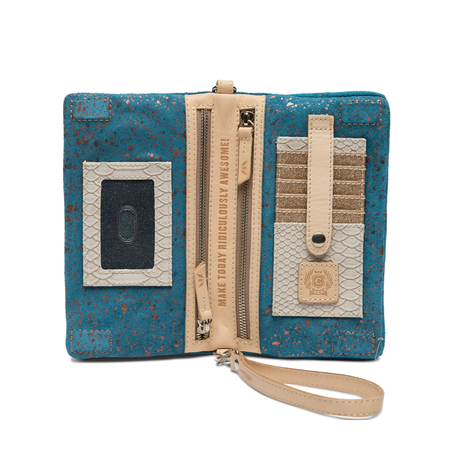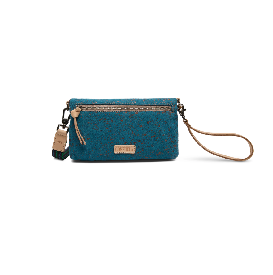 - Included detachable wristlet strap and adjustable woven crossbody strap