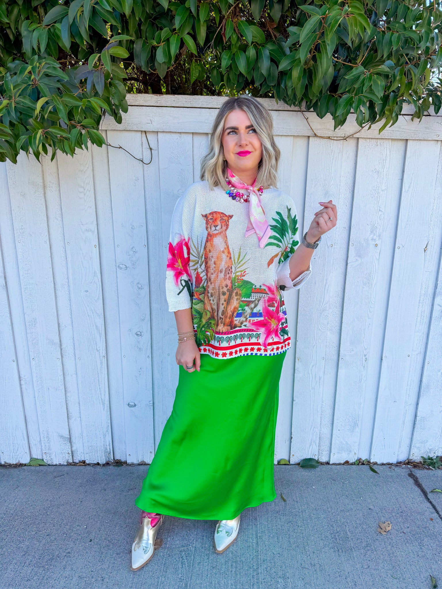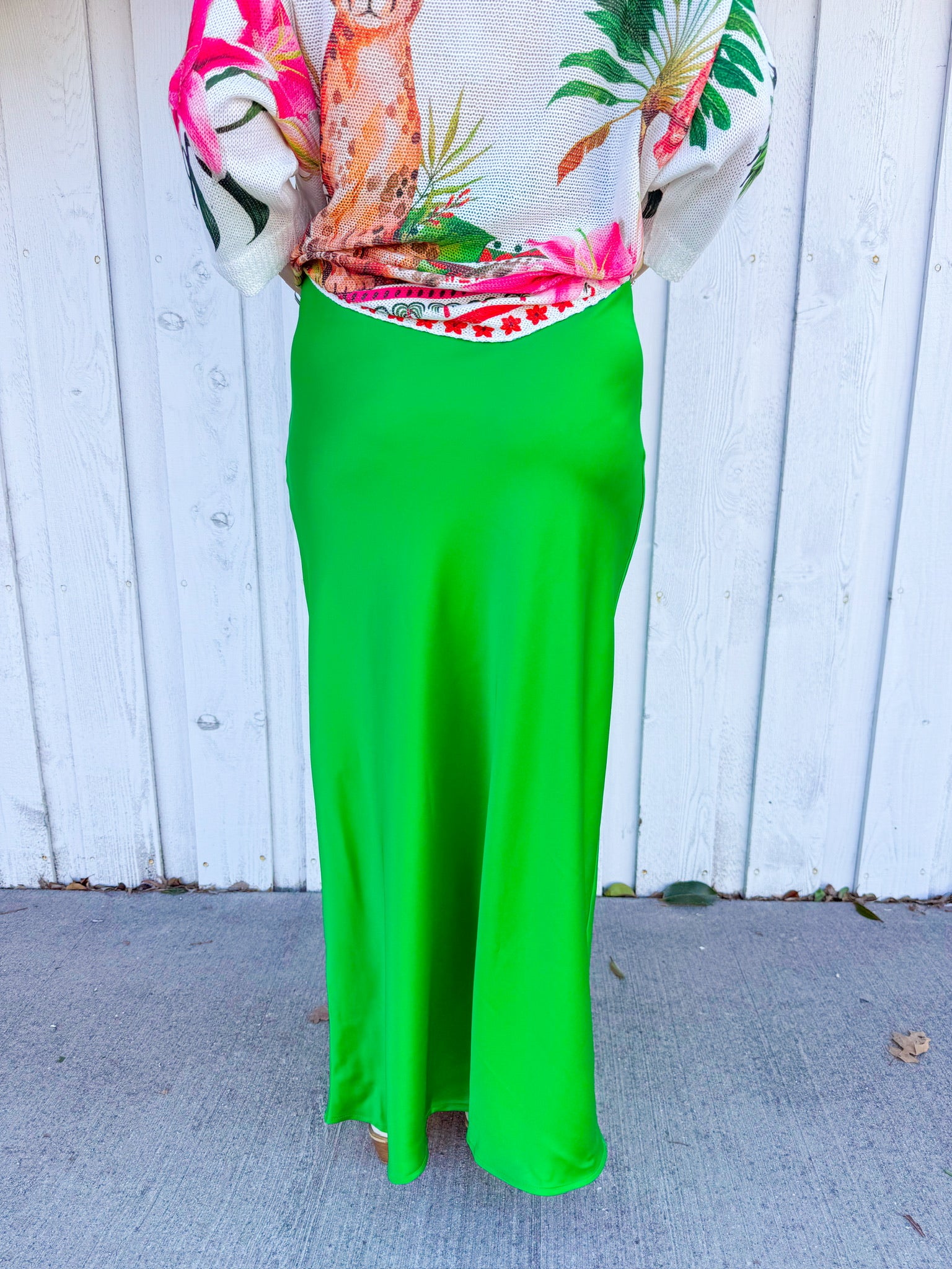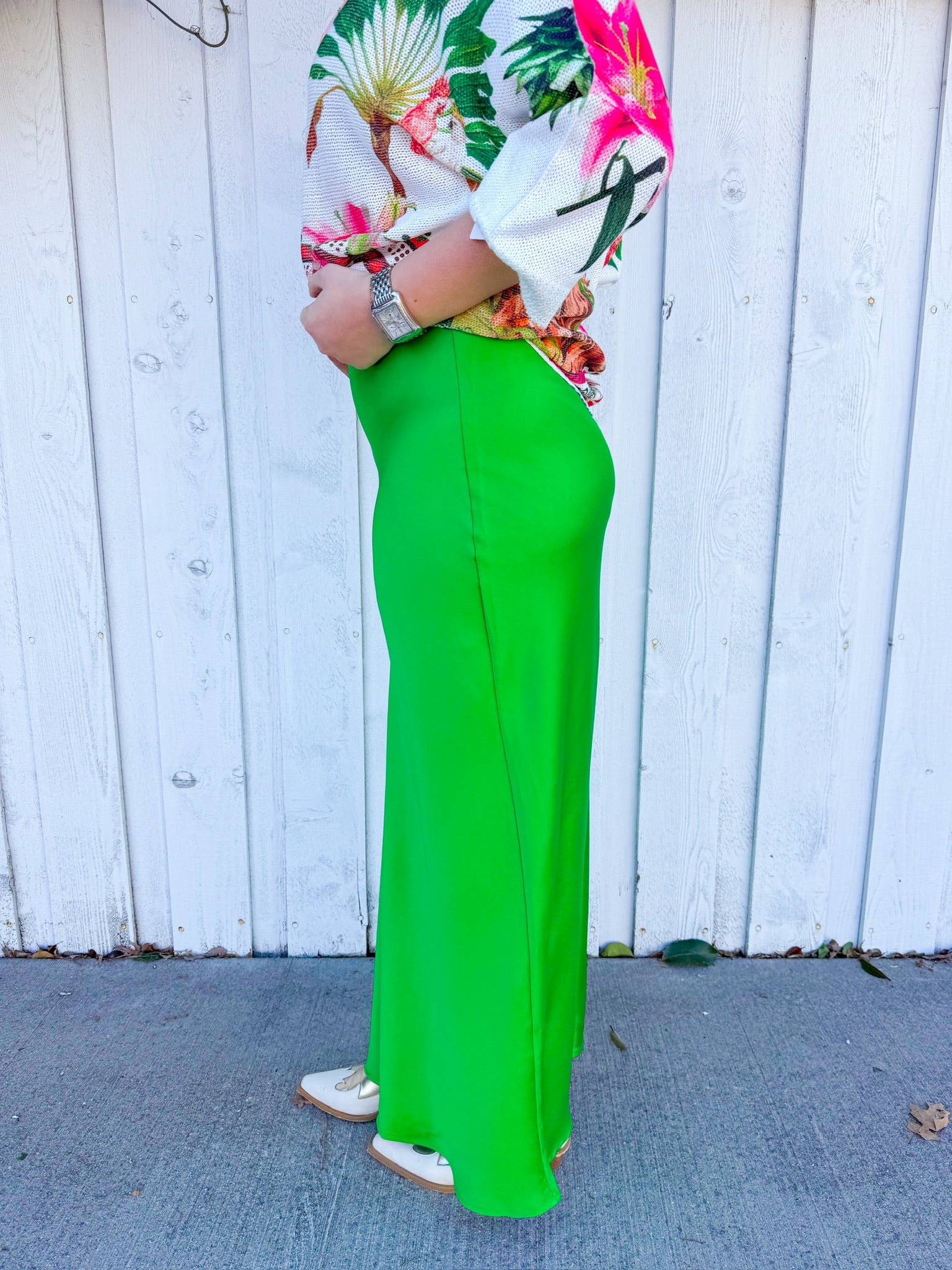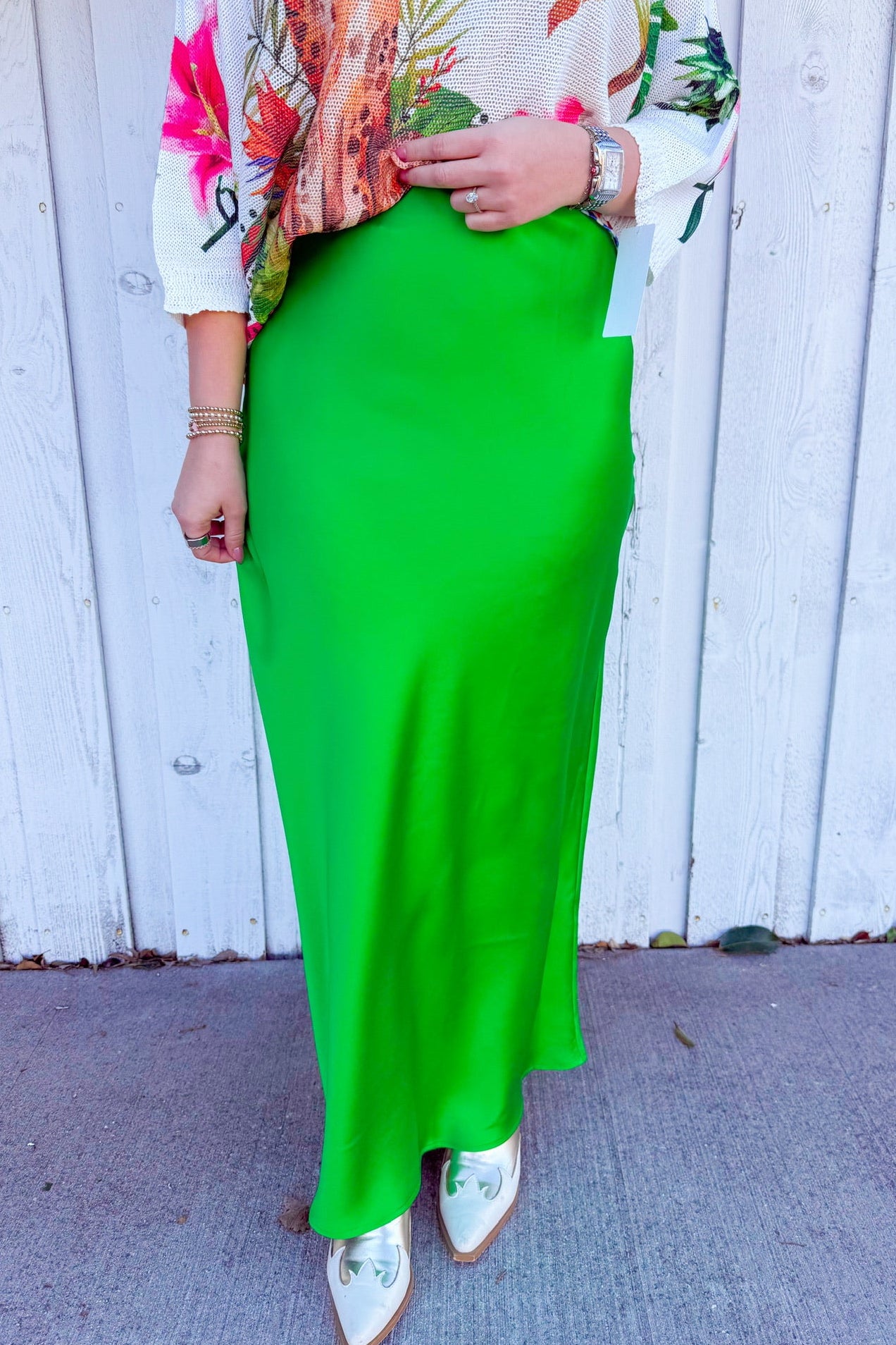 Slip into effortless elegance with this green silky maxi skirt. Dress it up with heels and jewelry or keep it casual with sneakers and a tee.