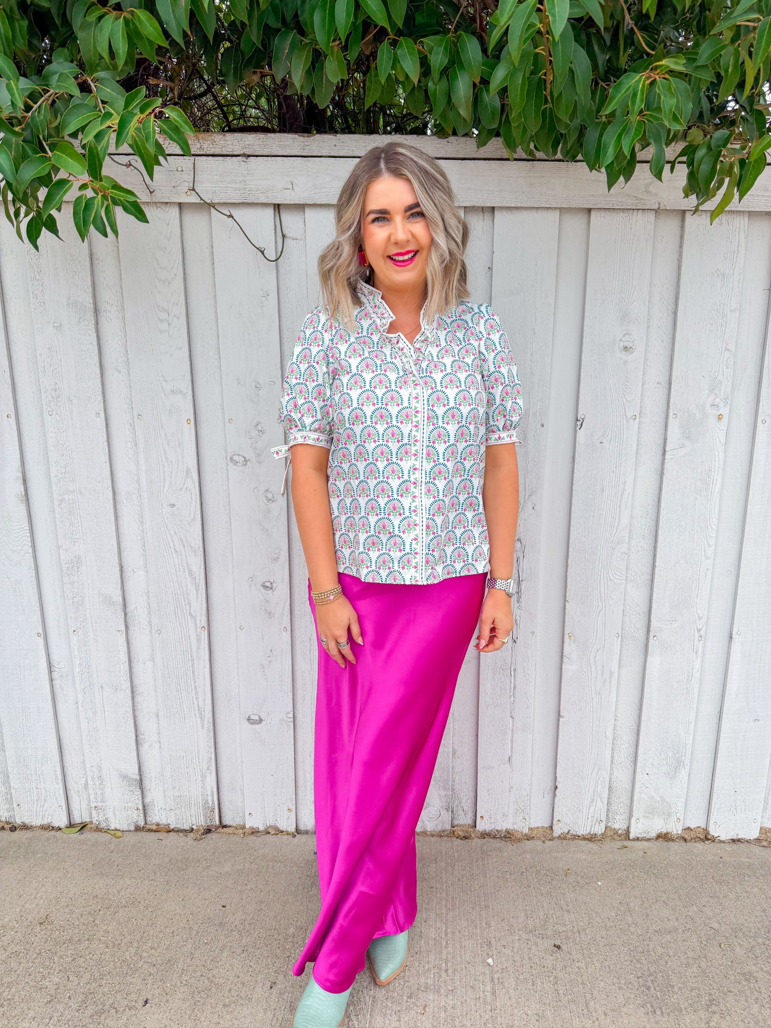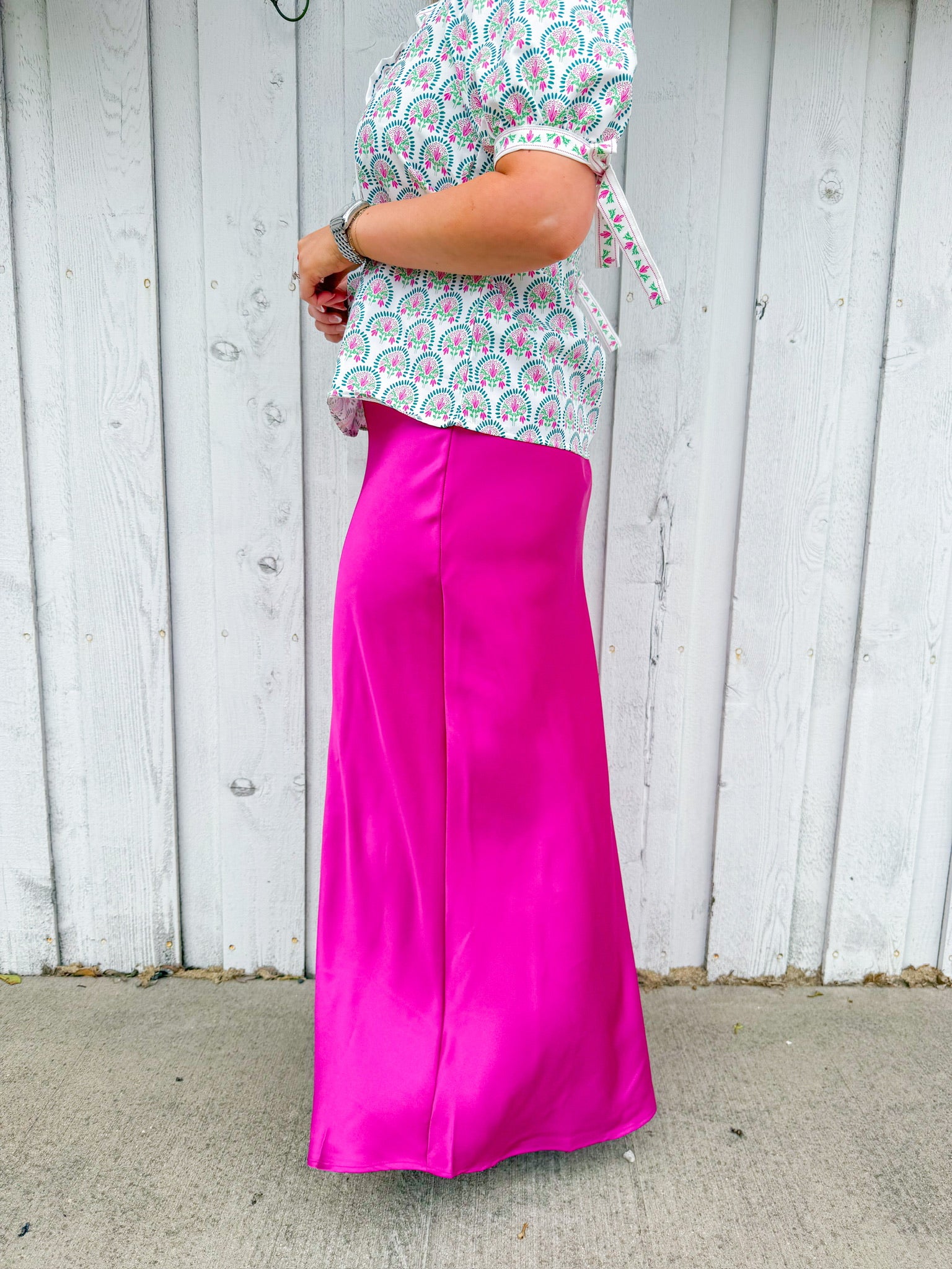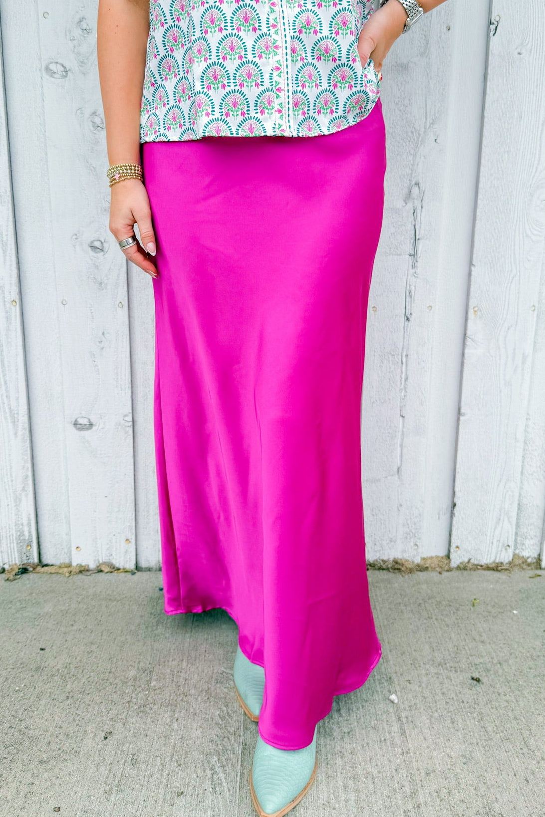 Slip into effortless elegance with this green silky maxi skirt. Dress it up with heels and jewelry or keep it casual with sneakers and a tee.