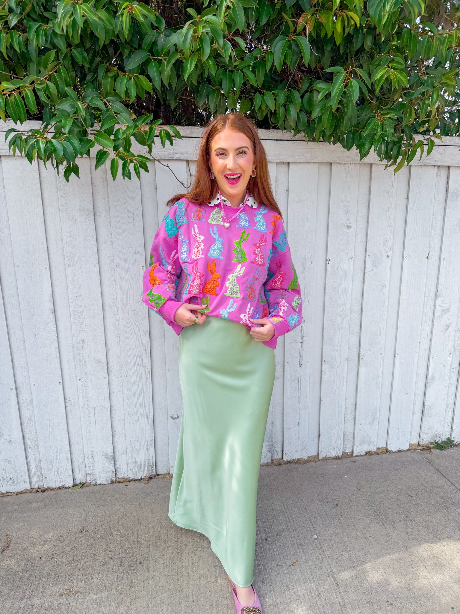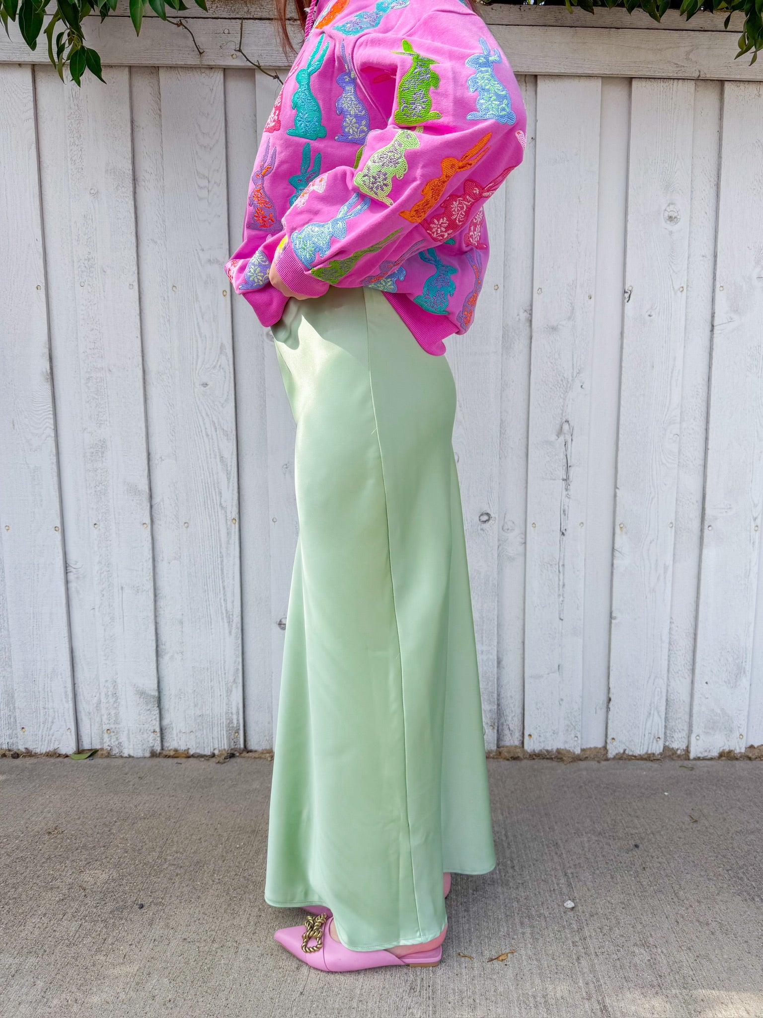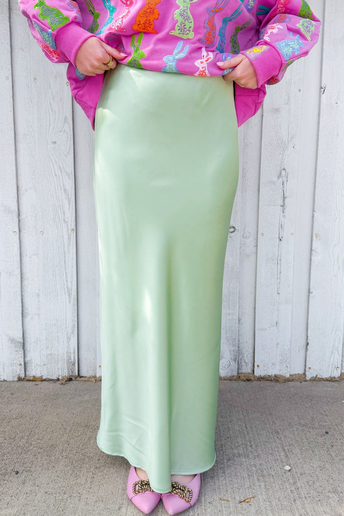Slip into effortless elegance with this green silky maxi skirt. Dress it up with heels and jewelry or keep it casual with sneakers and a tee.