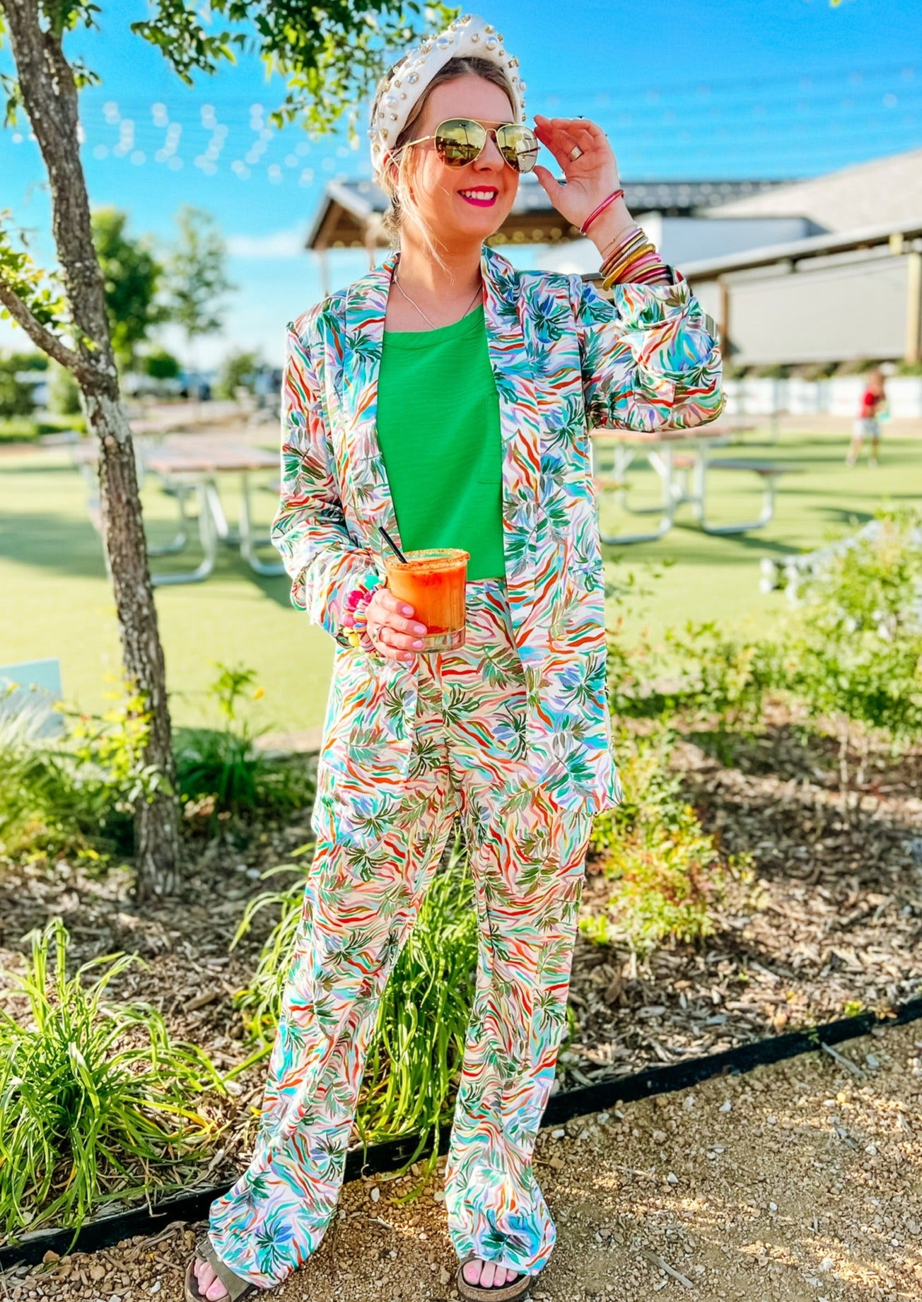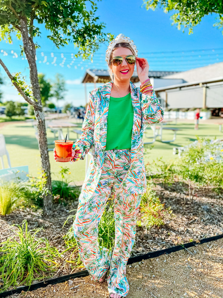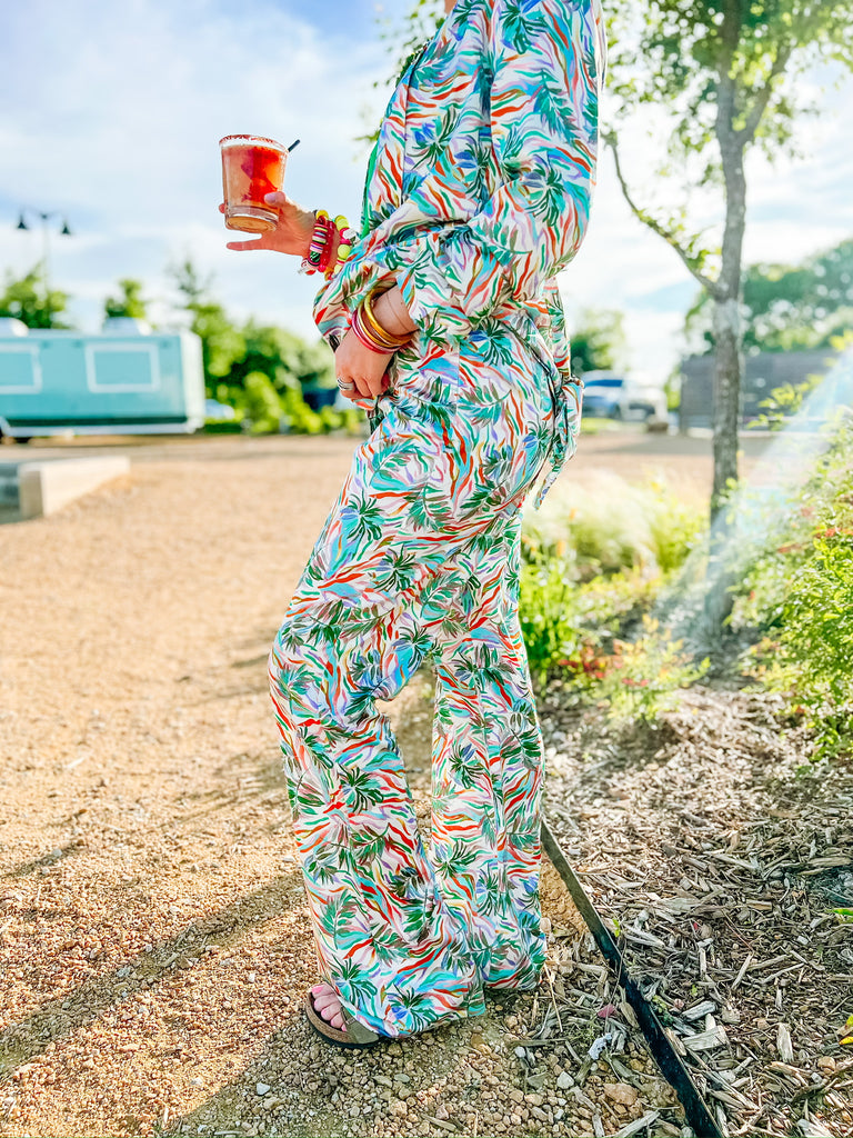 Are you ready to set the style for a sizzling summer? Look no further than the Coral Gables Pants! With a wide leg design, these pants are the perfect piece to showcase your bold and daring style. Taking influences from tropical island days, these eye-catching pants feature a vibrant print befitting of shoreside fun. Ready to up your outfit game even more? Pair with the matching blazer to create an unforgettable combination - you'll be slaying in high-fashion waves in no time! So don't forget - splash into the hottest fashion waves this summer season with Coral Gables Pants.