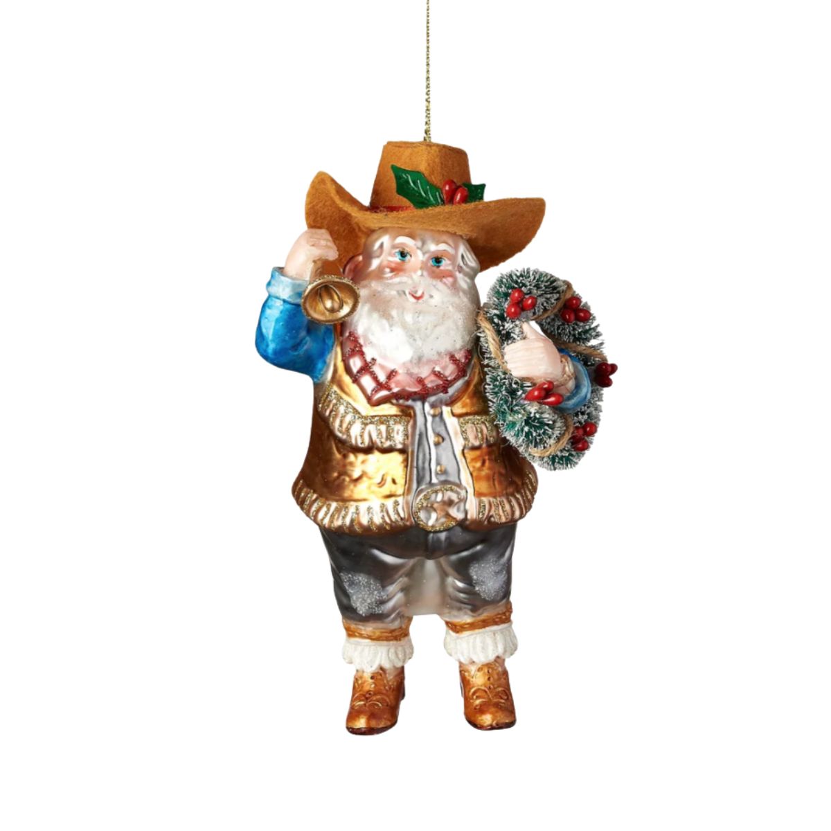 Saddle up for holiday cheer with this charming Cowboy Santa Ornament! Featuring a jolly Santa decked out in a classic brown vest and cowboy style, this festive piece brings a playful Western twist to your Christmas tree.